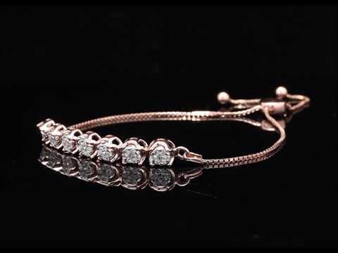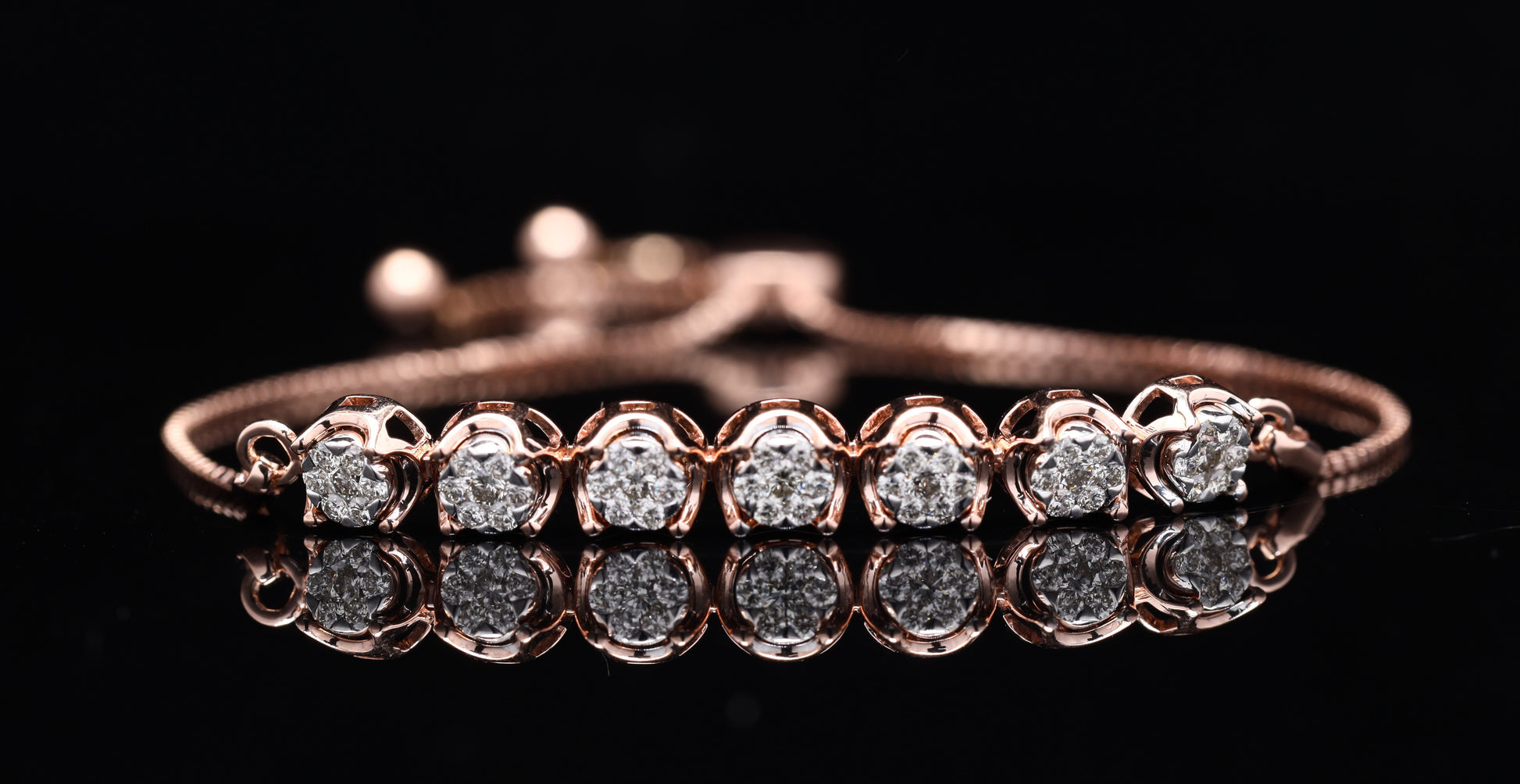 Rose gold diamond floral cluster bolo bracelet with slider closure.