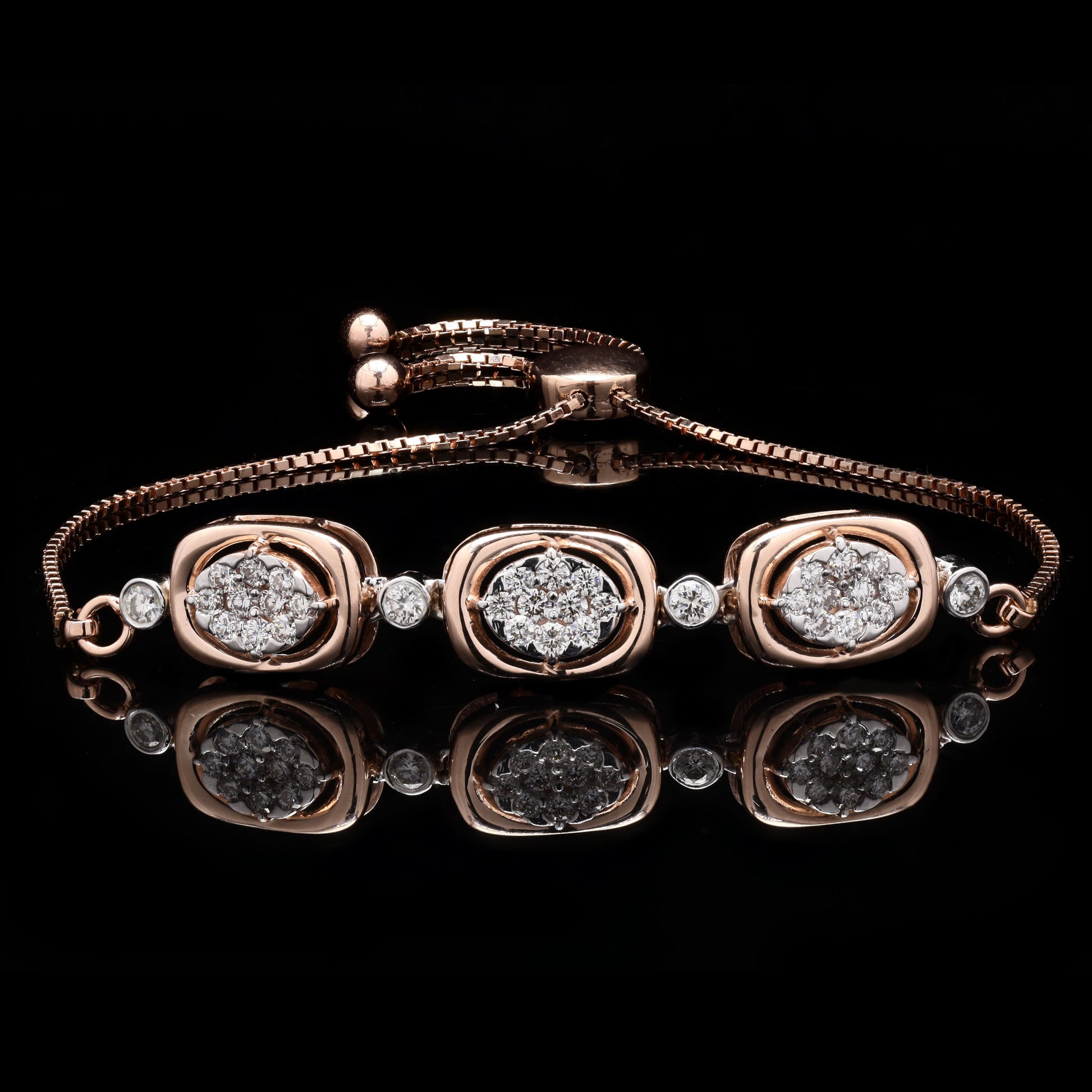 Elaborate rose gold diamond bracelet featuring three bezel-set pavé clusters and a bolo closure.