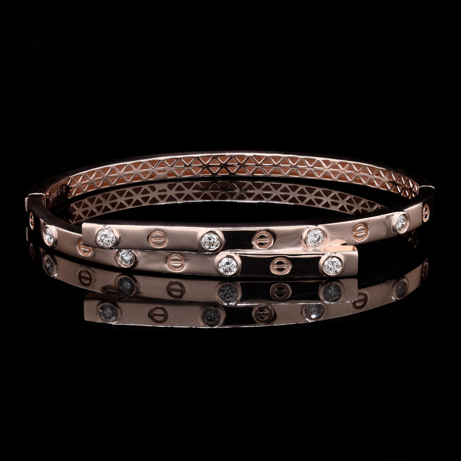 Elegant rose-gold bracelet with diamonds and screw motifs.