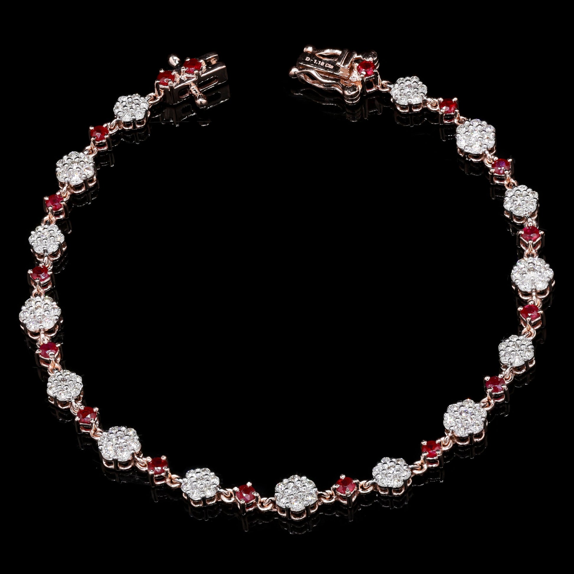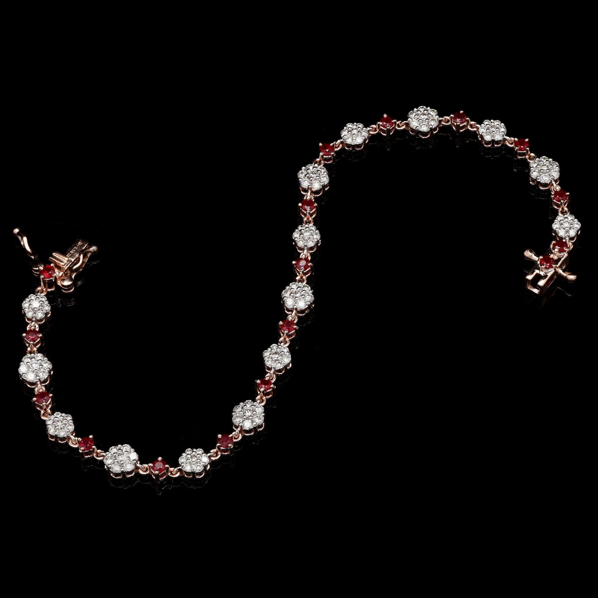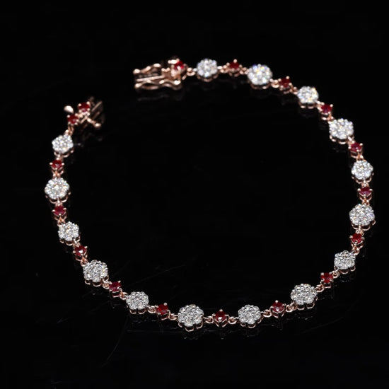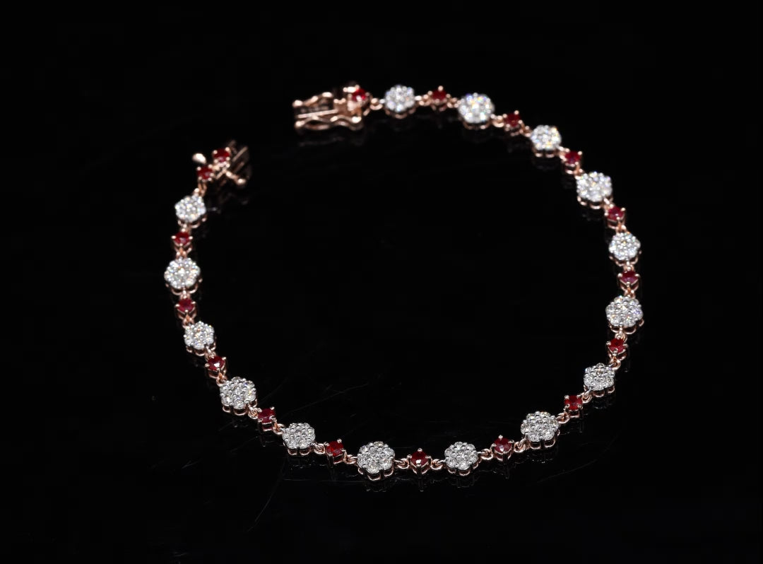 Intricate rose gold link bracelet, featuring alternating diamond clusters and ruby accents.