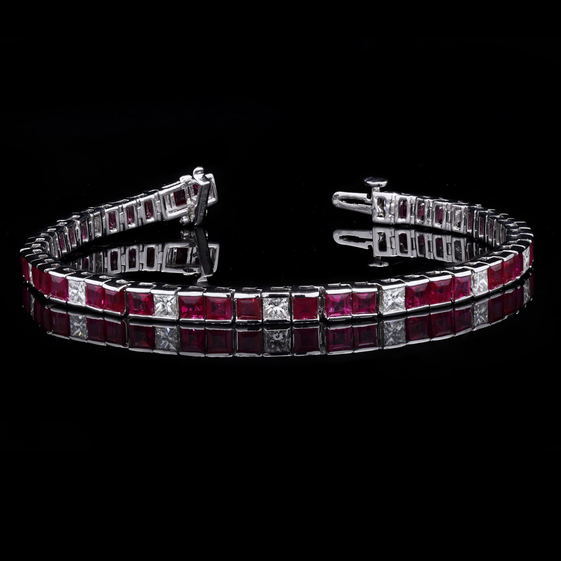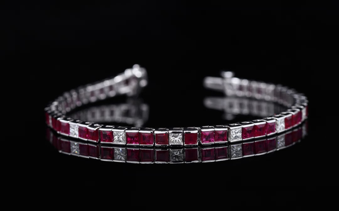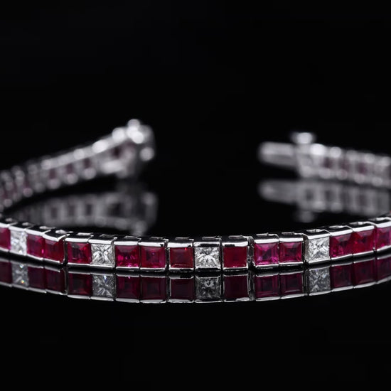 Elegant dual-row white gold bracelet featuring square-cut rubies interspersed with diamonds.
