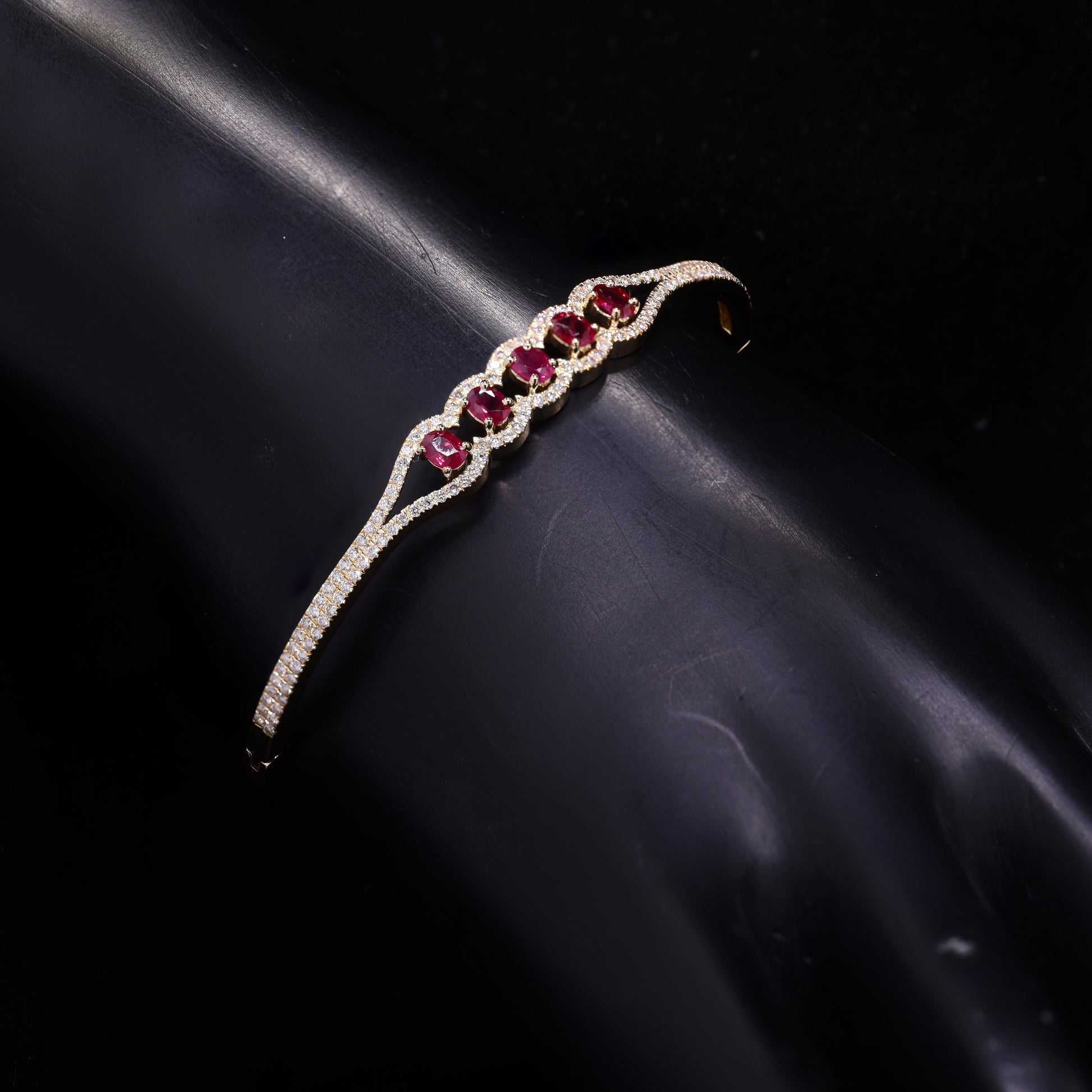 Magnificent yellow gold bangle featuring five oval rubies amidst a pave diamond wave pattern.