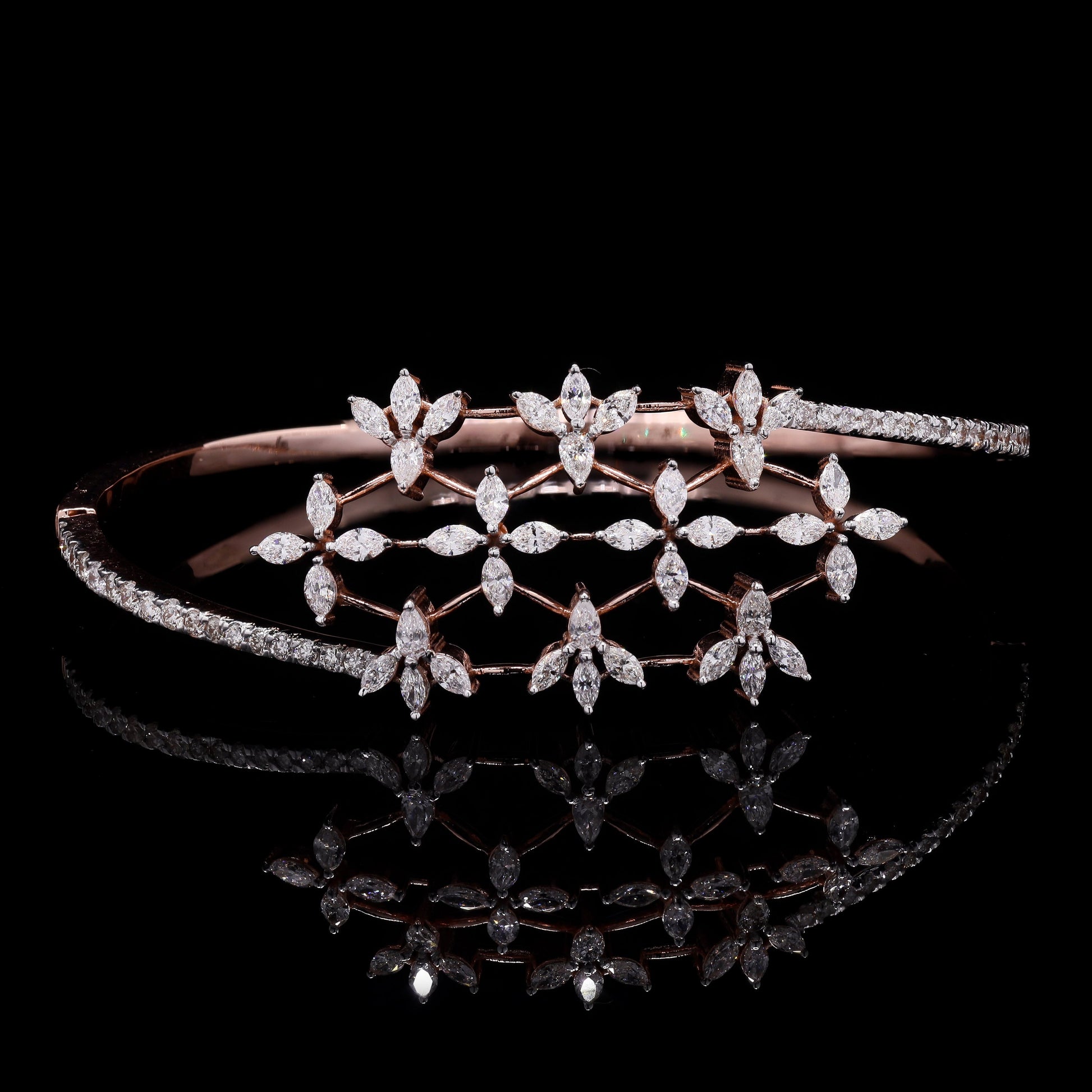Rose gold diamond cuff bracelet with marquise-cut floral clusters.