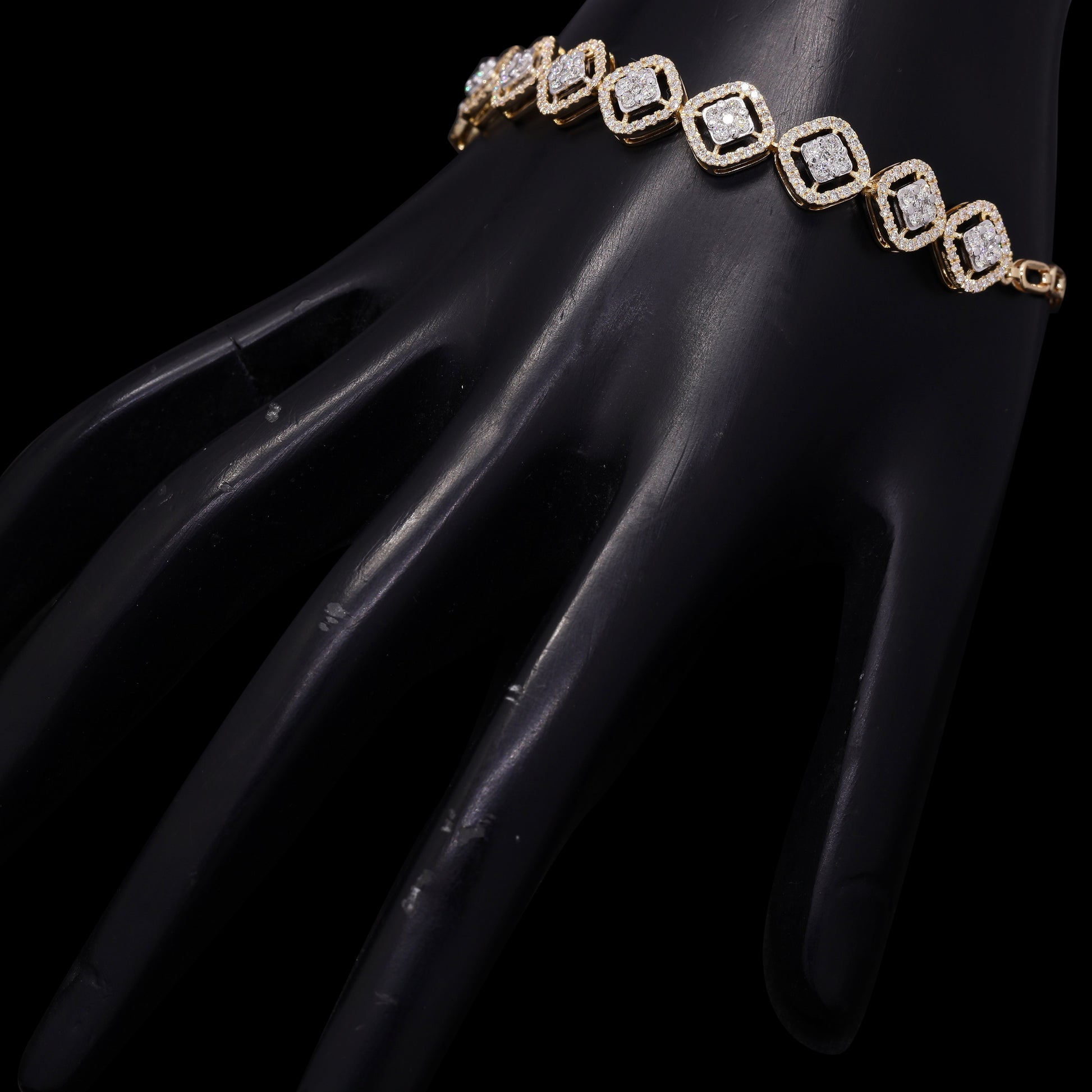Gold and diamond link bracelet with square clusters in diamond-shaped frames.