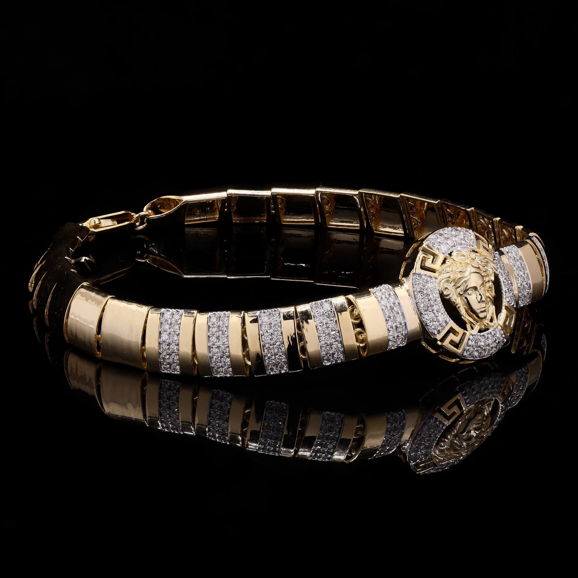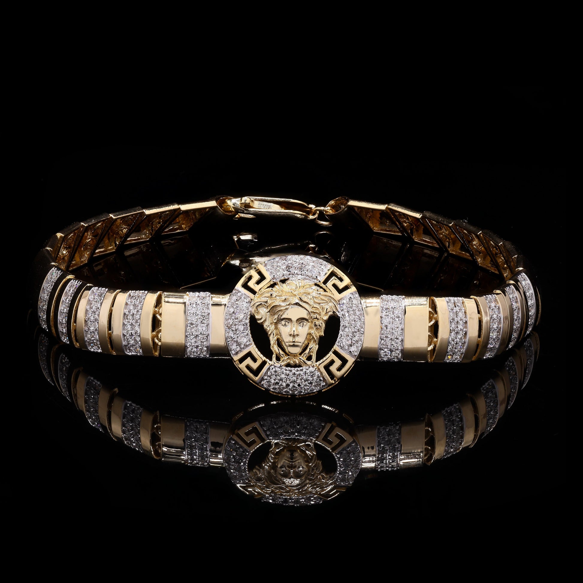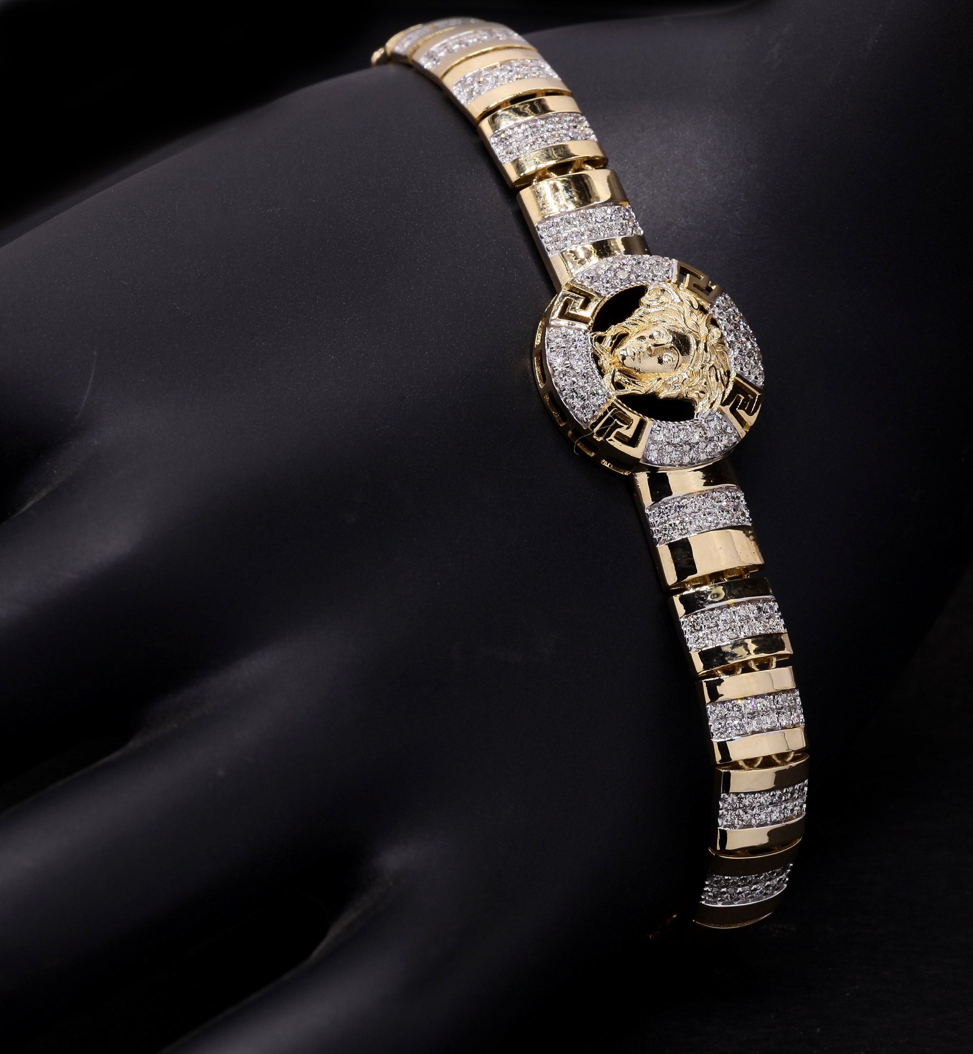 Versace-style gold/diamond Medusa head bracelet.