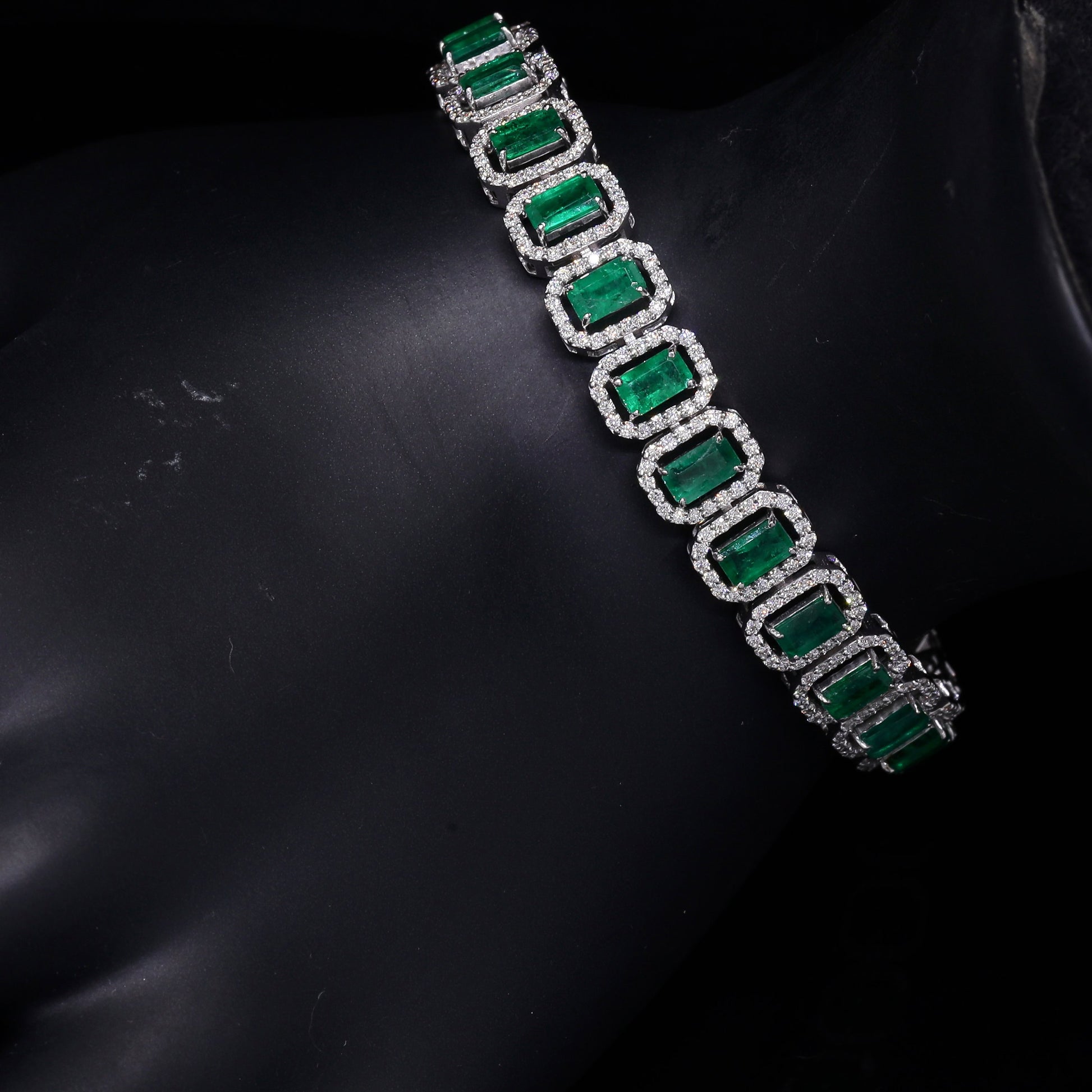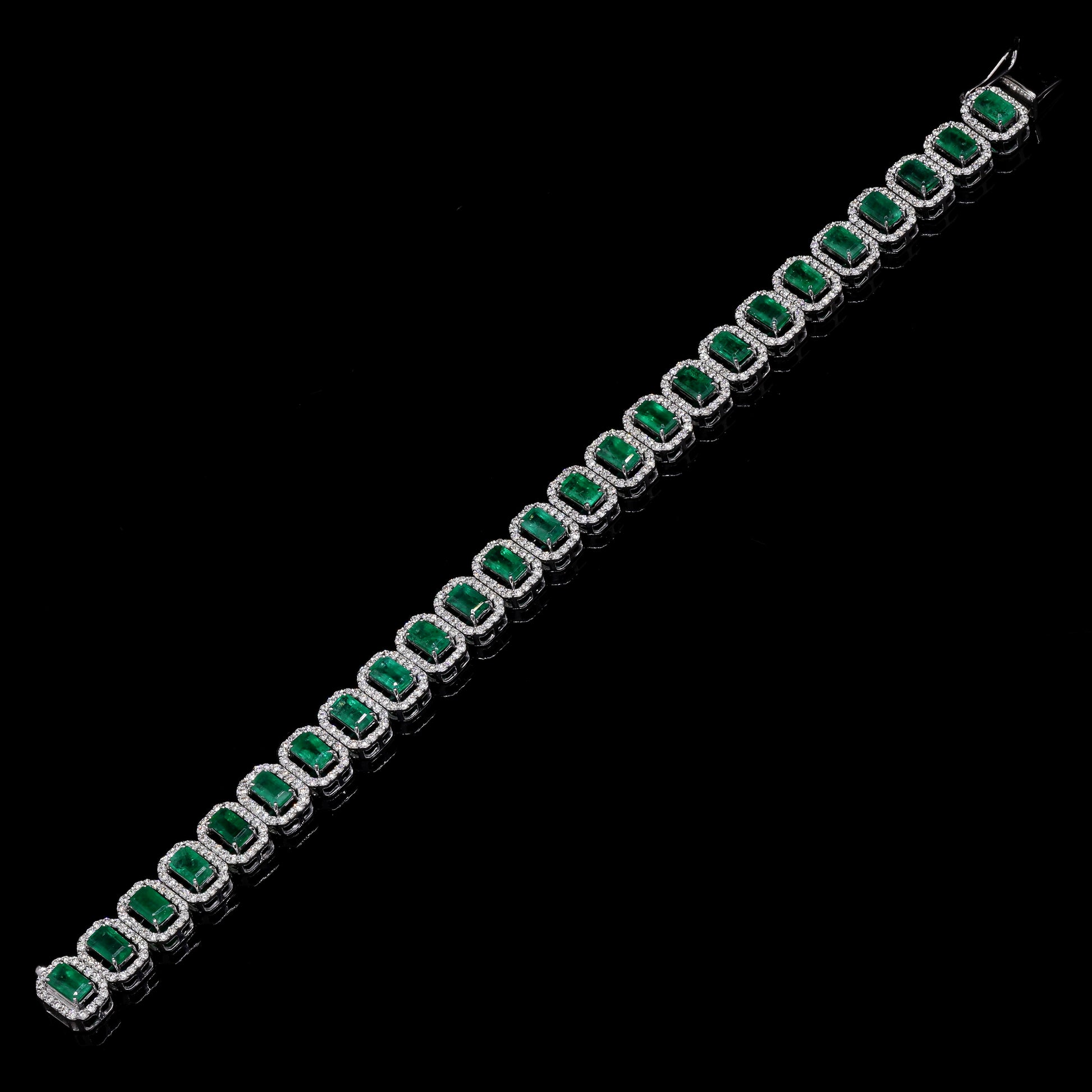 Emerald-cut emerald and diamond halo bracelet.