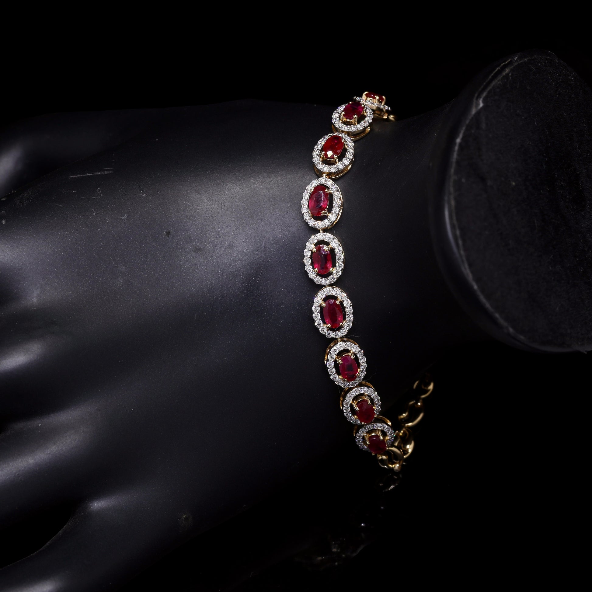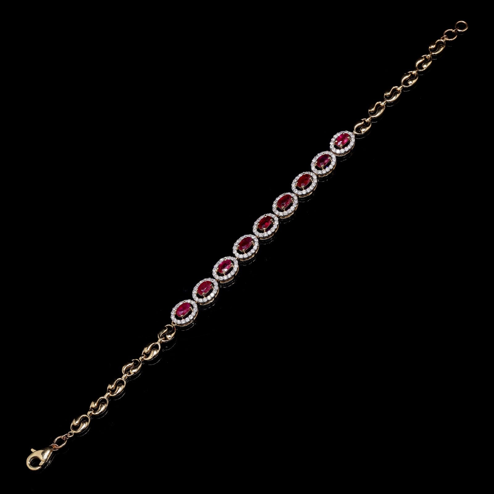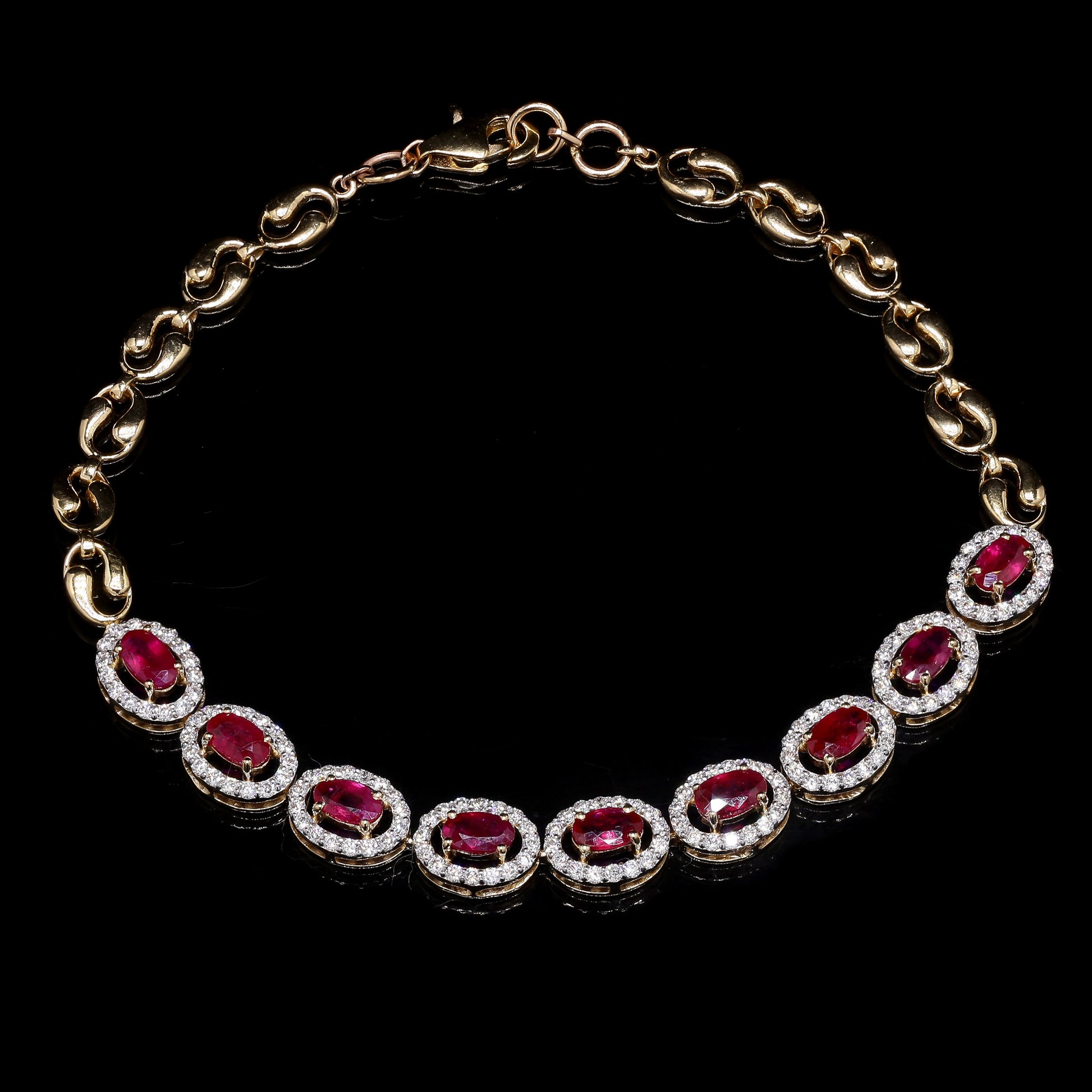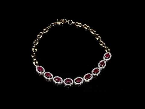 Luxury gold bracelet with oval rubies and diamond halos.