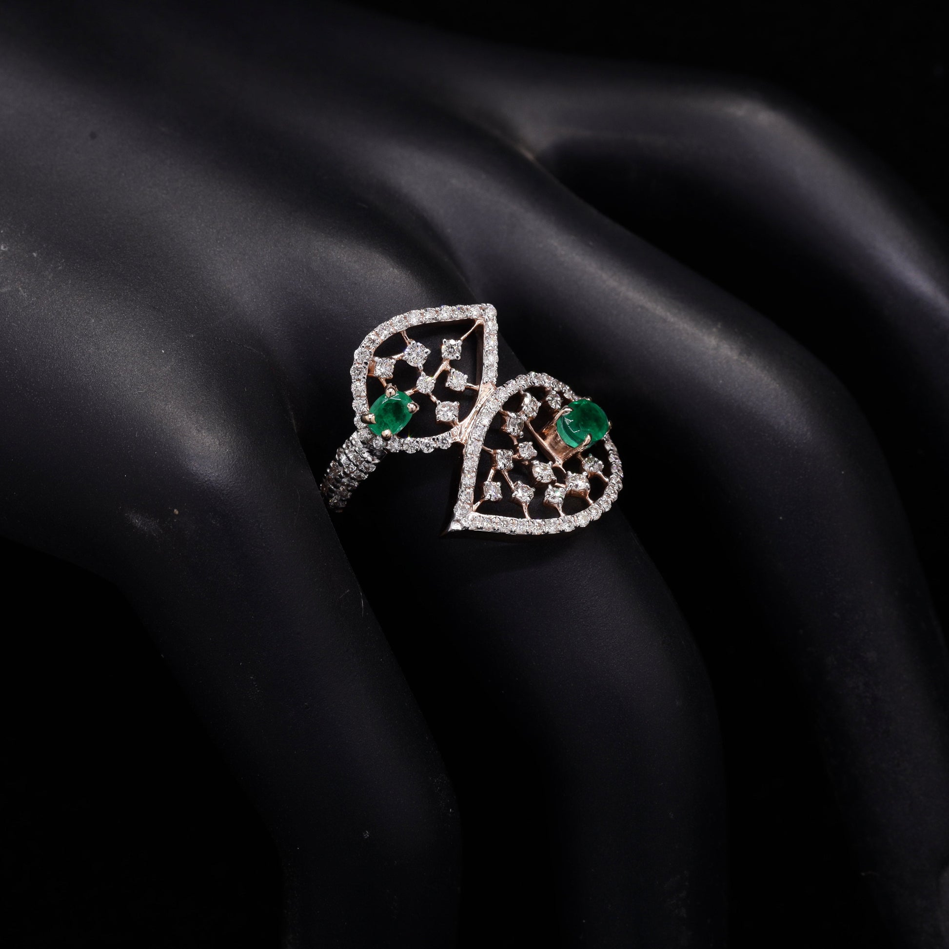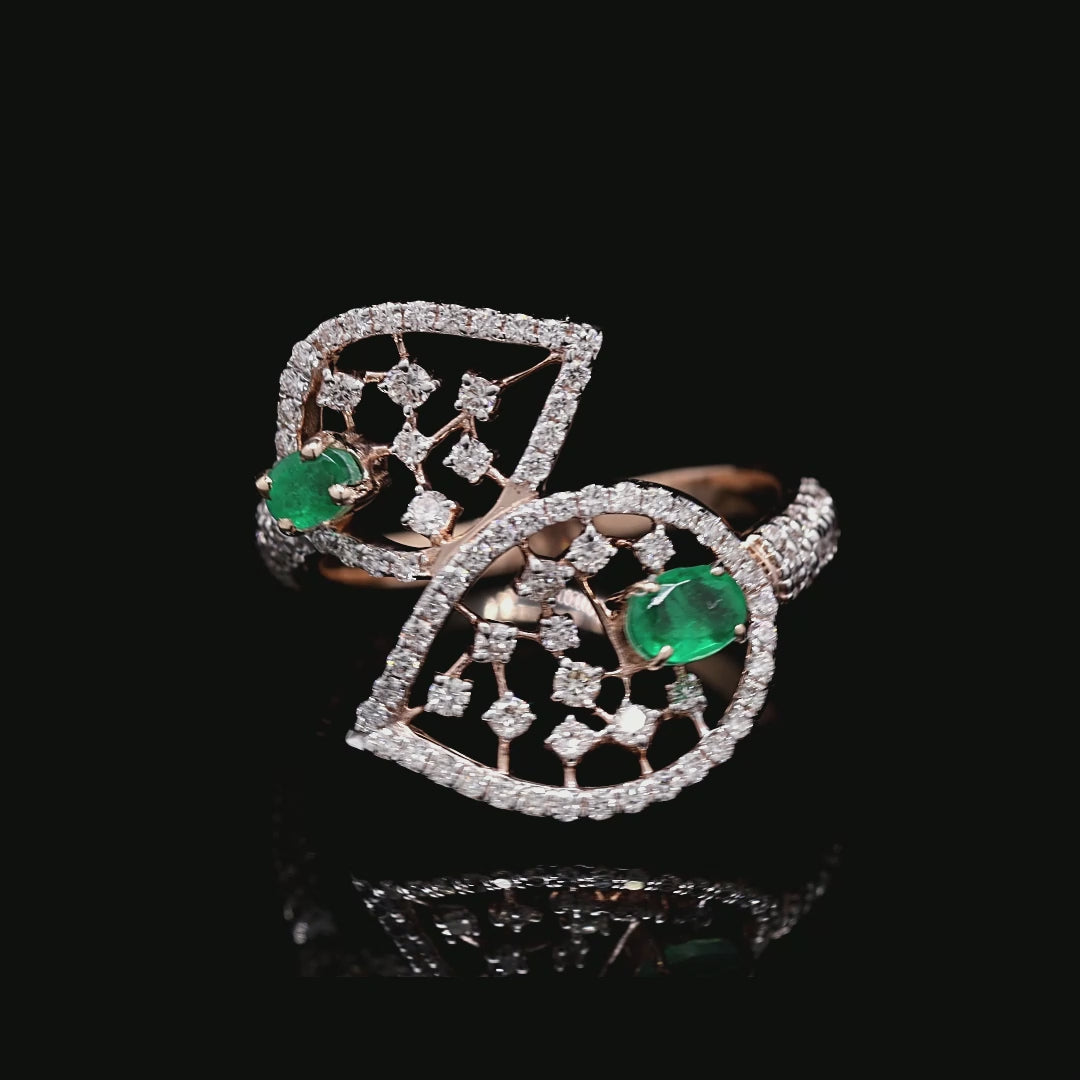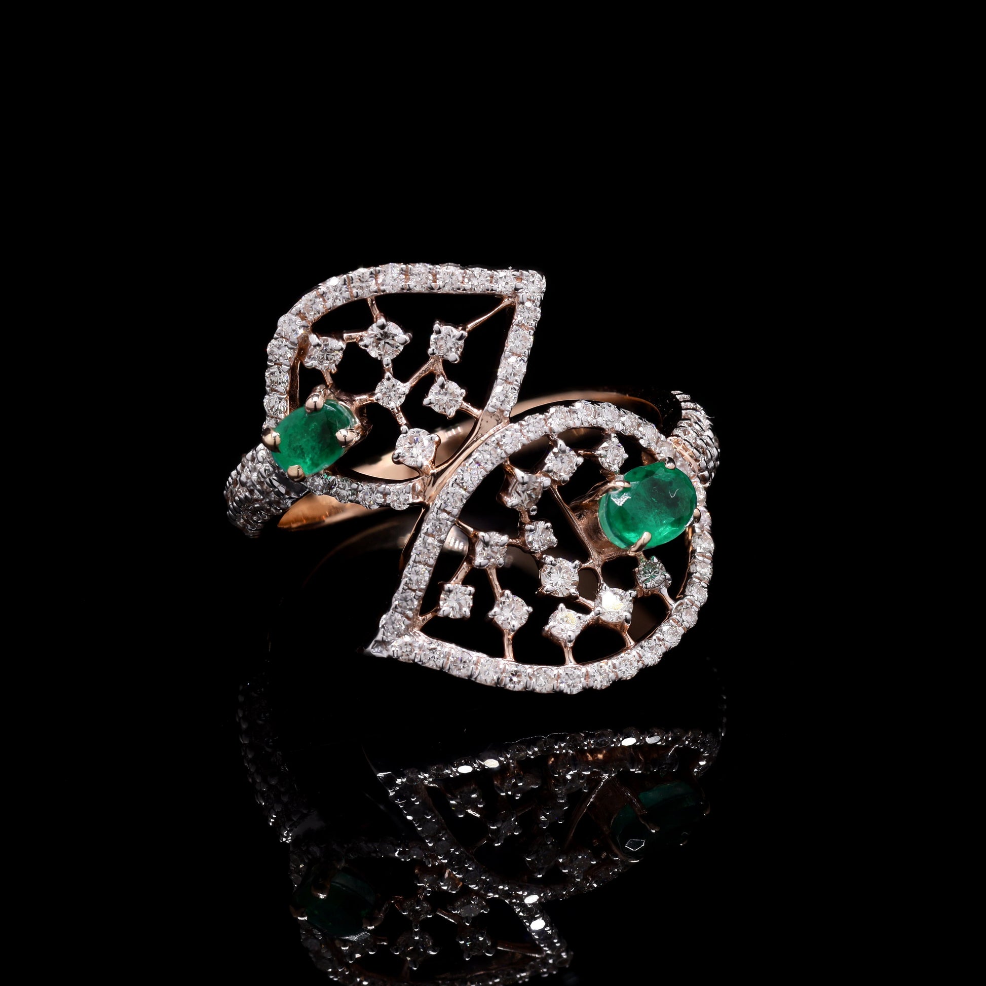 Emerald and diamond pavé leaf bypass ring in rose gold.