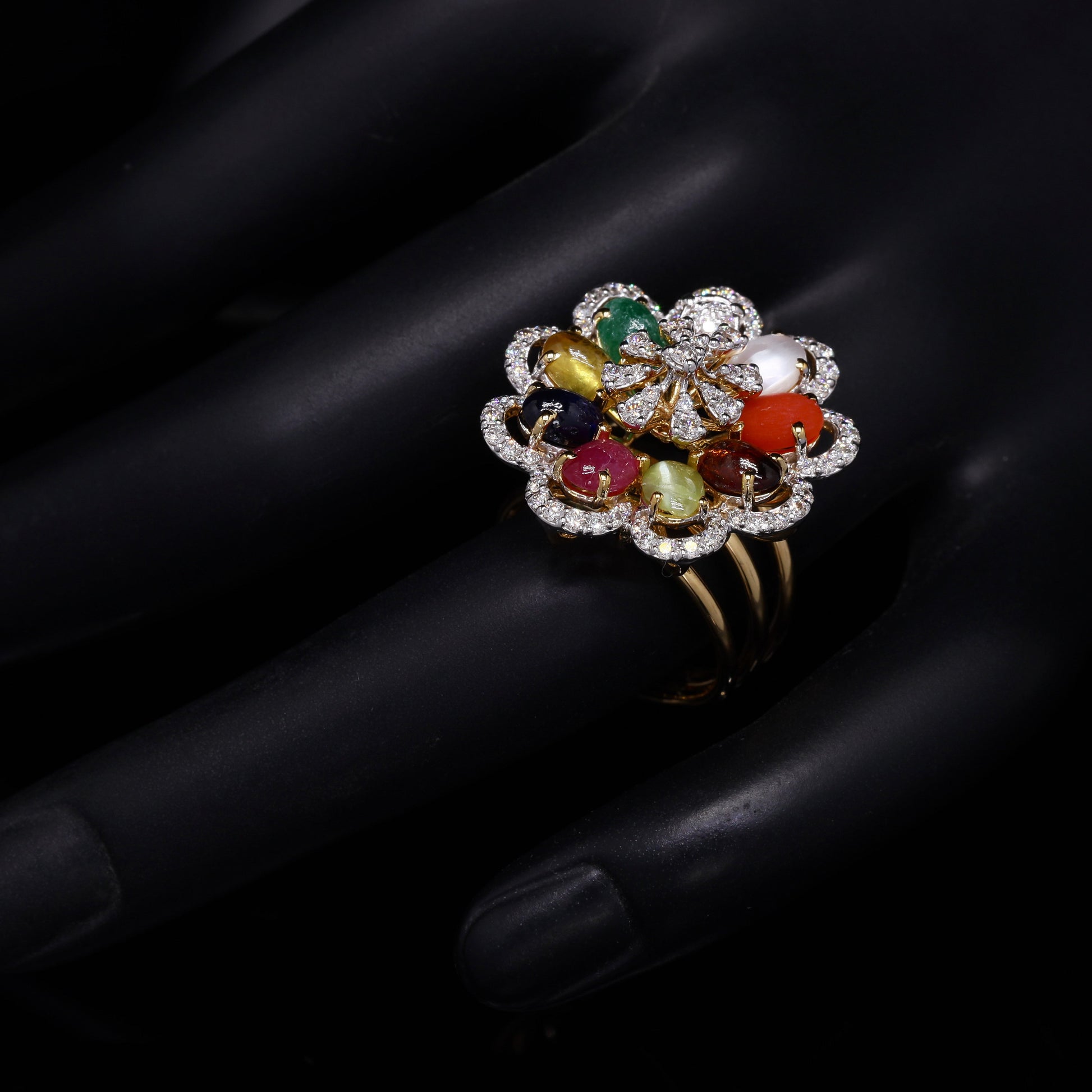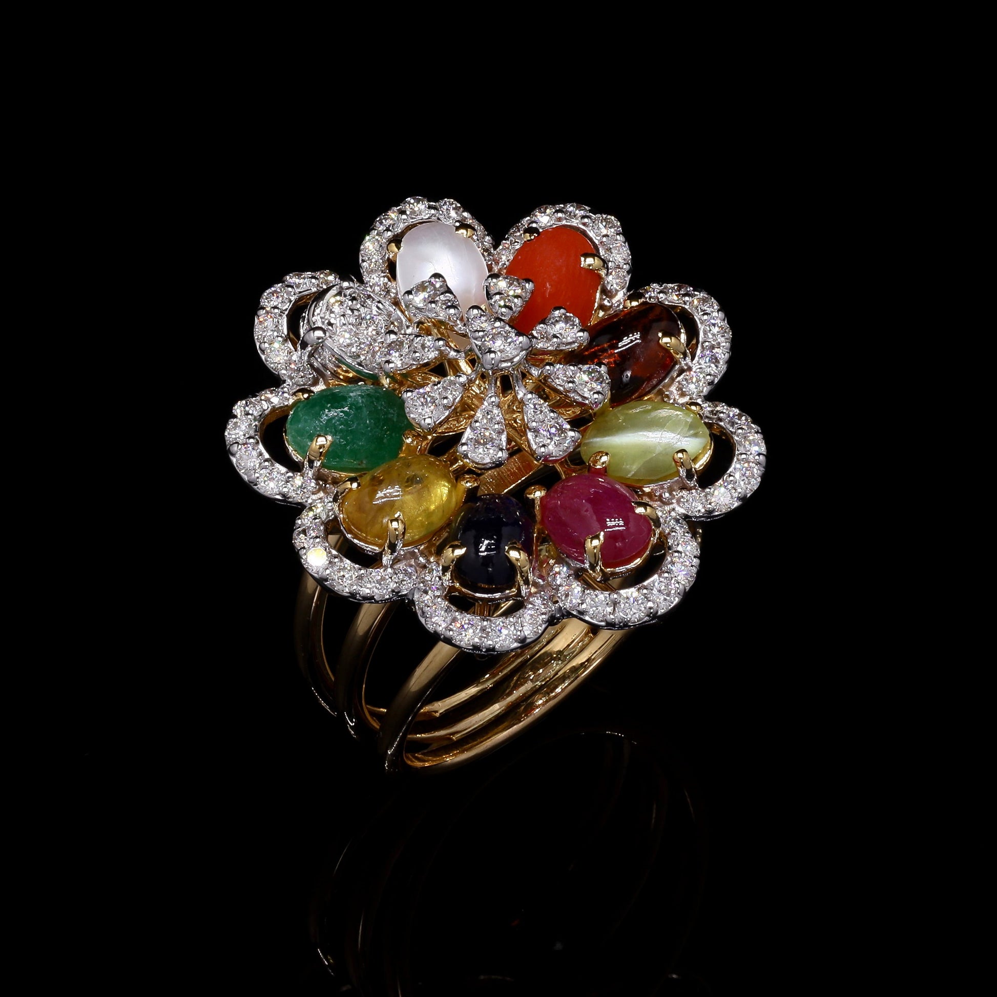 Multigem cabochon and diamond flower cocktail ring in gold.