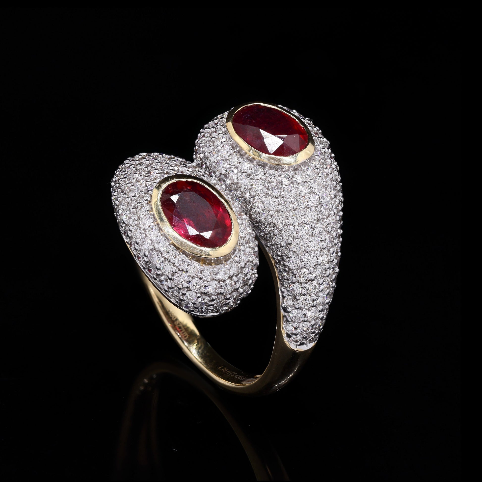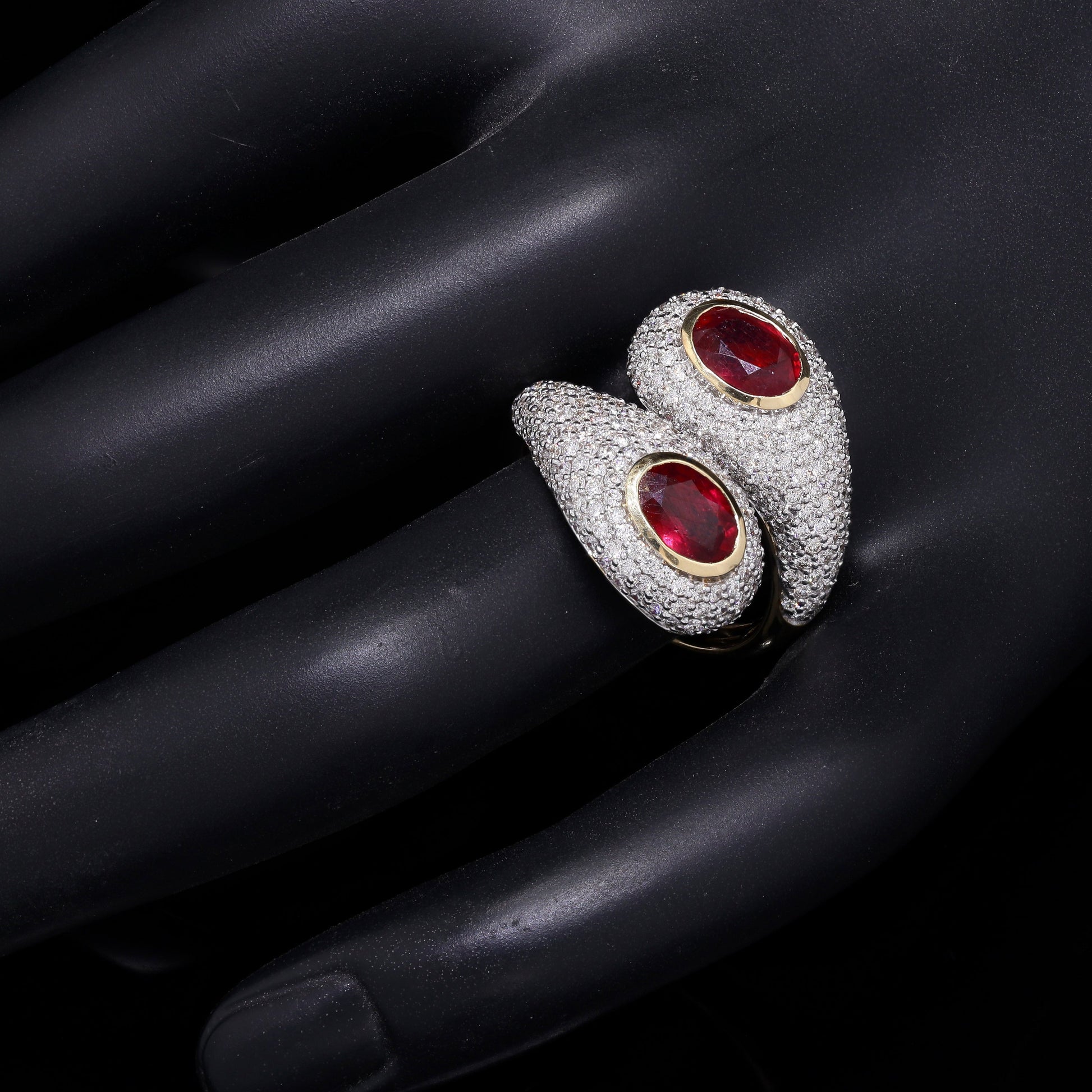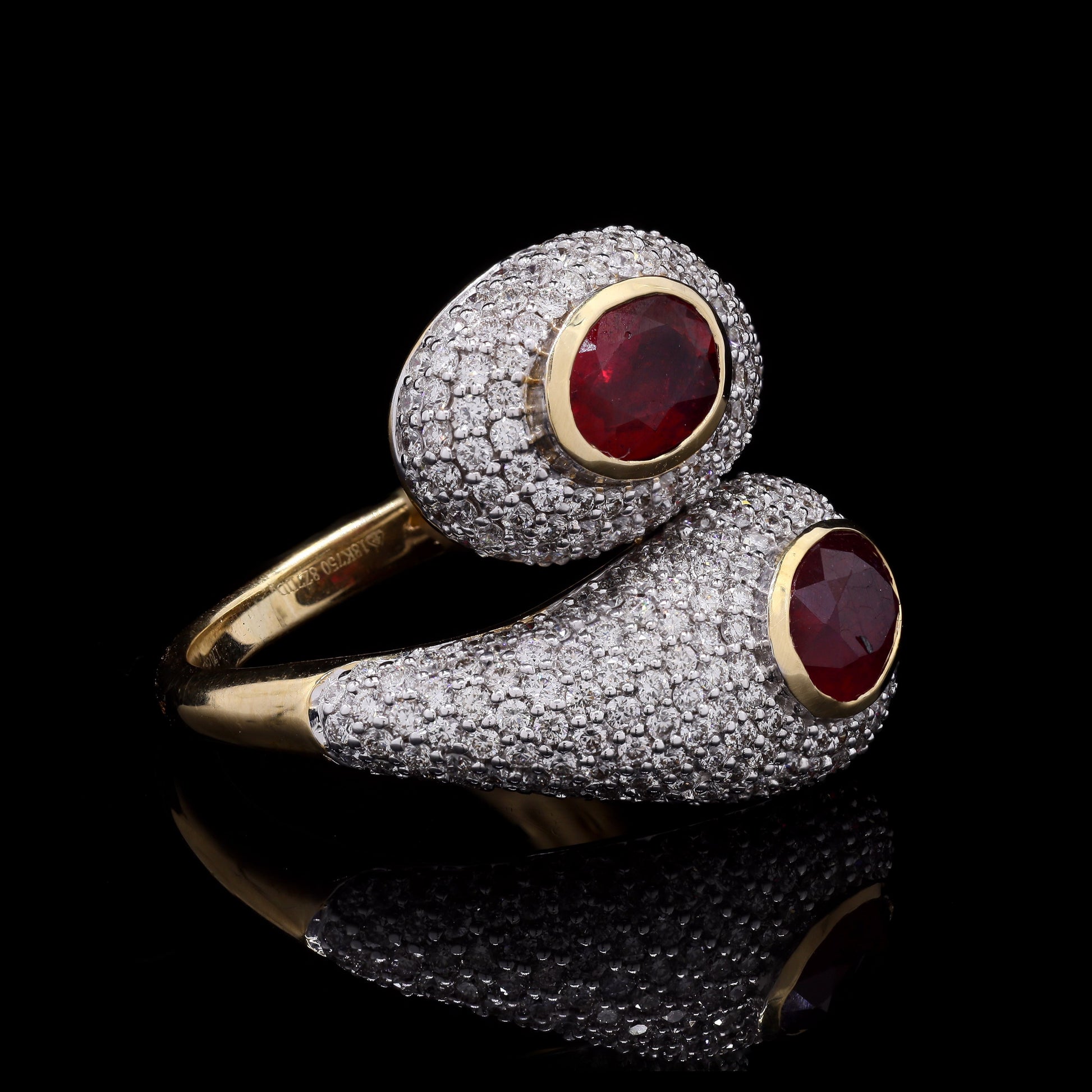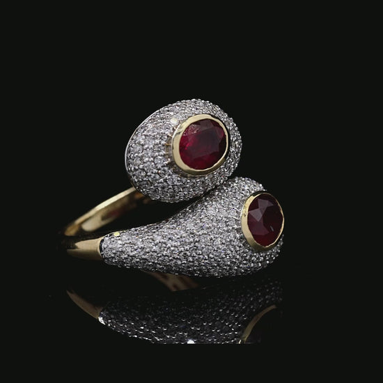 Dual-ruby, pavé diamond cocktail ring in a gold bypass design.