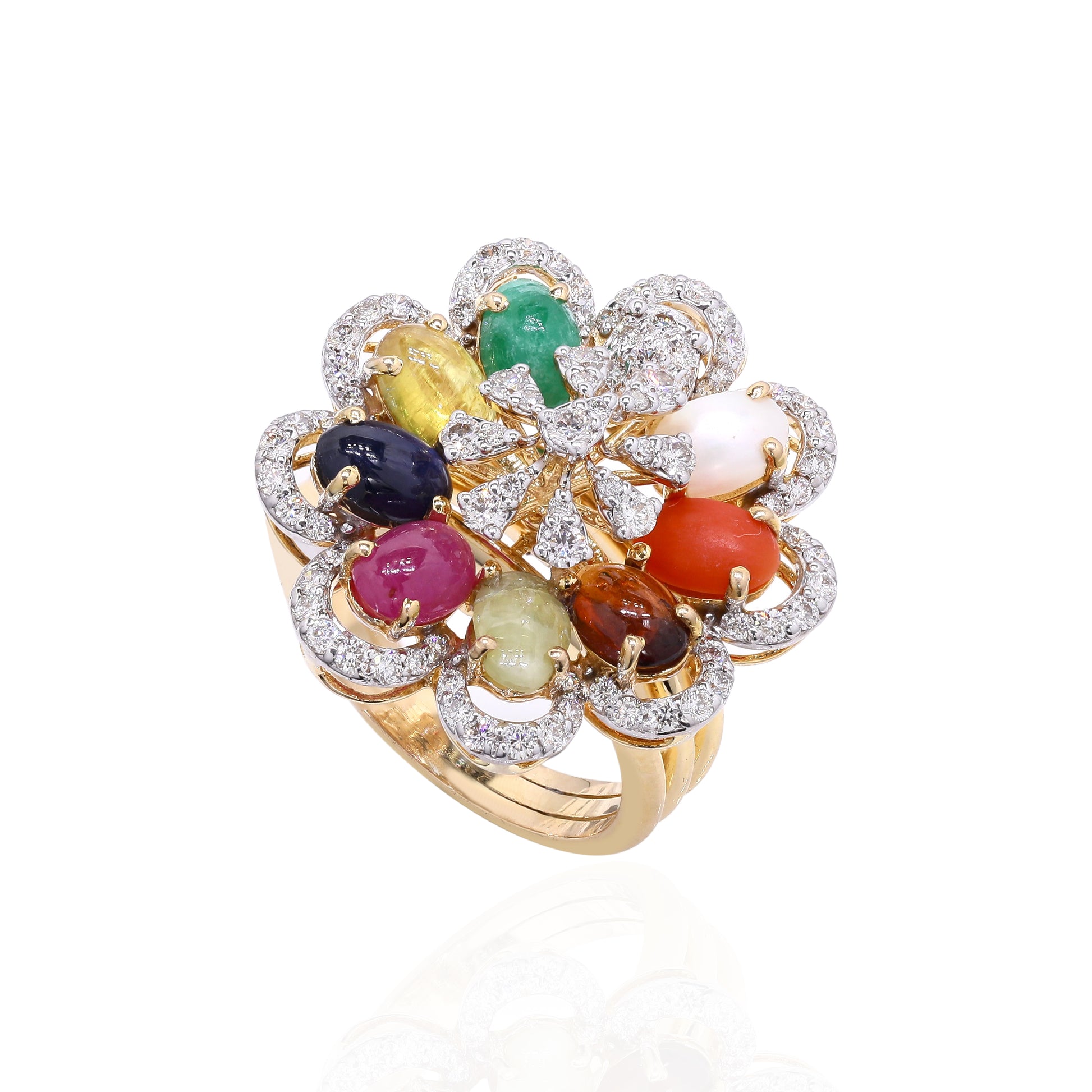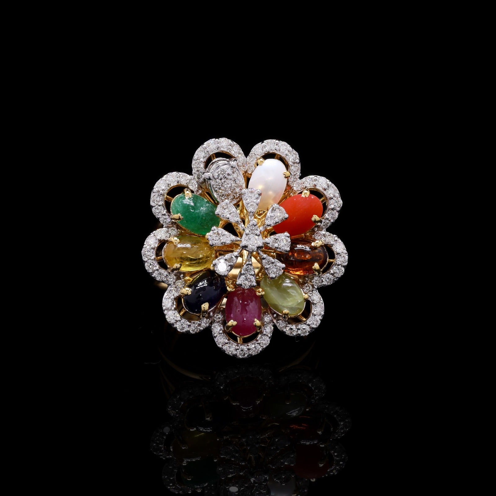 Diamond cluster ring with multi-colored cabochon gemstones in gold.