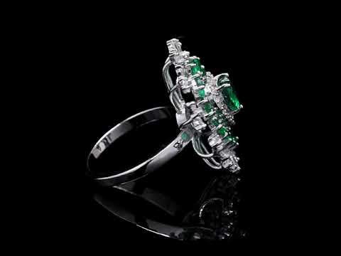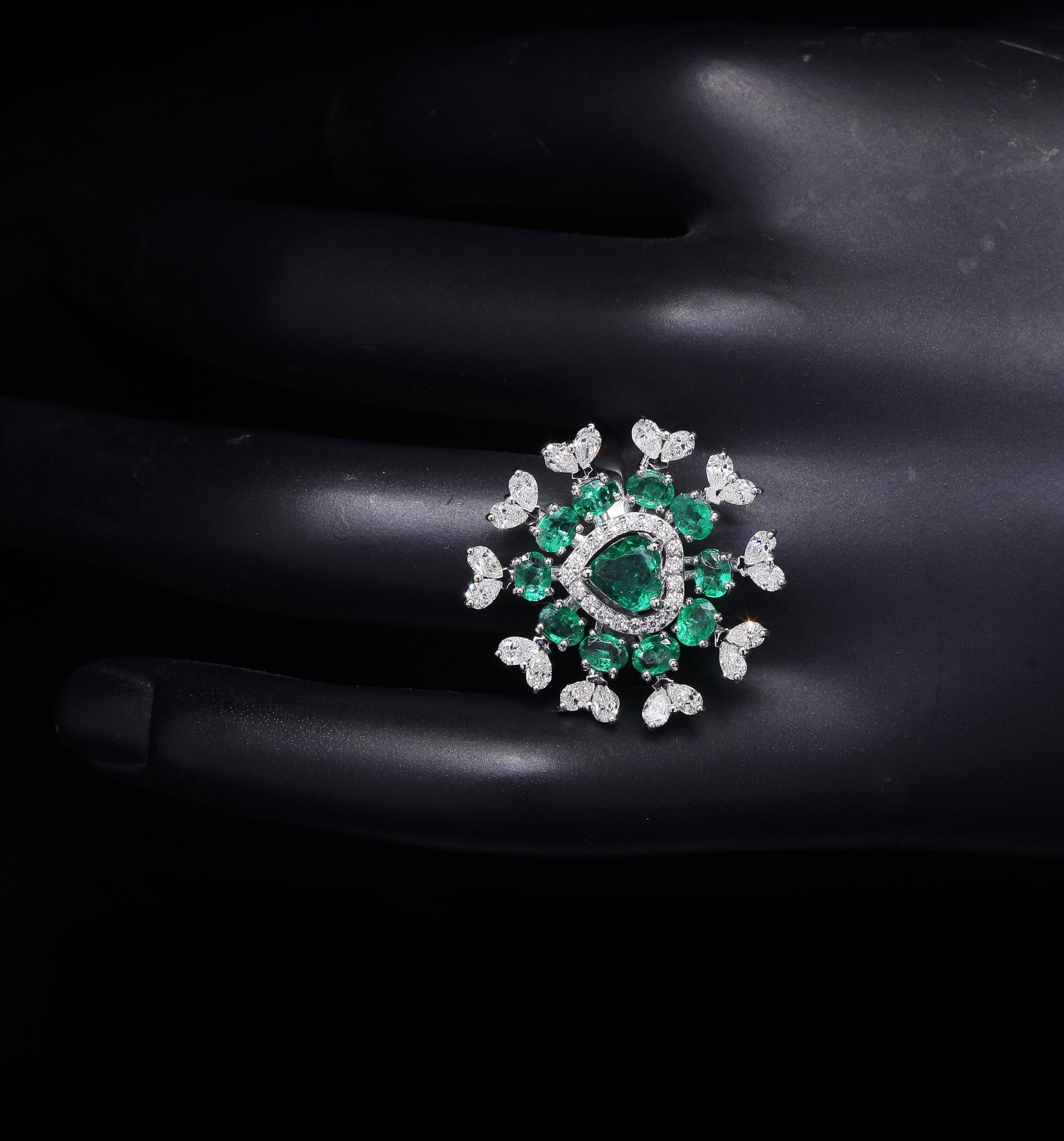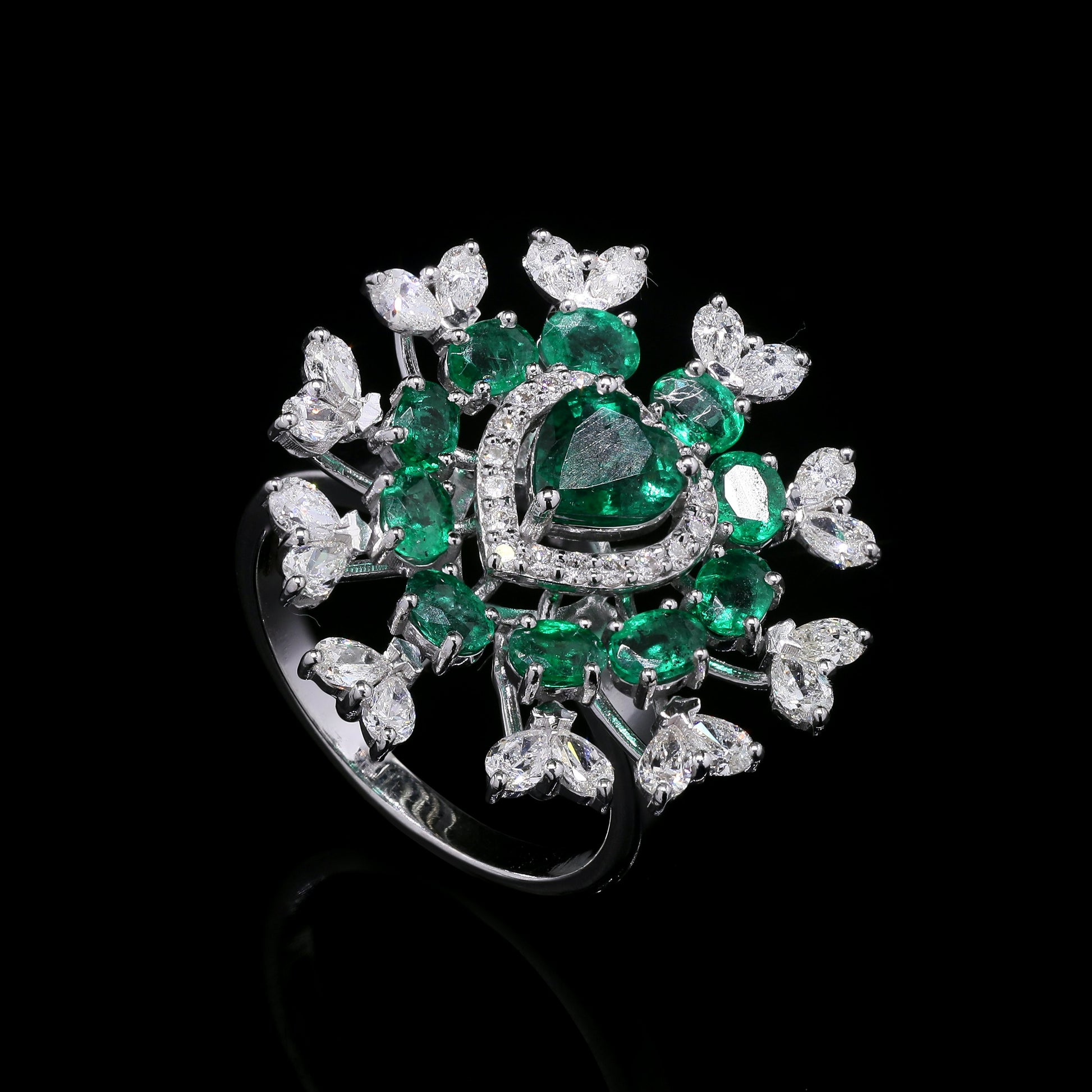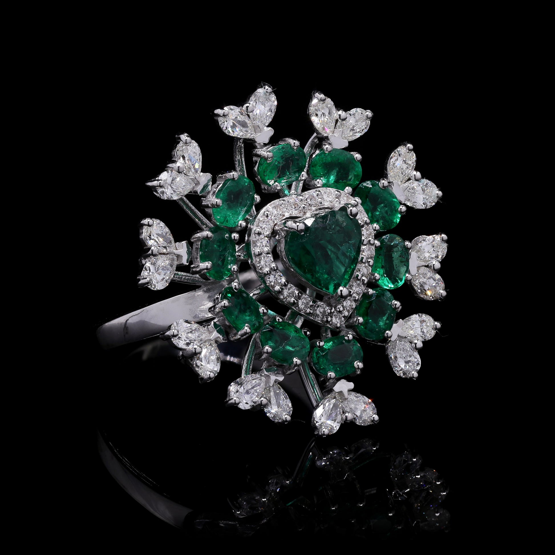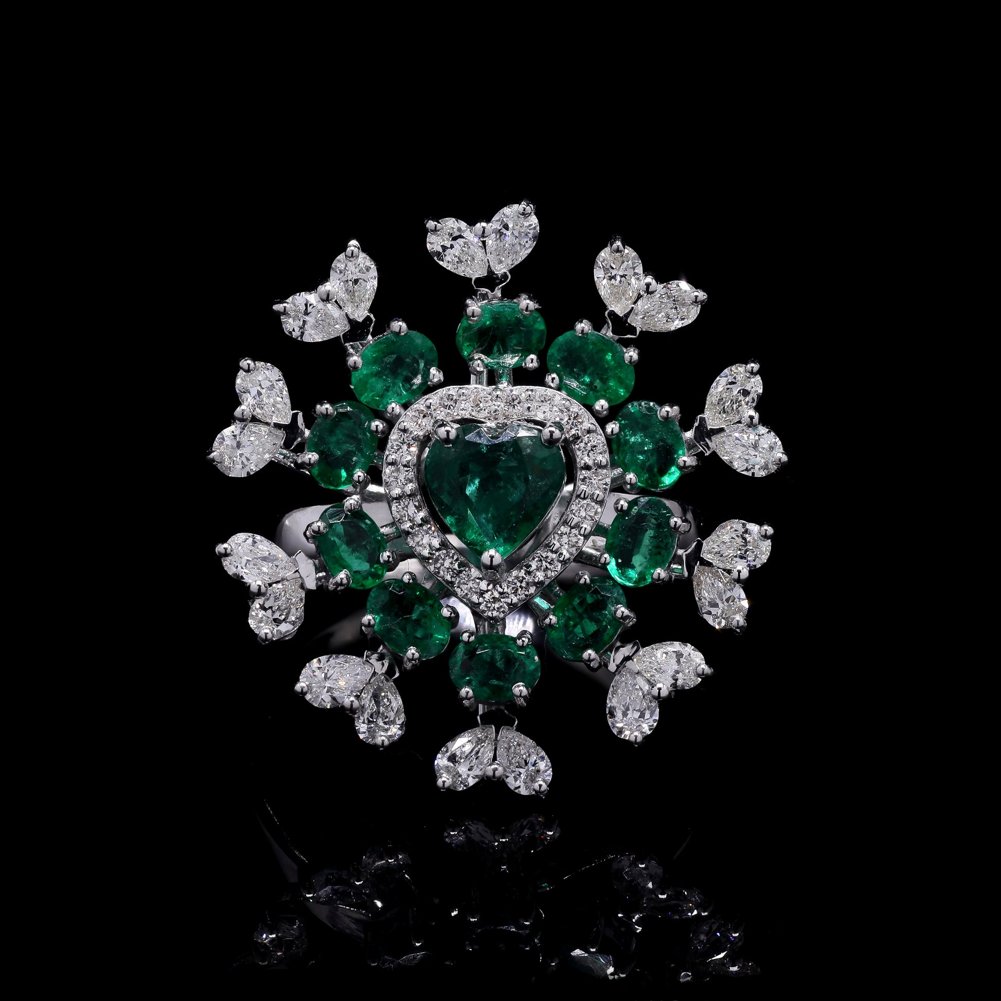 Exquisite emerald heart ring with diamond floral halo.