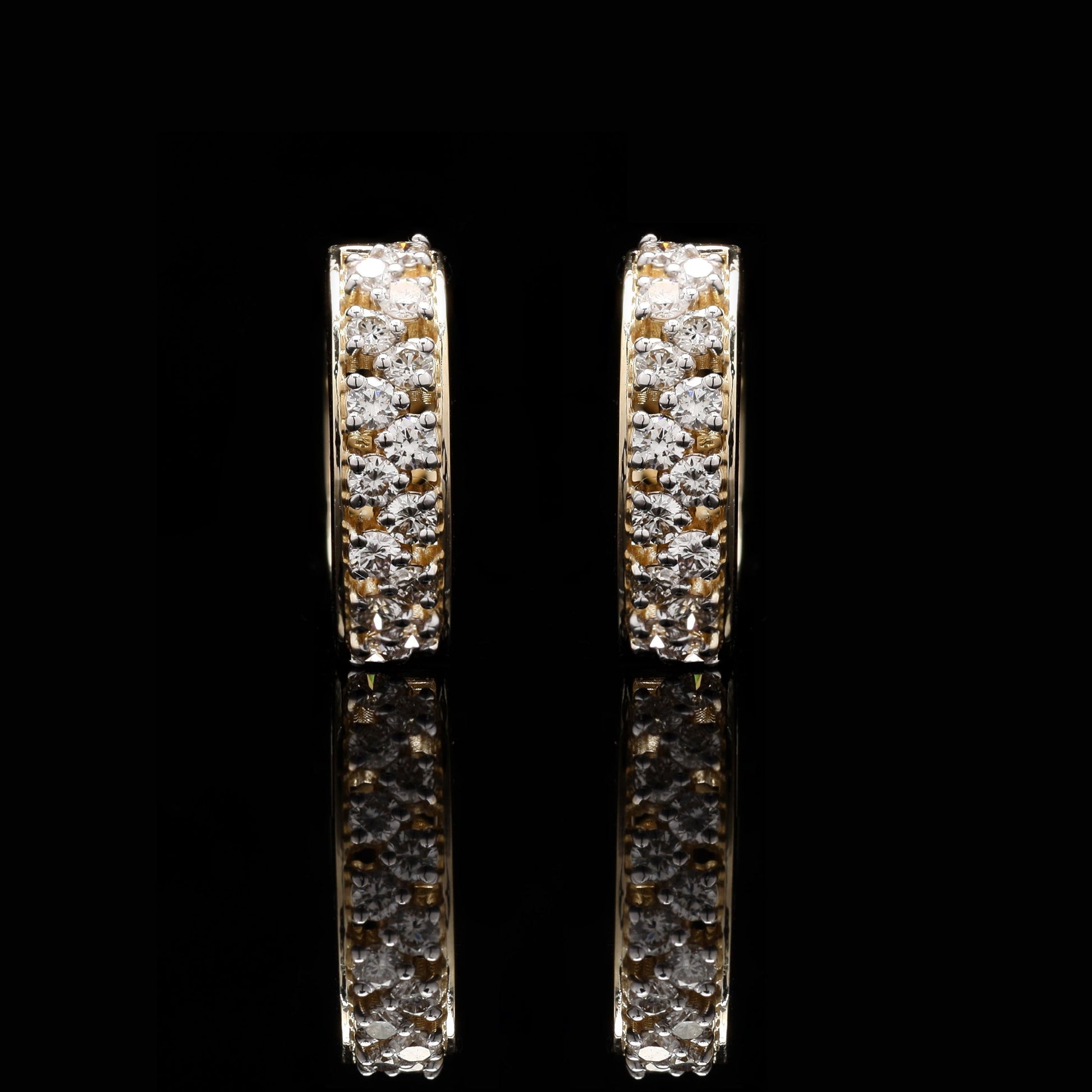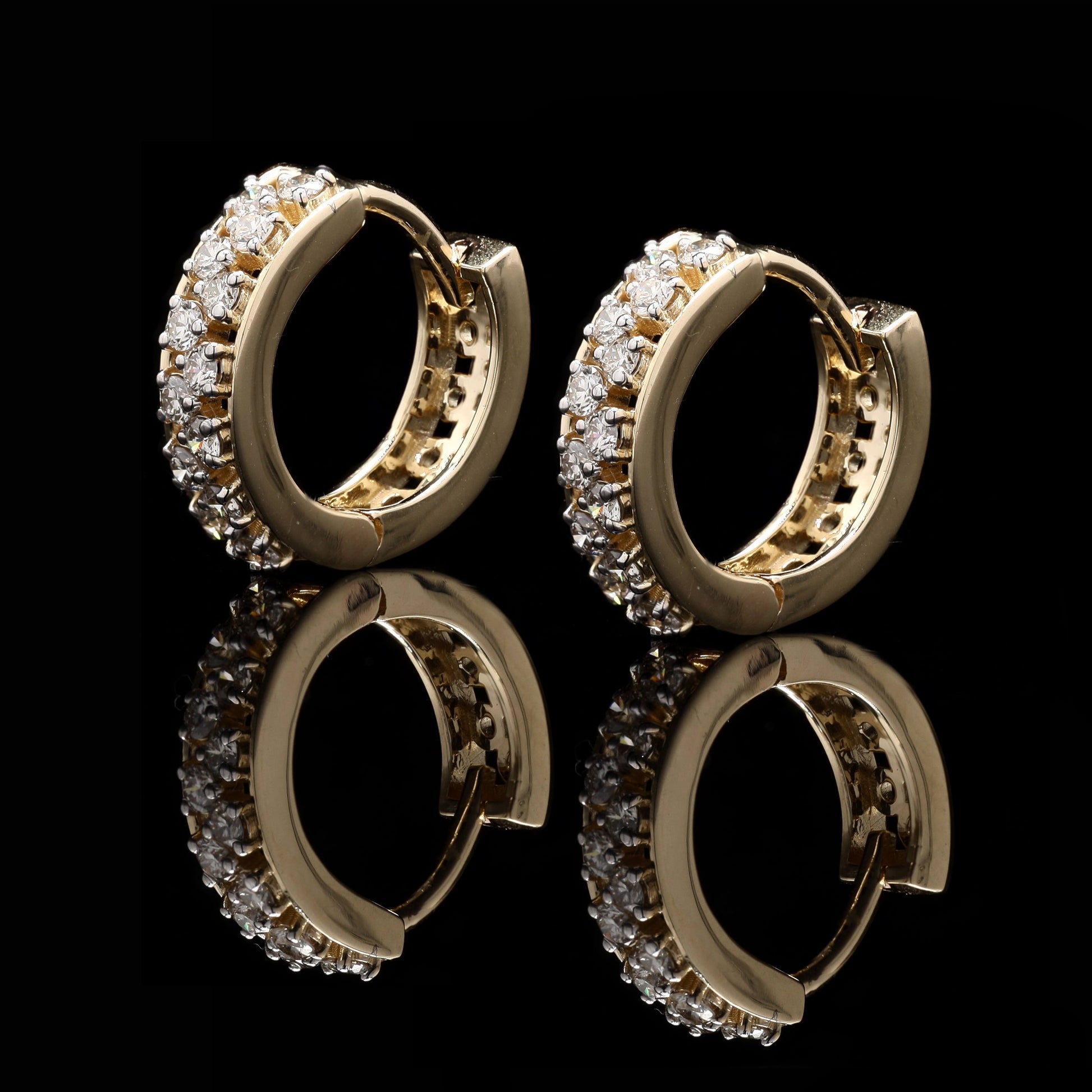 Chunky two-tone huggie hoops featuring three rows of pave-set diamonds.