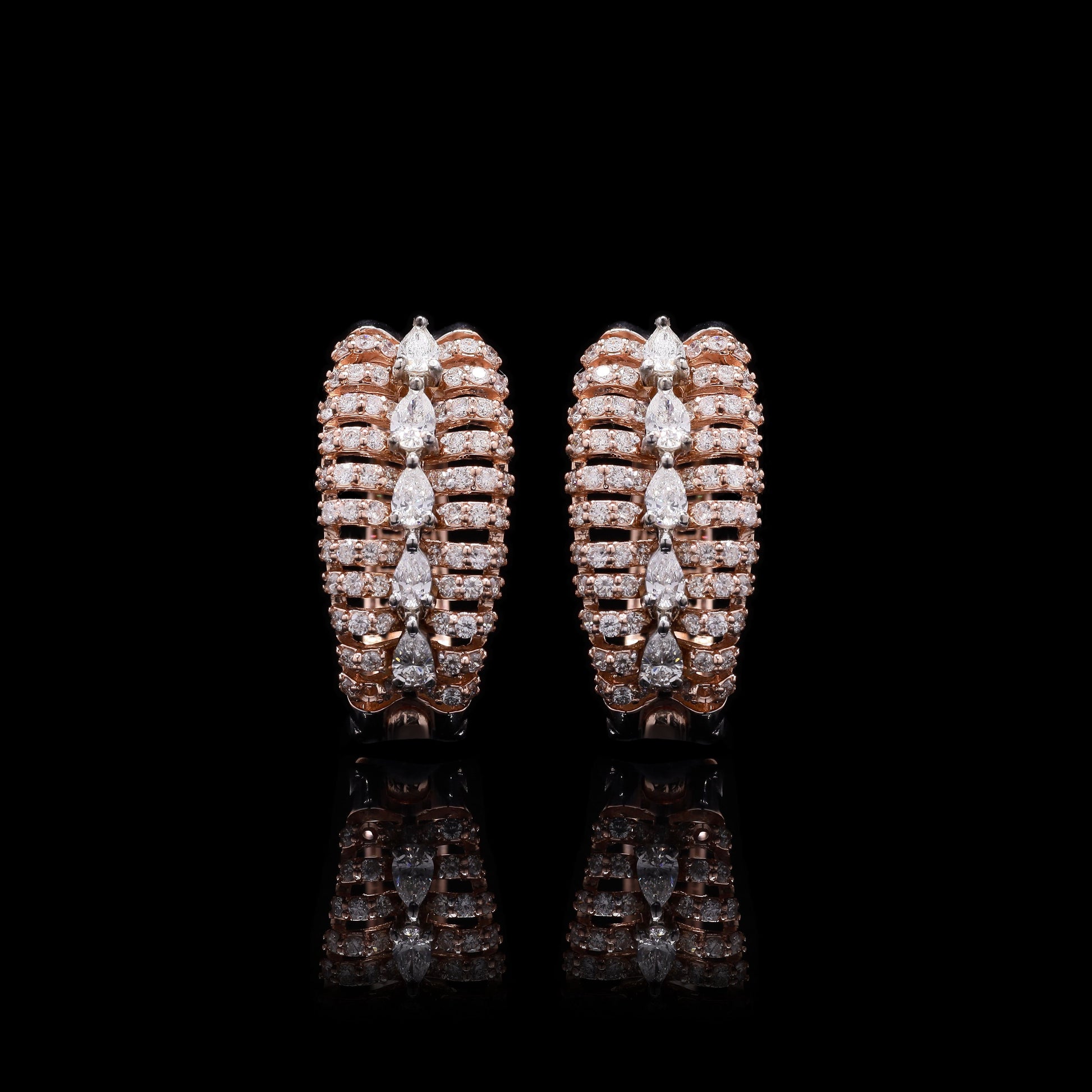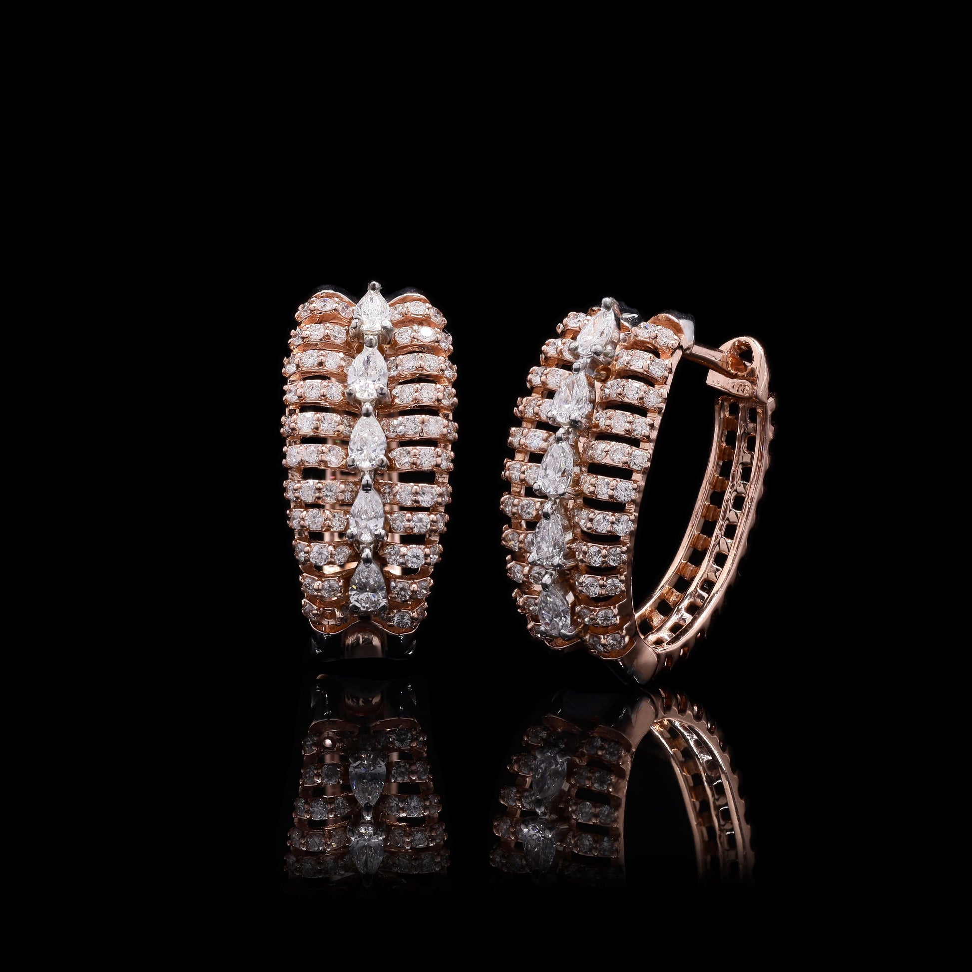 Wide rose gold diamond hoops, featuring rows of pavé and pear-shaped cuts.