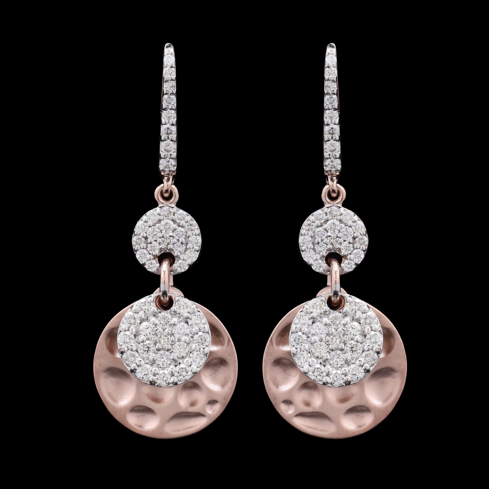 Diamond-set drop earrings featuring textured rose gold discs and micro-pavé circles.