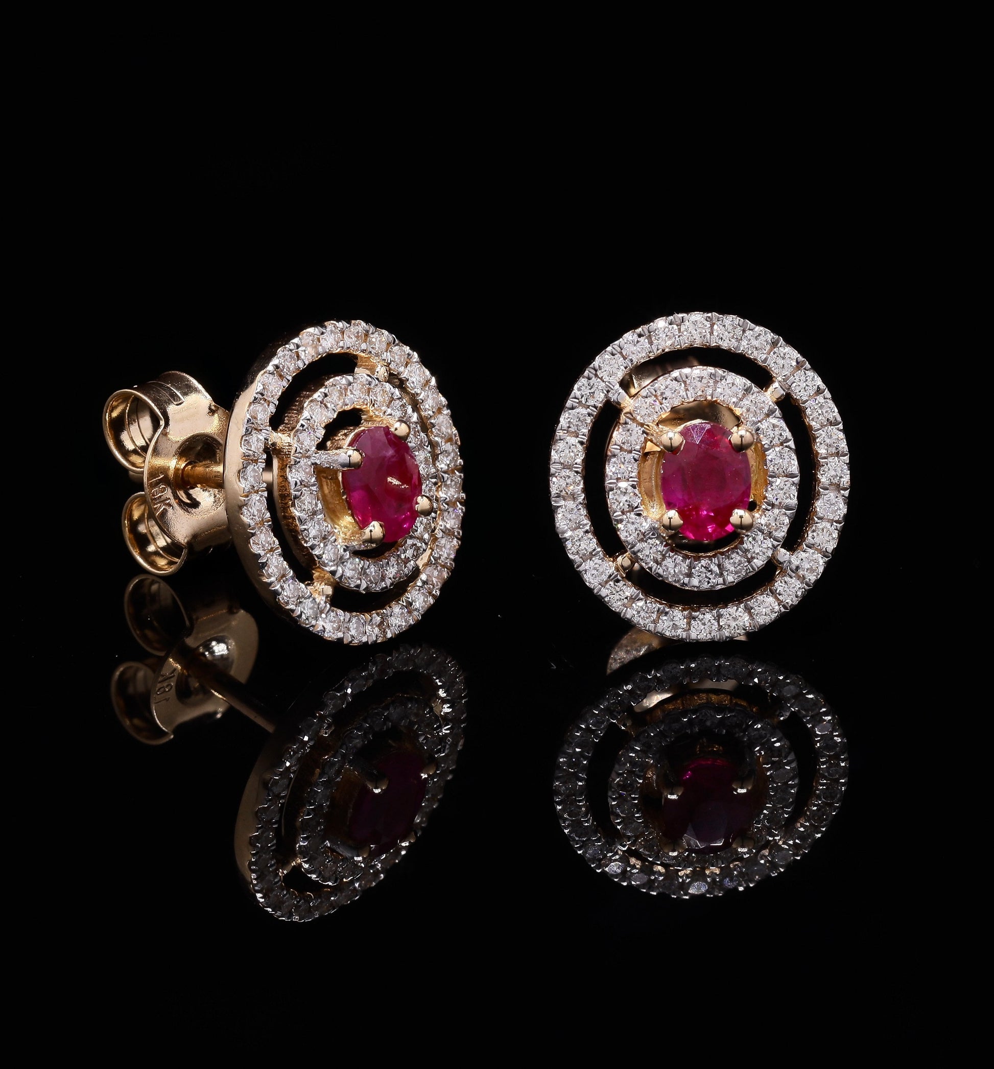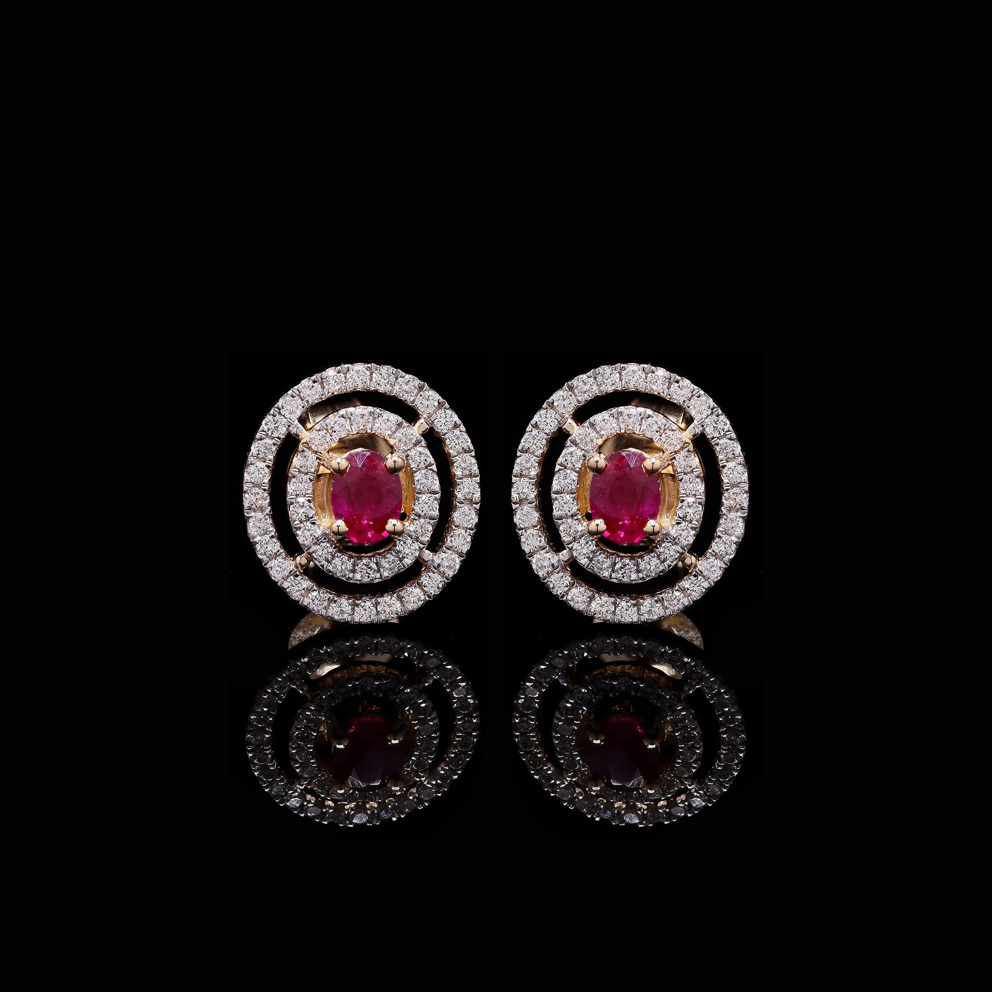Magnificent mixed-metal ruby studs with concentric diamond double halo borders.