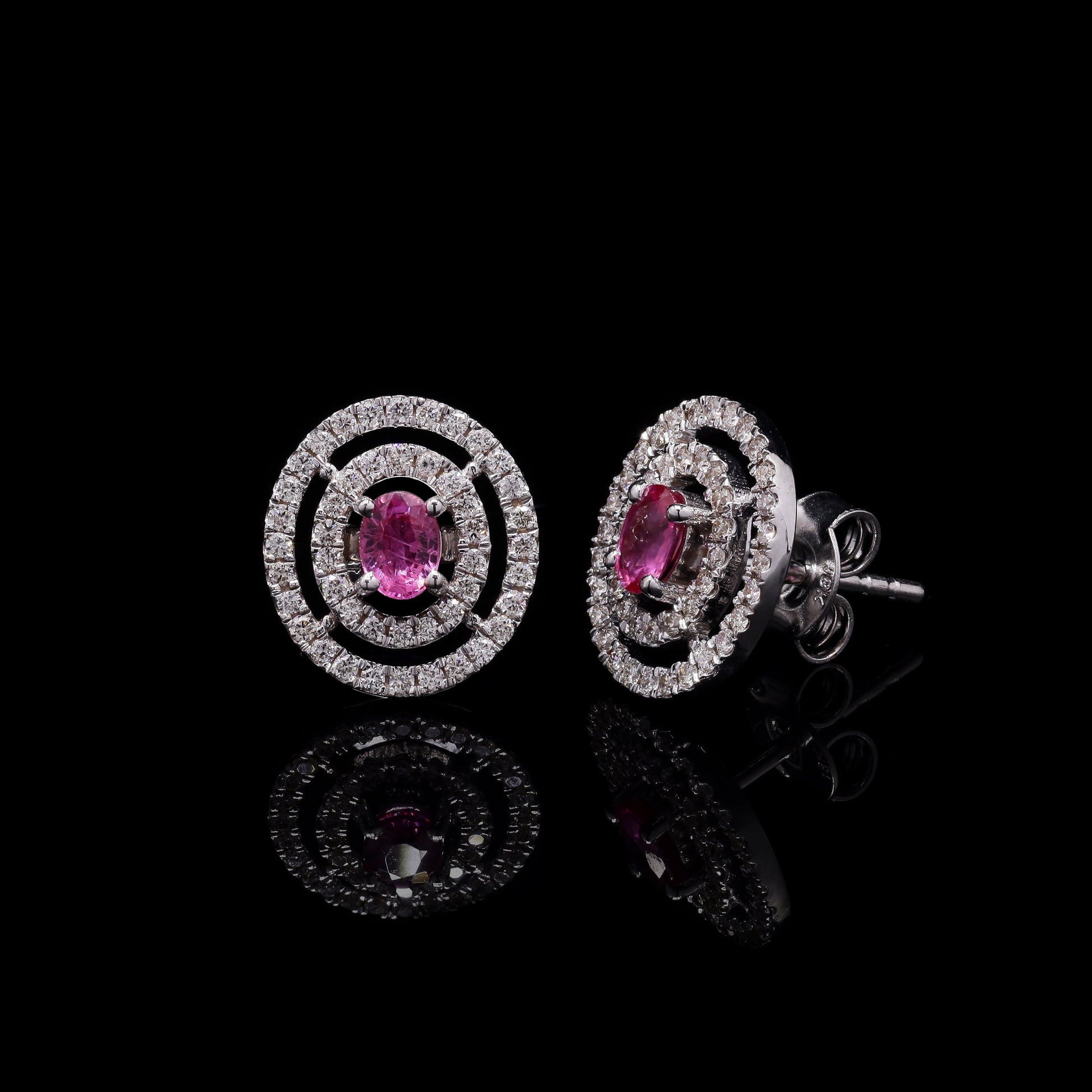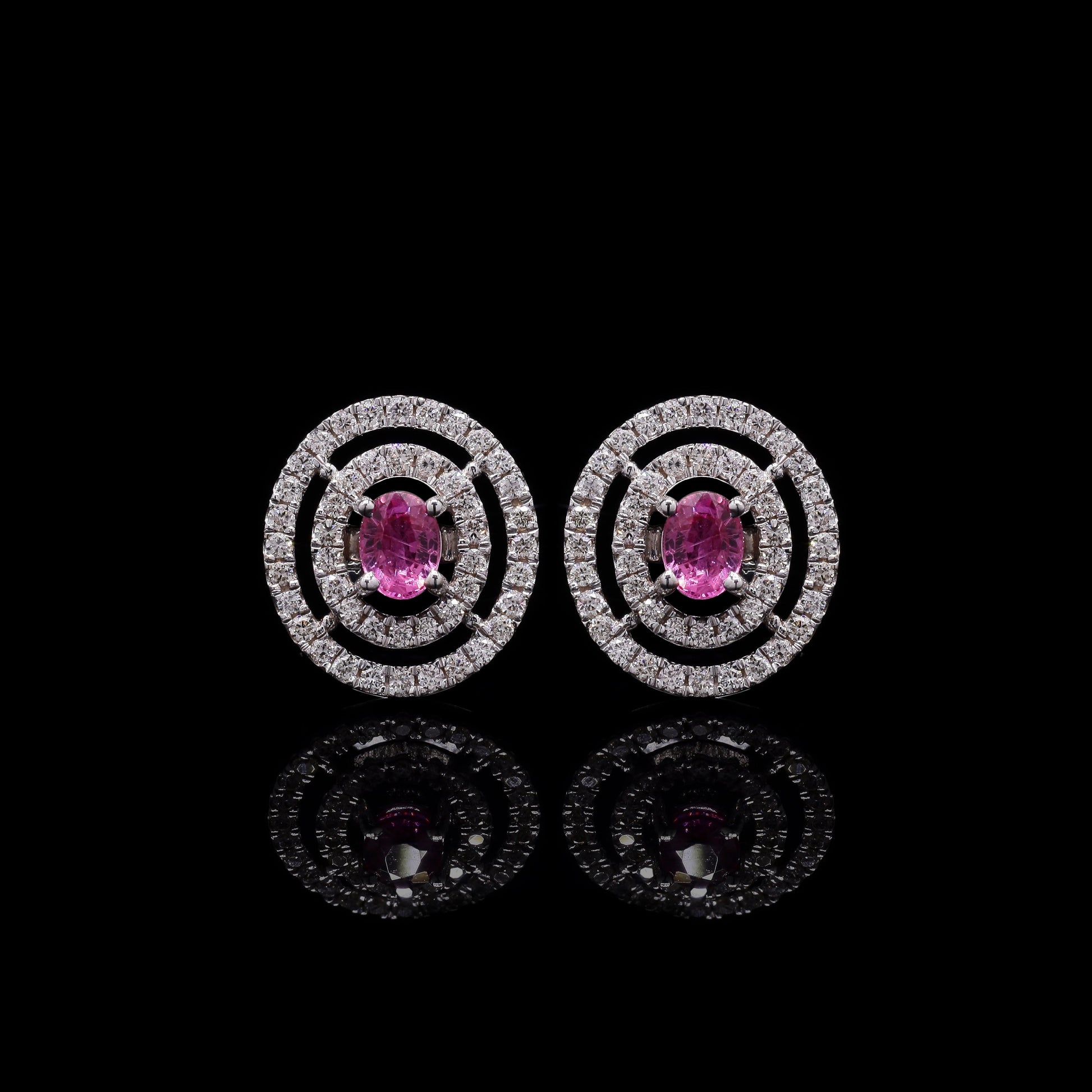 Exceptional white gold pink sapphire studs with concentric diamond double halos.
