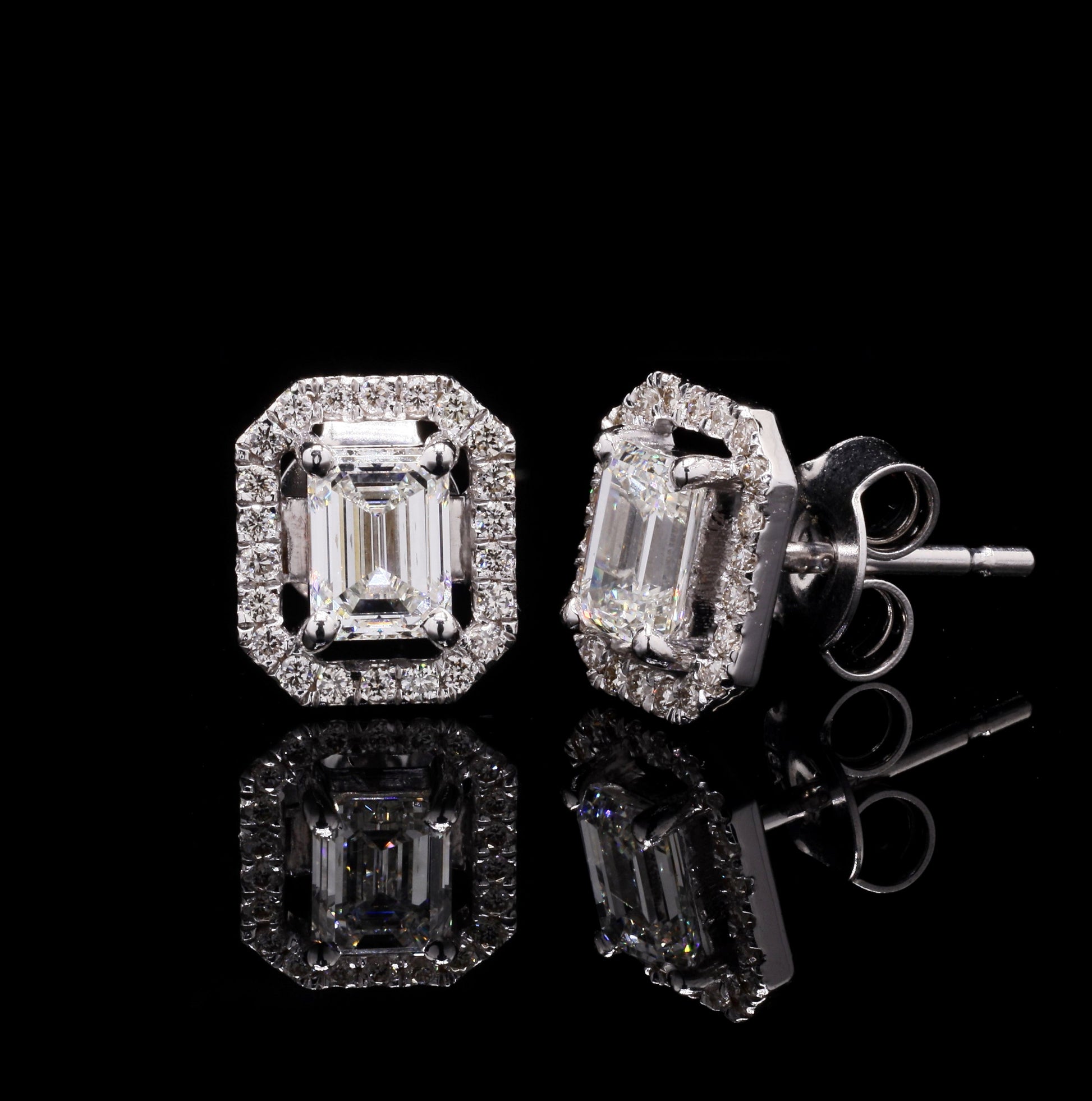 Magnificent white gold stud earrings with emerald-cut diamonds and halo setting.