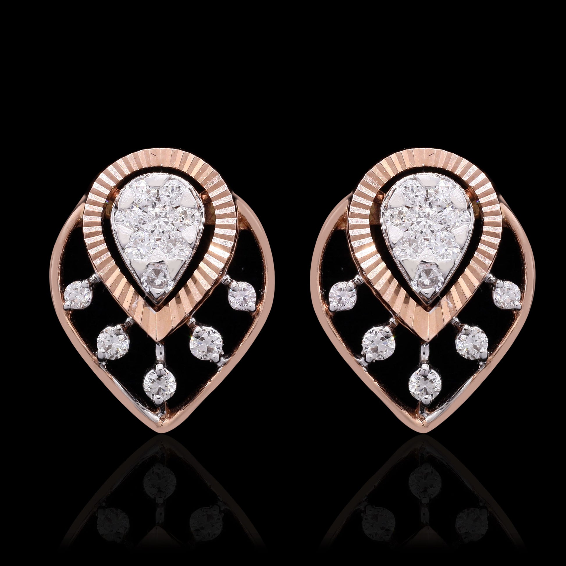 Striking rose gold shield earrings featuring a central pear-shaped diamond cluster.