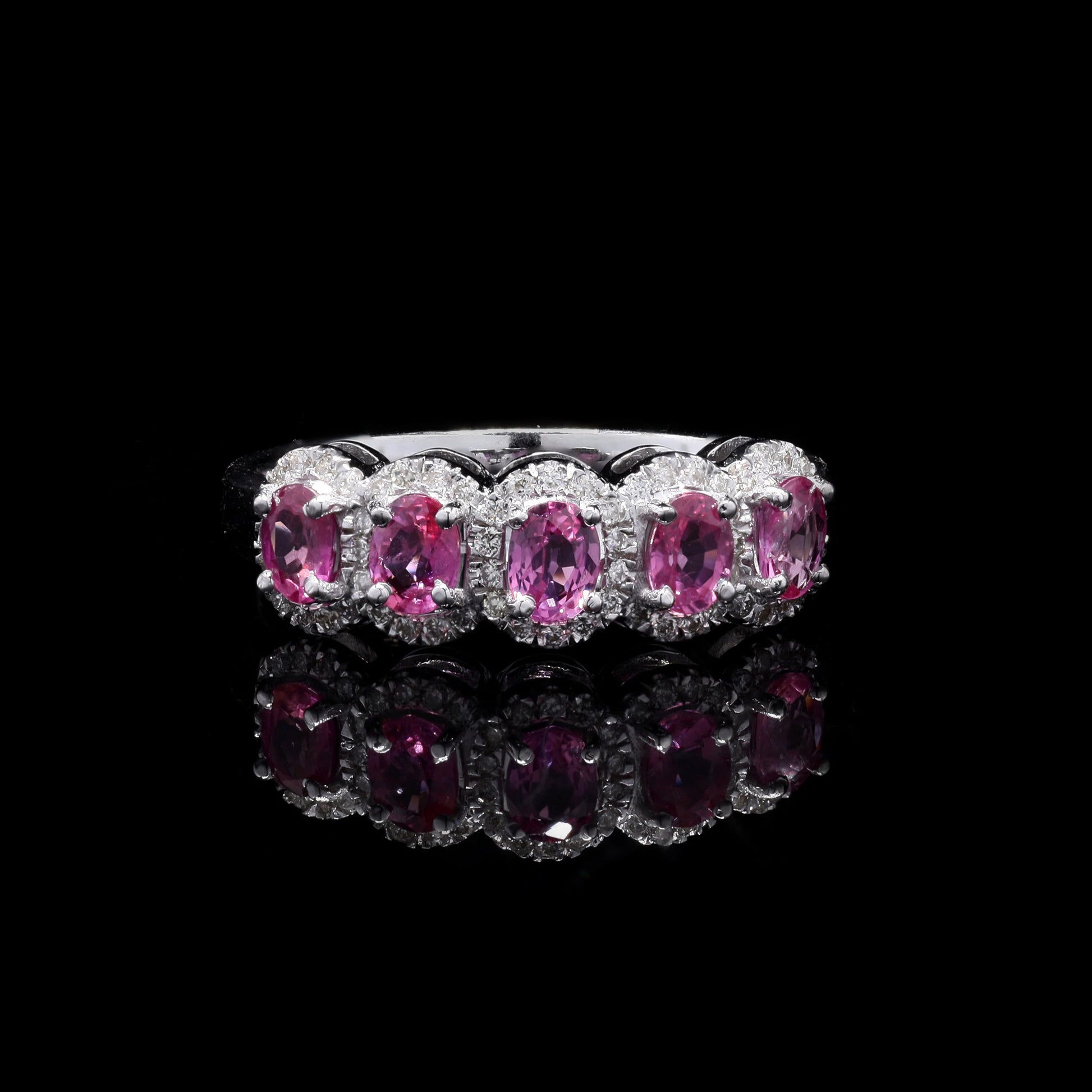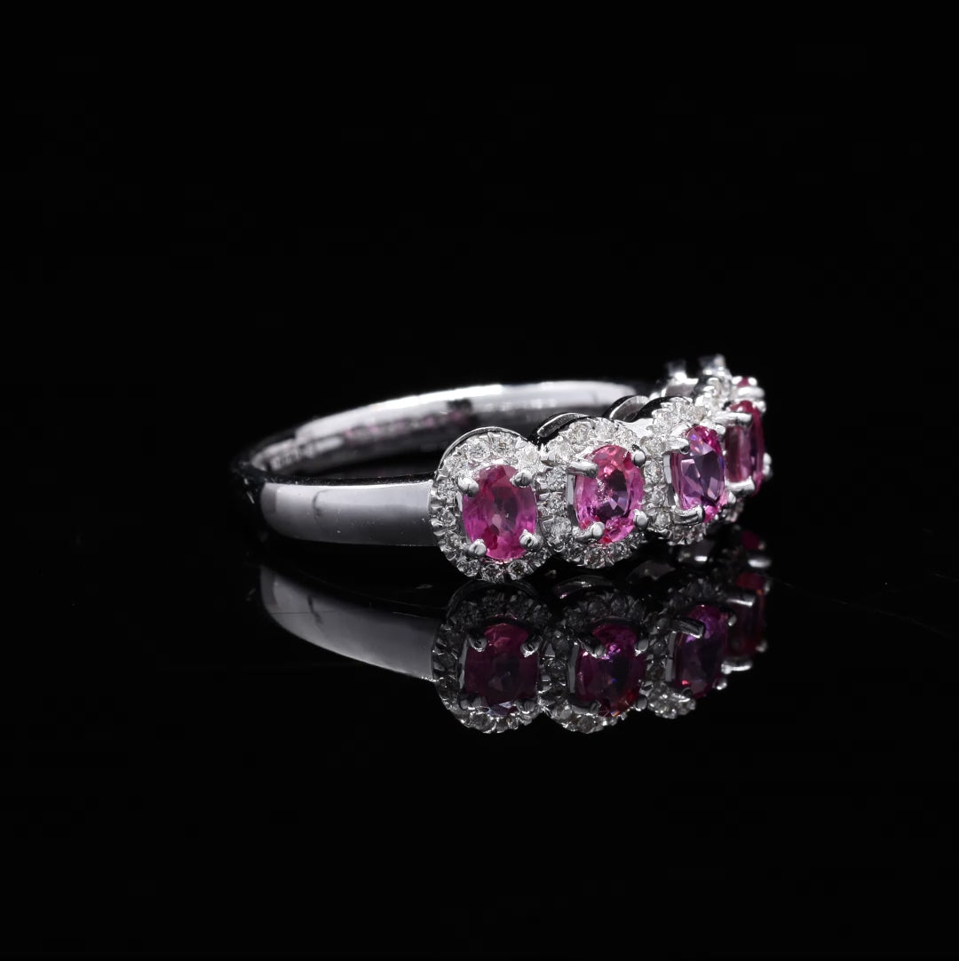 Oval-cut pink sapphires with diamond halos on a white gold band.