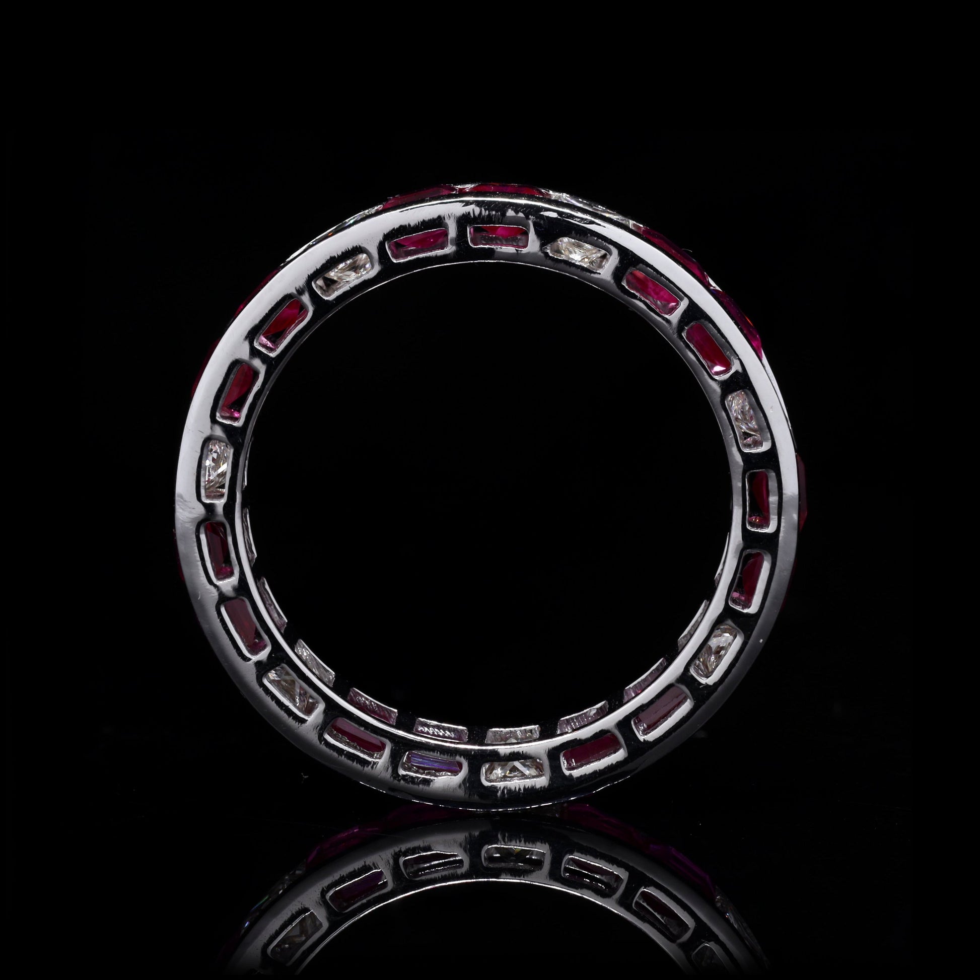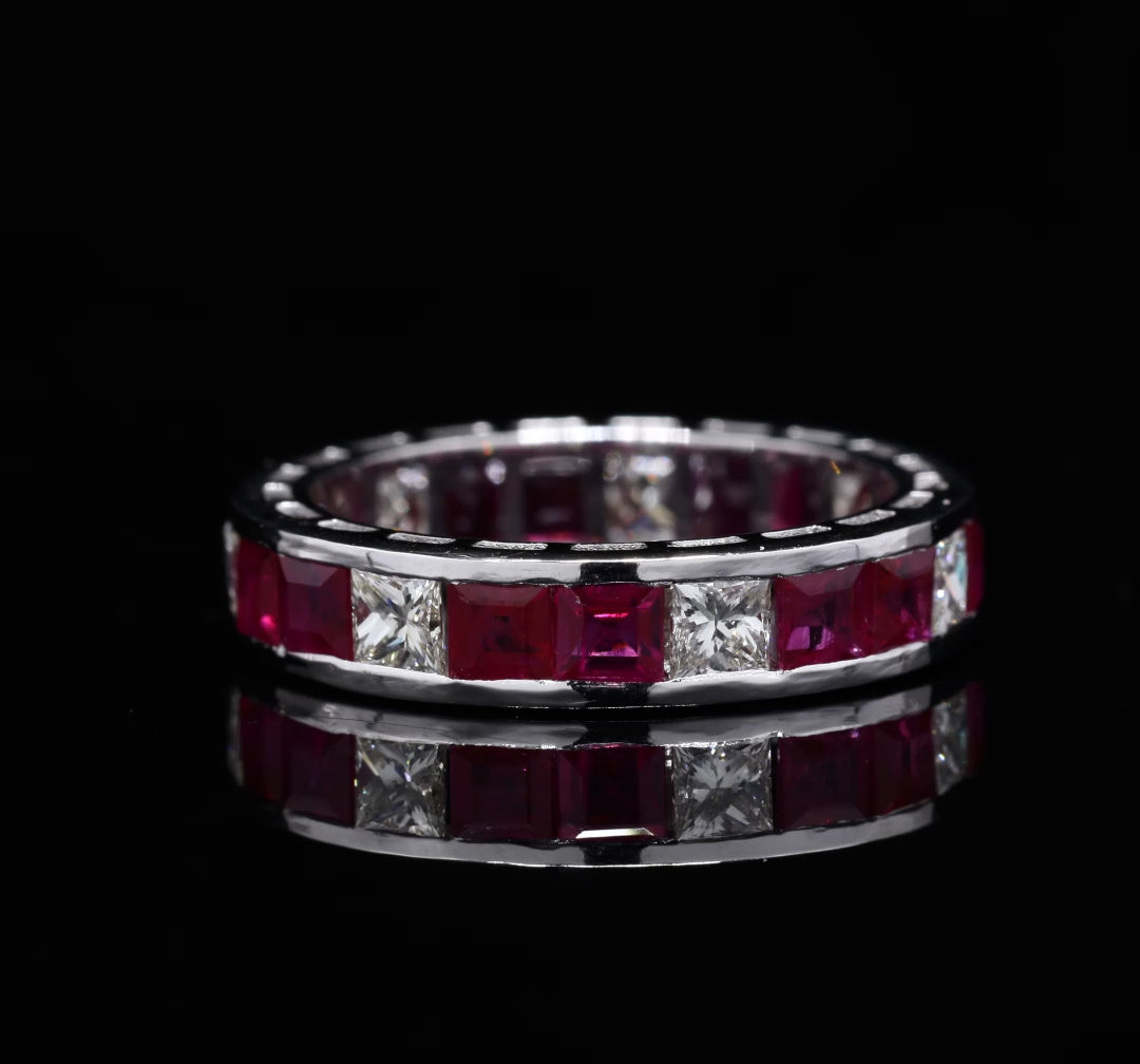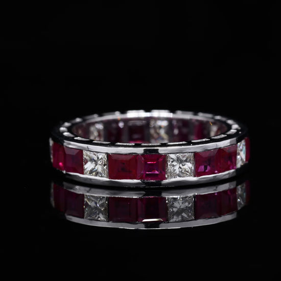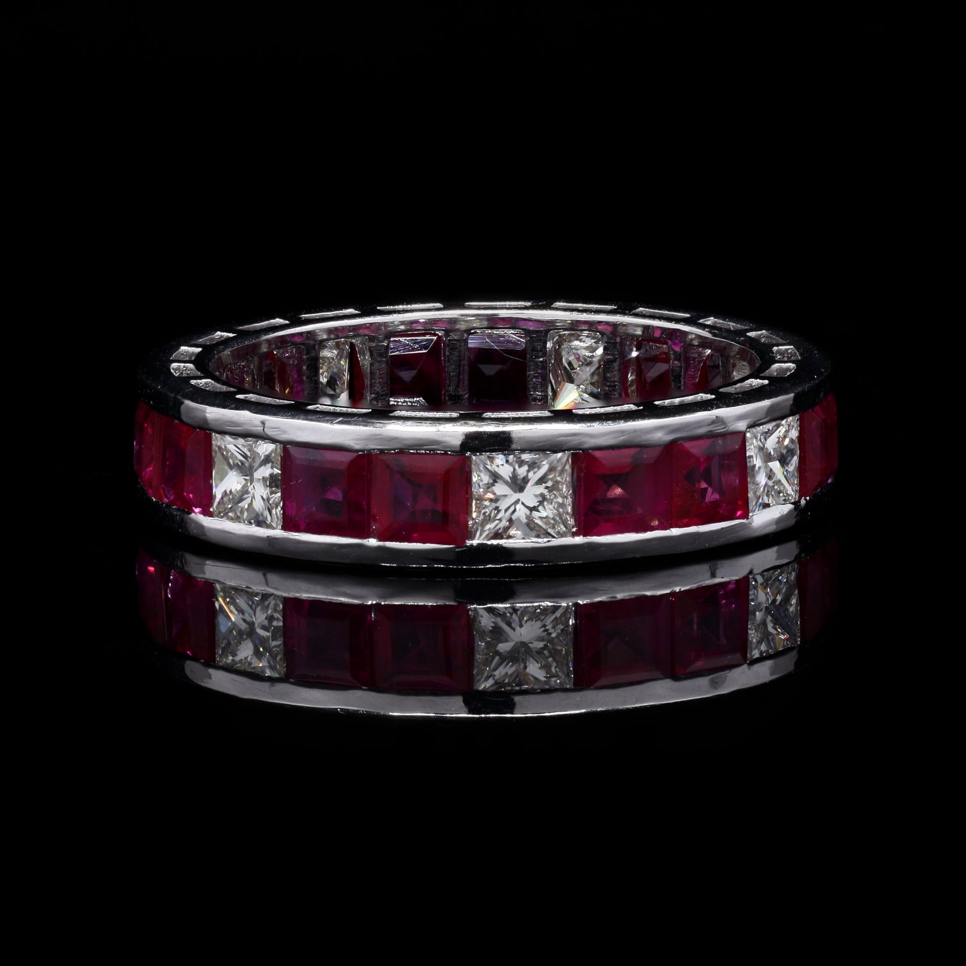 Princess-cut diamonds alternate with rubies in a platinum eternity band.
