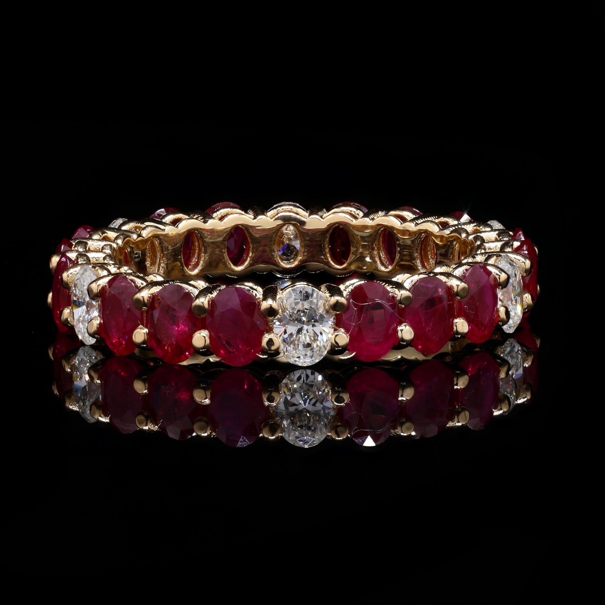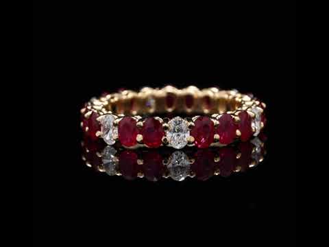 Yellow gold oval ruby and diamond eternity band ring.
