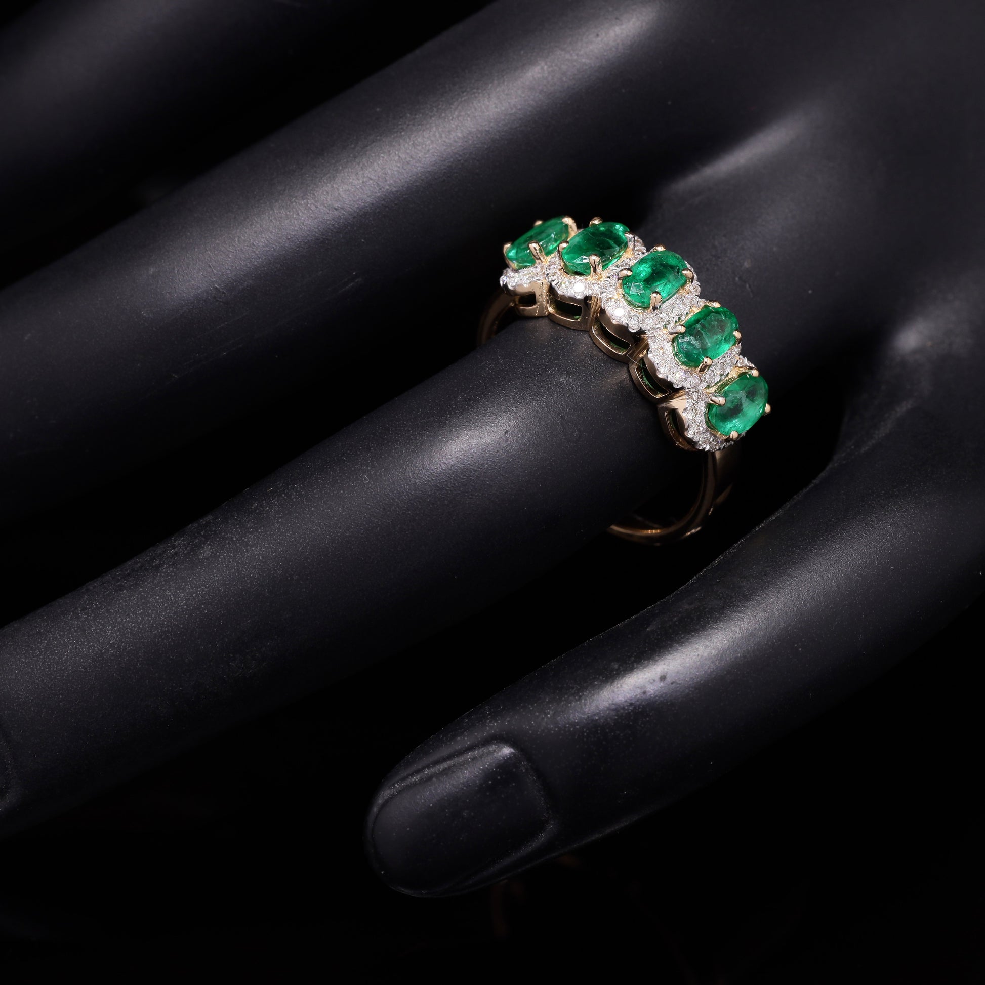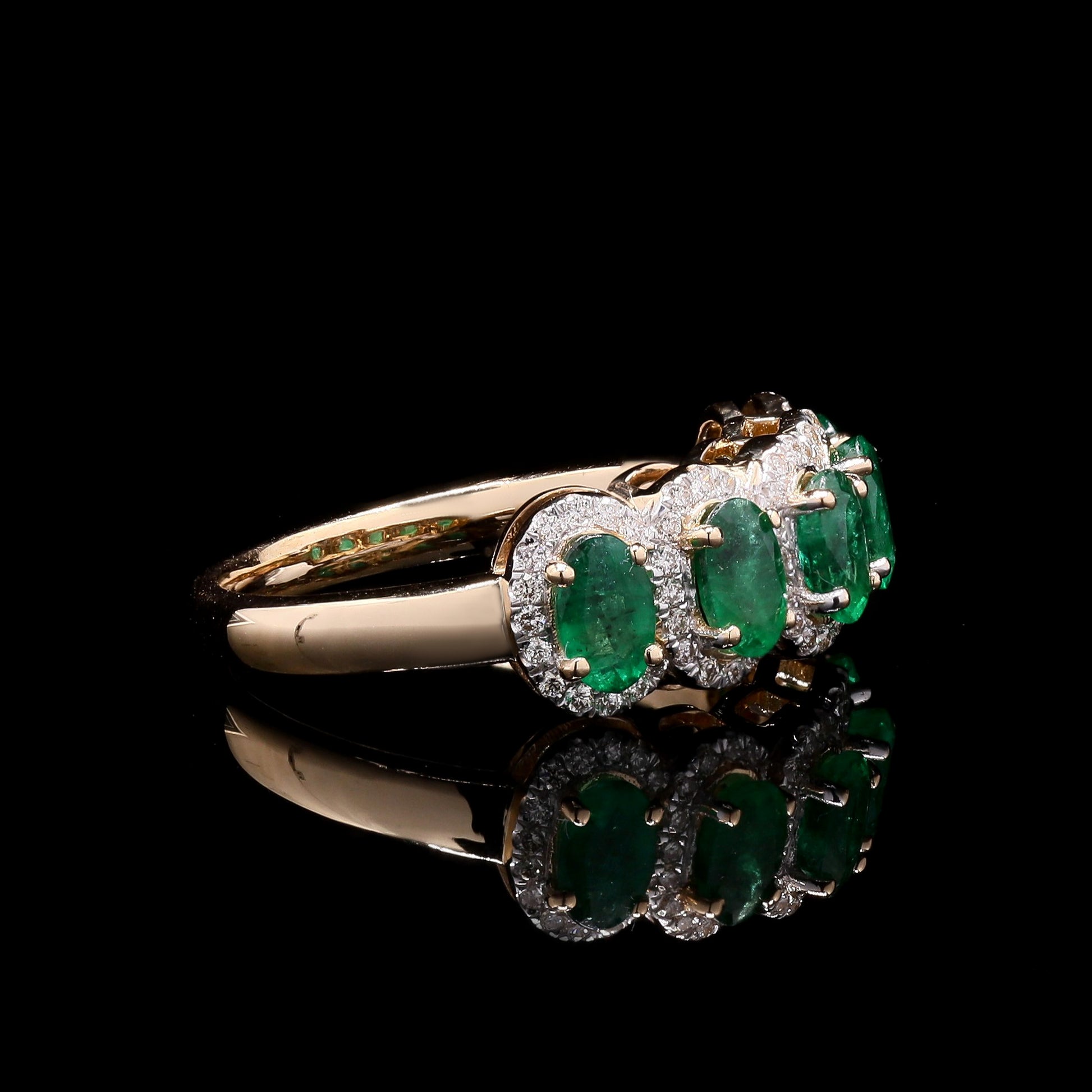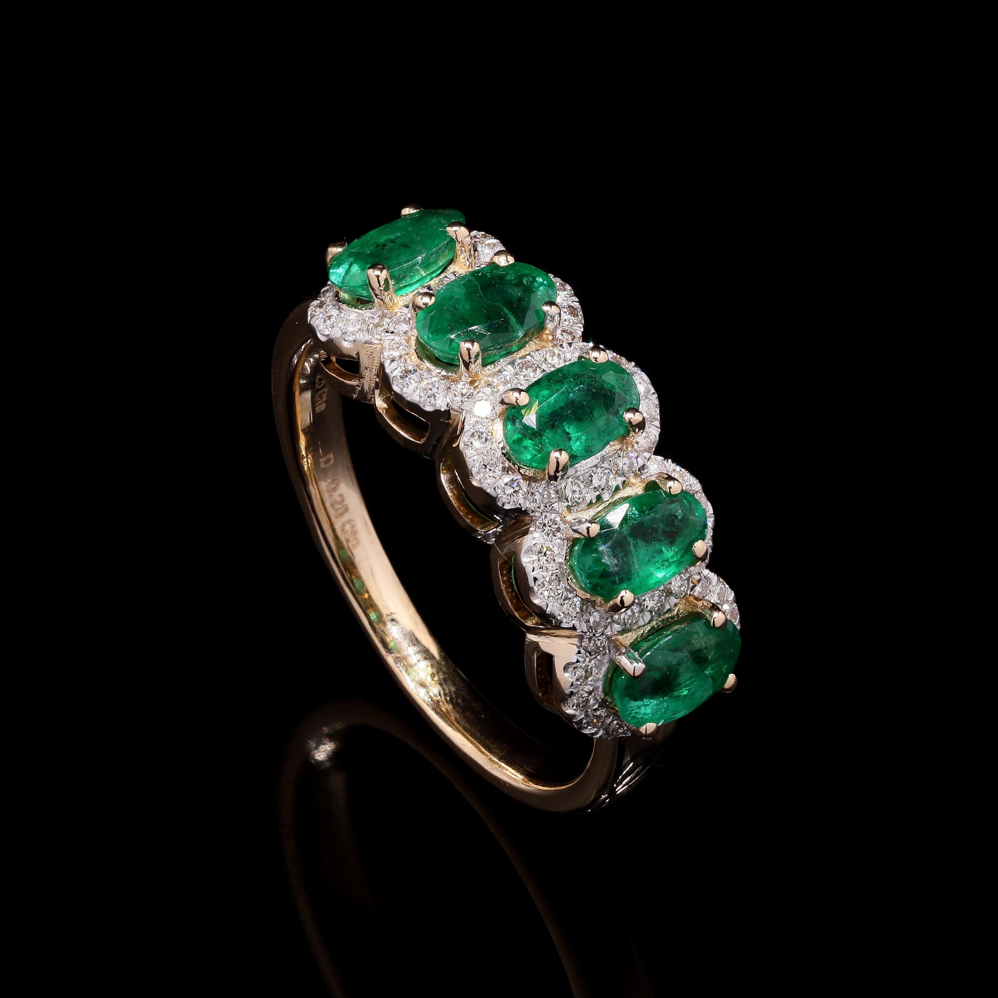 Oval emerald, pave-halo eternity; luxuriant.