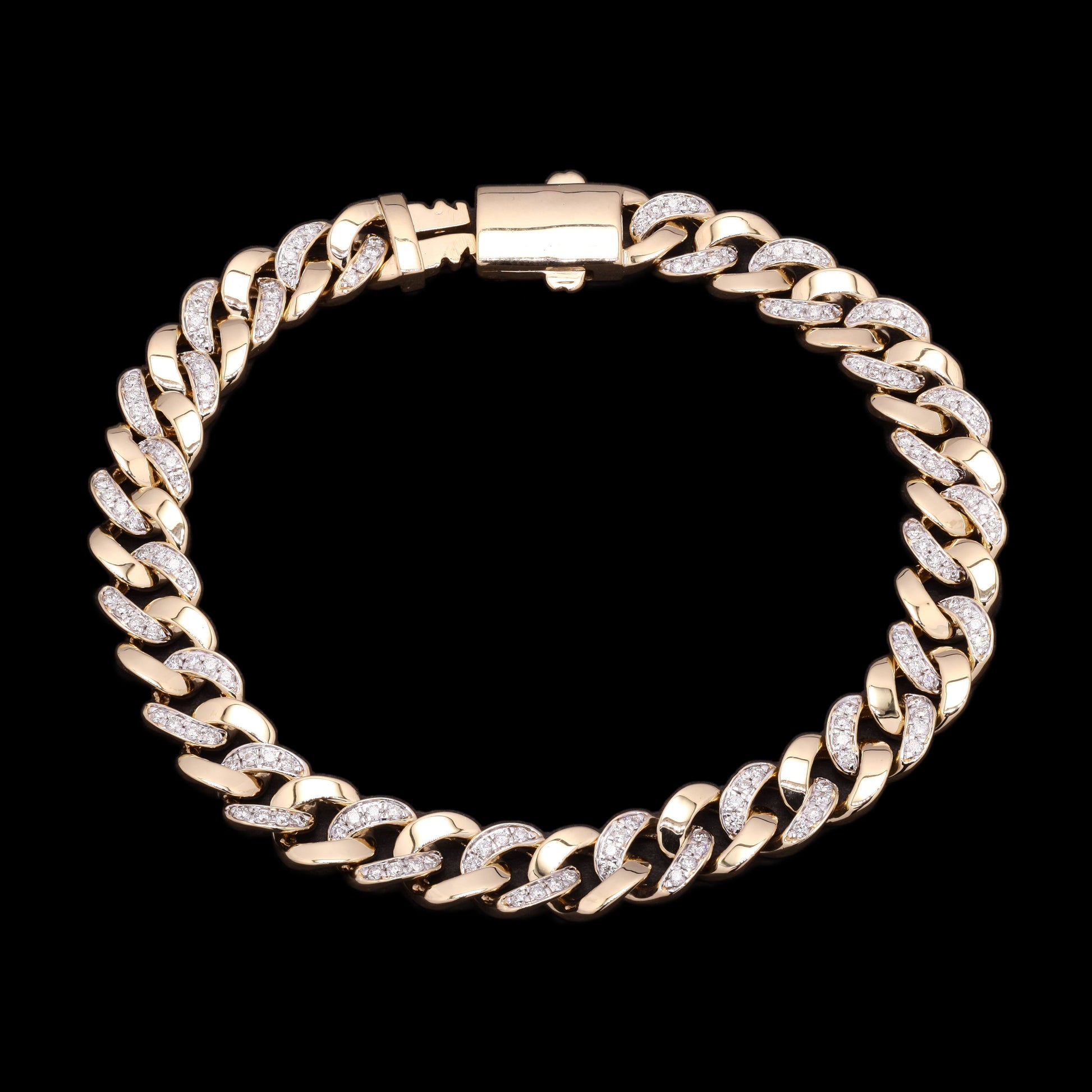 Gold Cuban bracelet with diamond-studded links, classic luxury shine