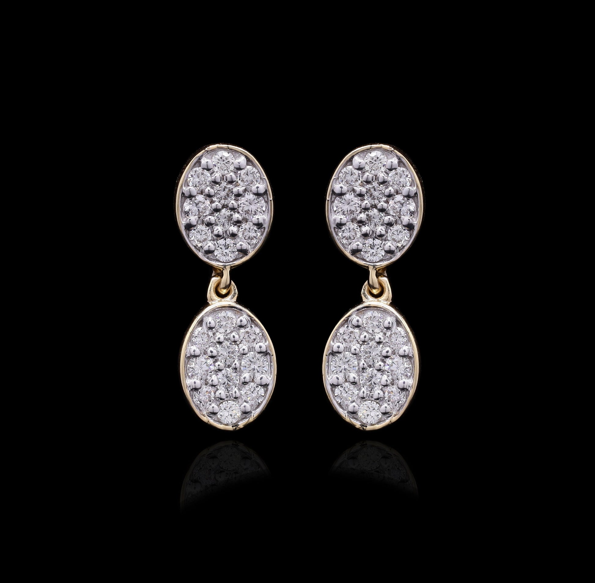 "Articulated gold and diamond earrings showcasing twin elliptical clusters."