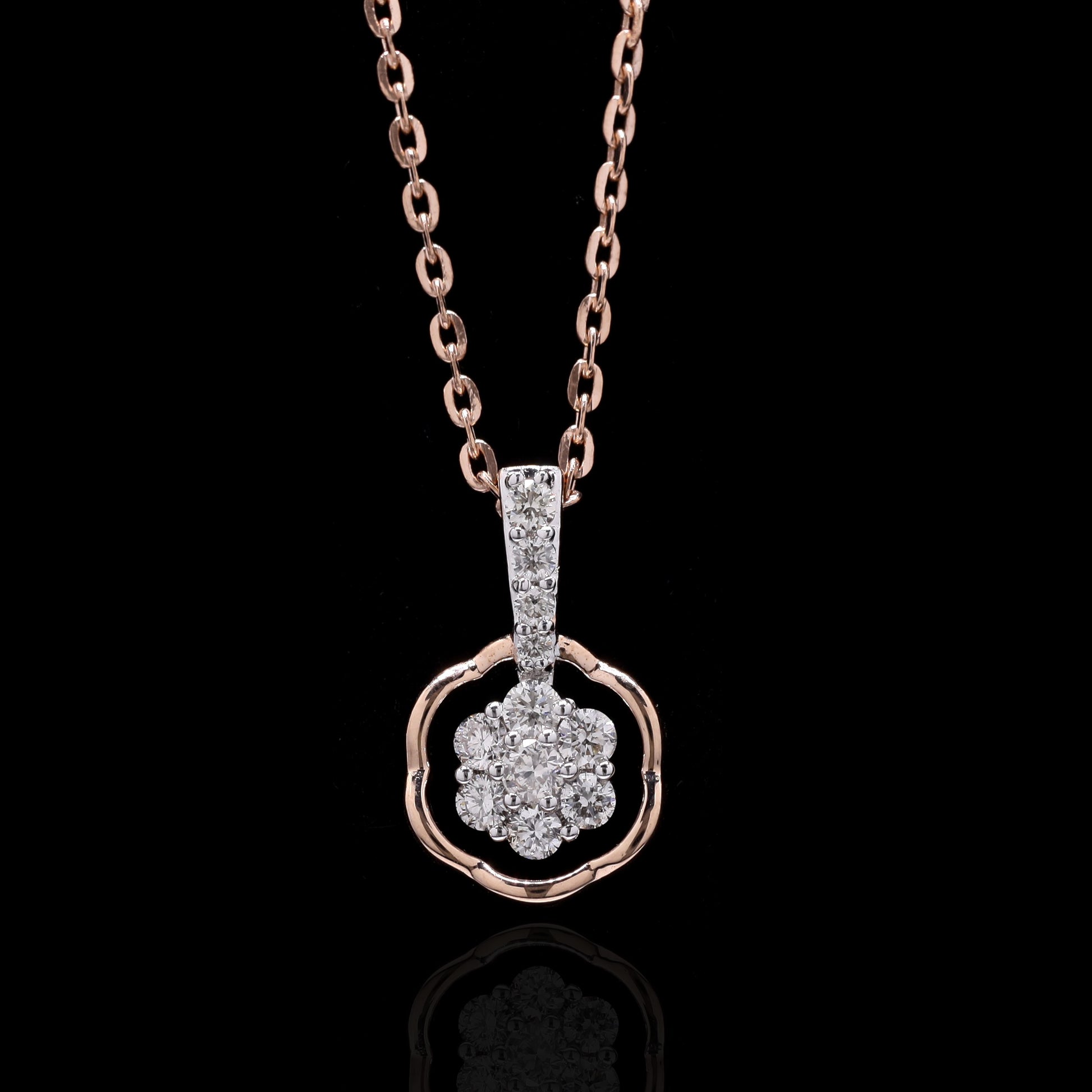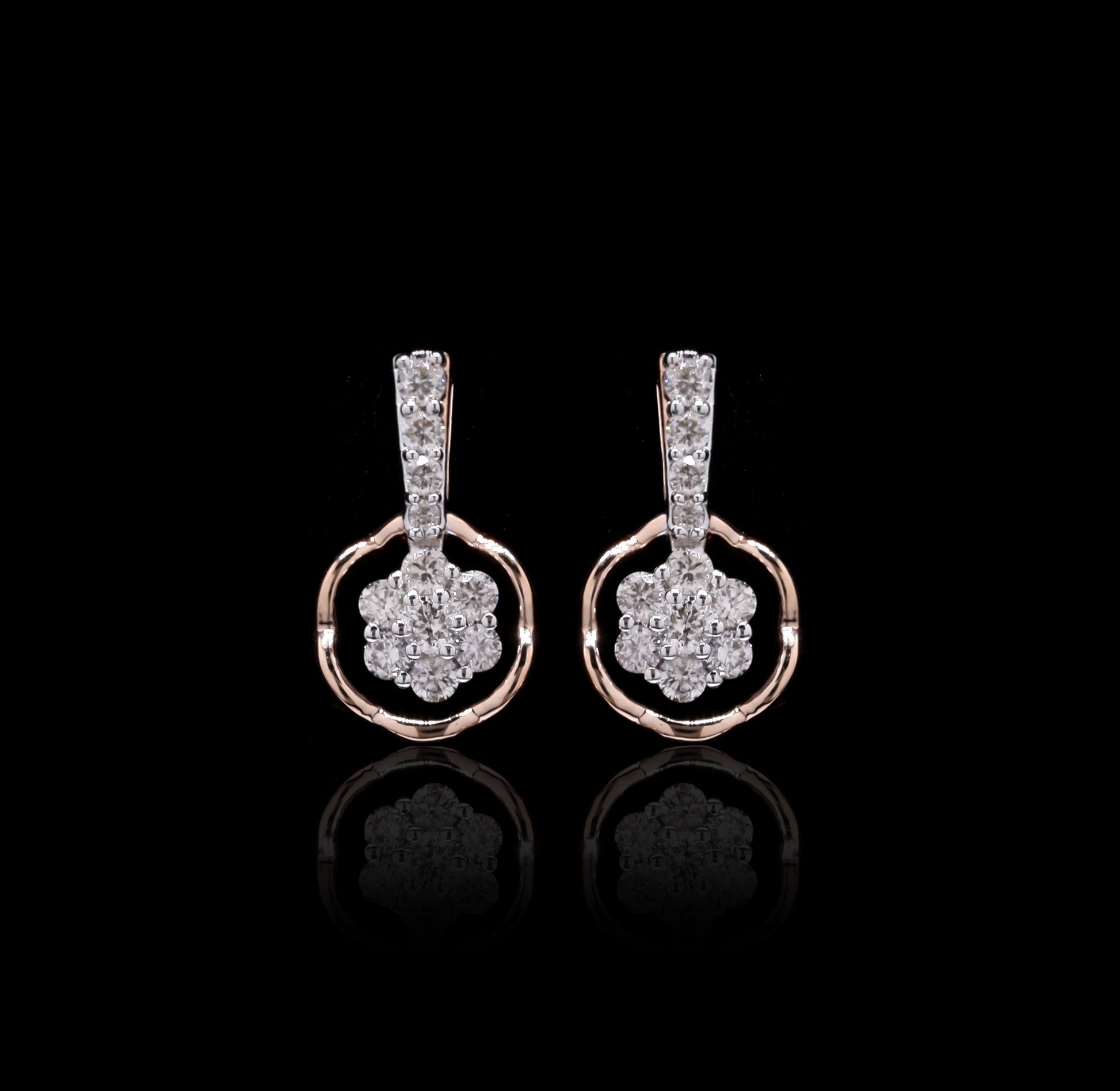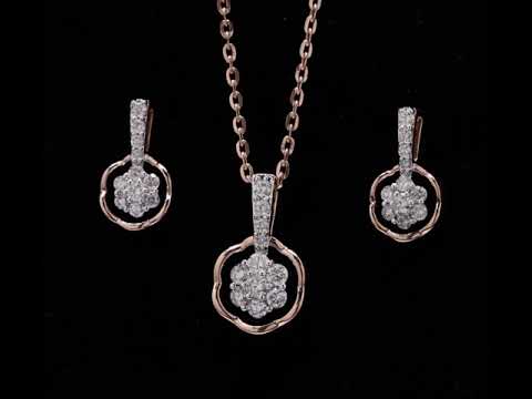 "Pendant and earring parure featuring floral diamond clusters in rose gold frames."