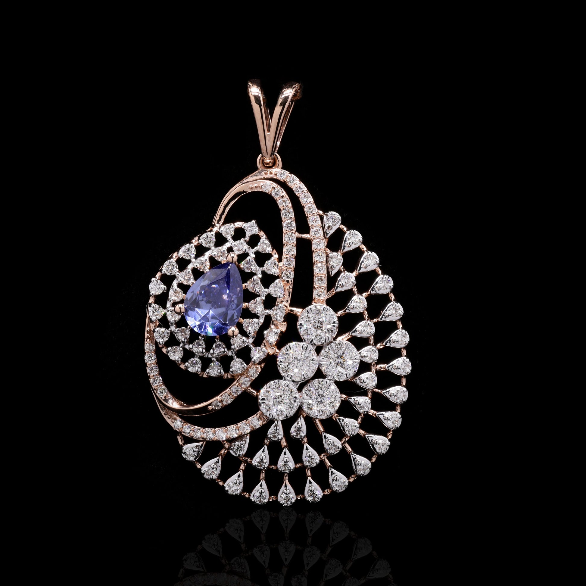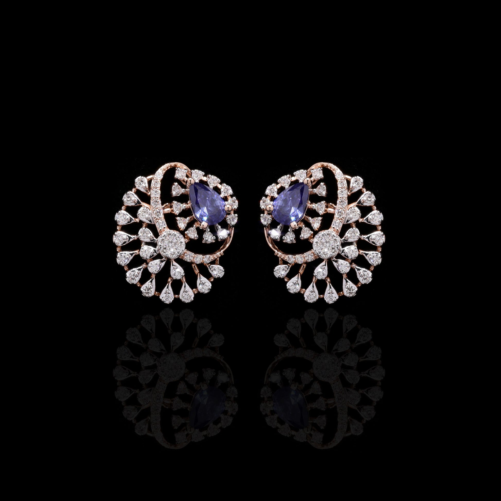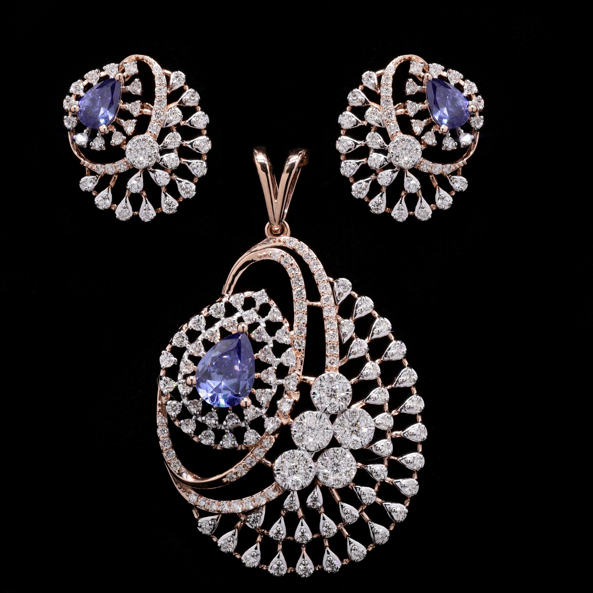 "Rose gold parure featuring tanzanite teardrops and diamond spray motifs."