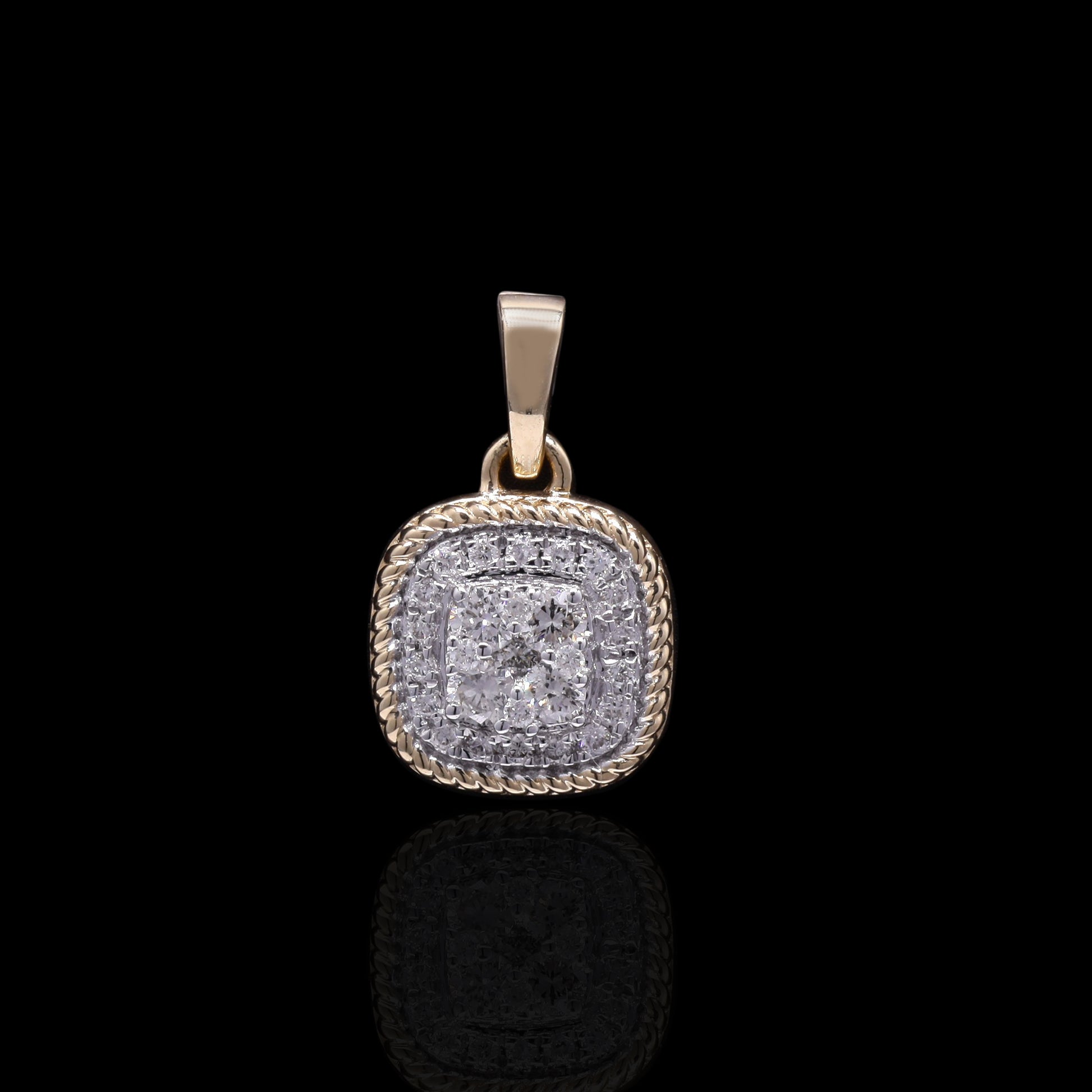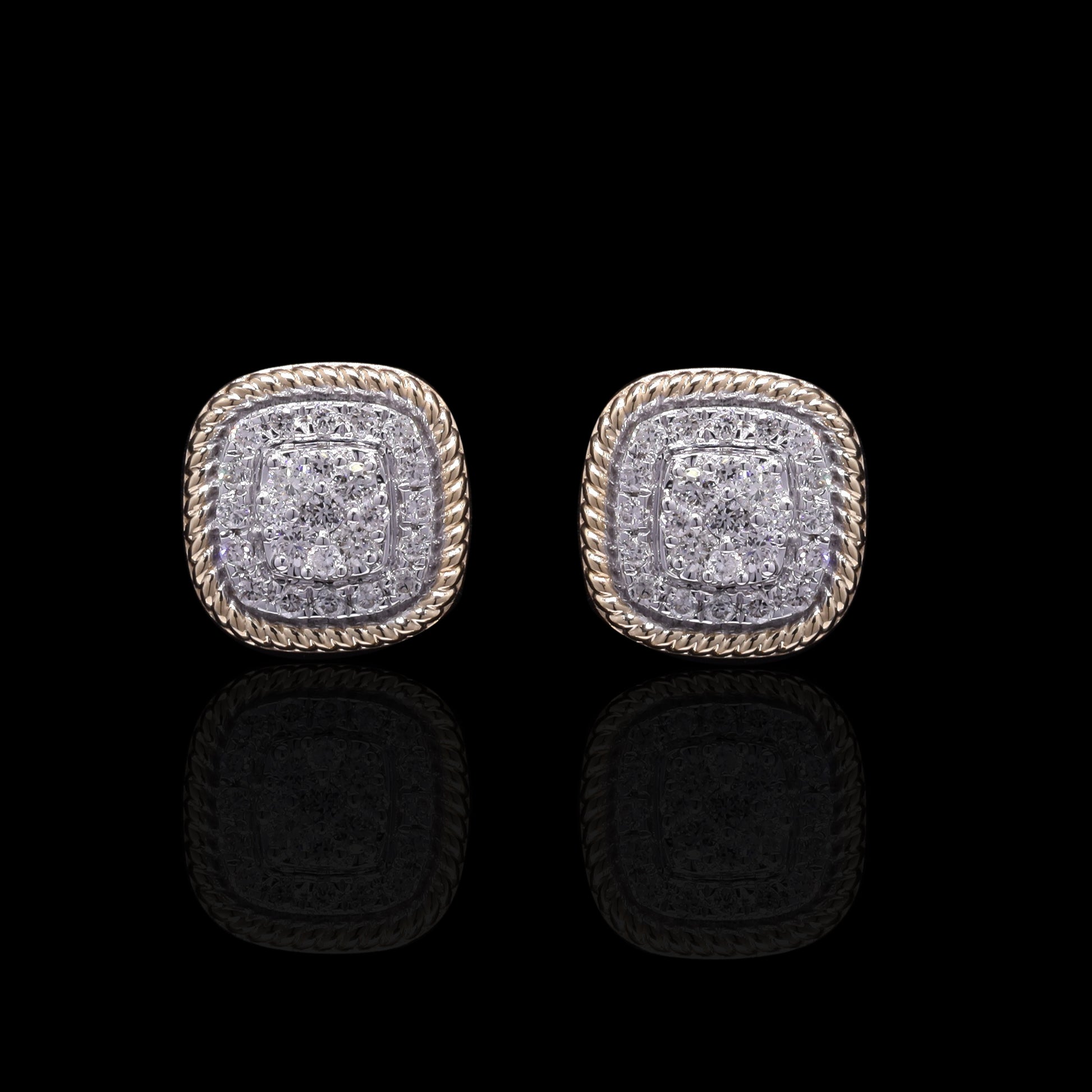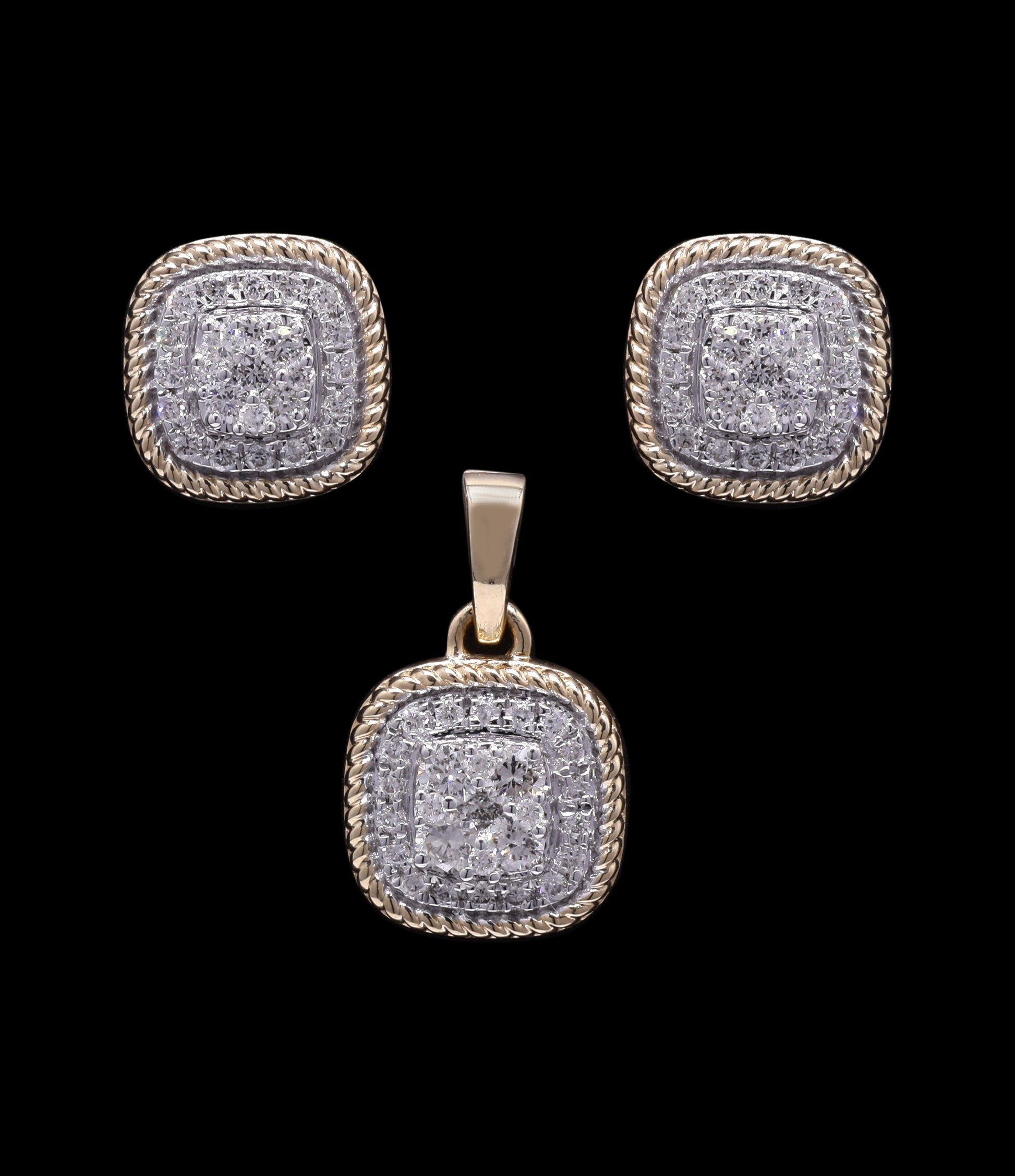 "Cushion-shaped diamond cluster parure with rope-textured yellow gold trim."