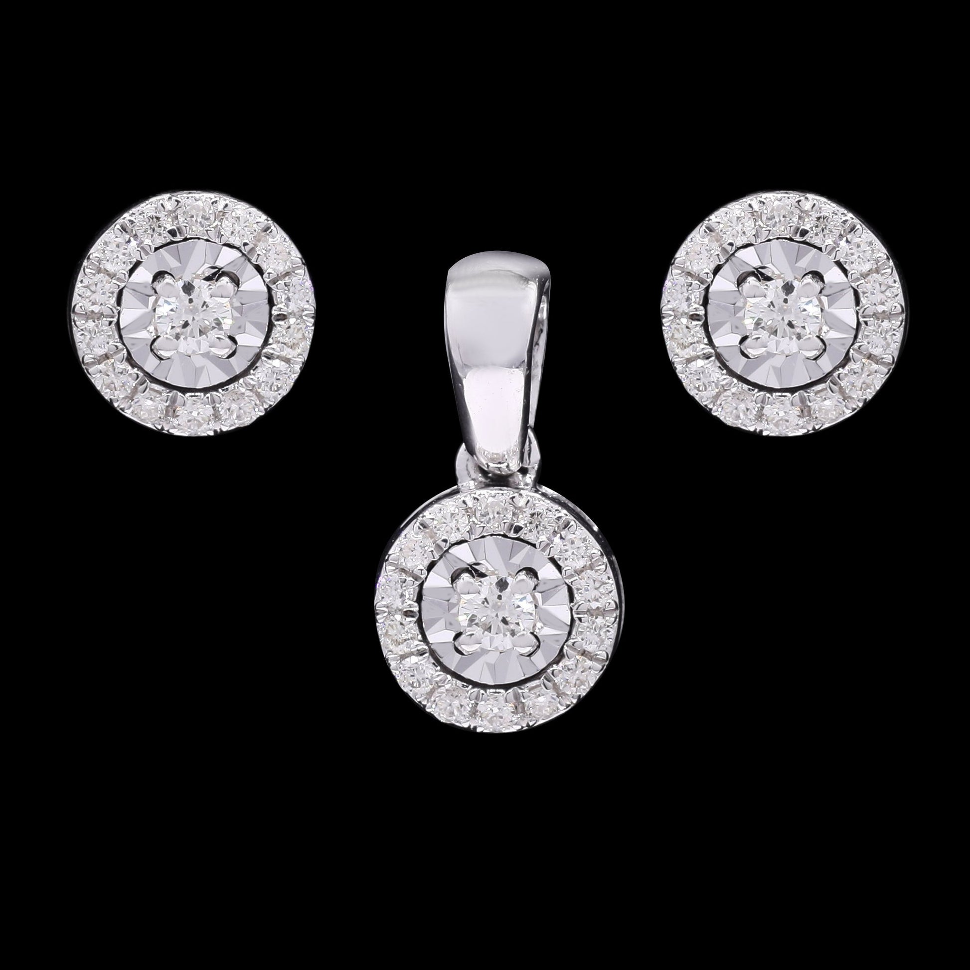 White gold halo cluster pendant and earring set with impeccable diamond setting.