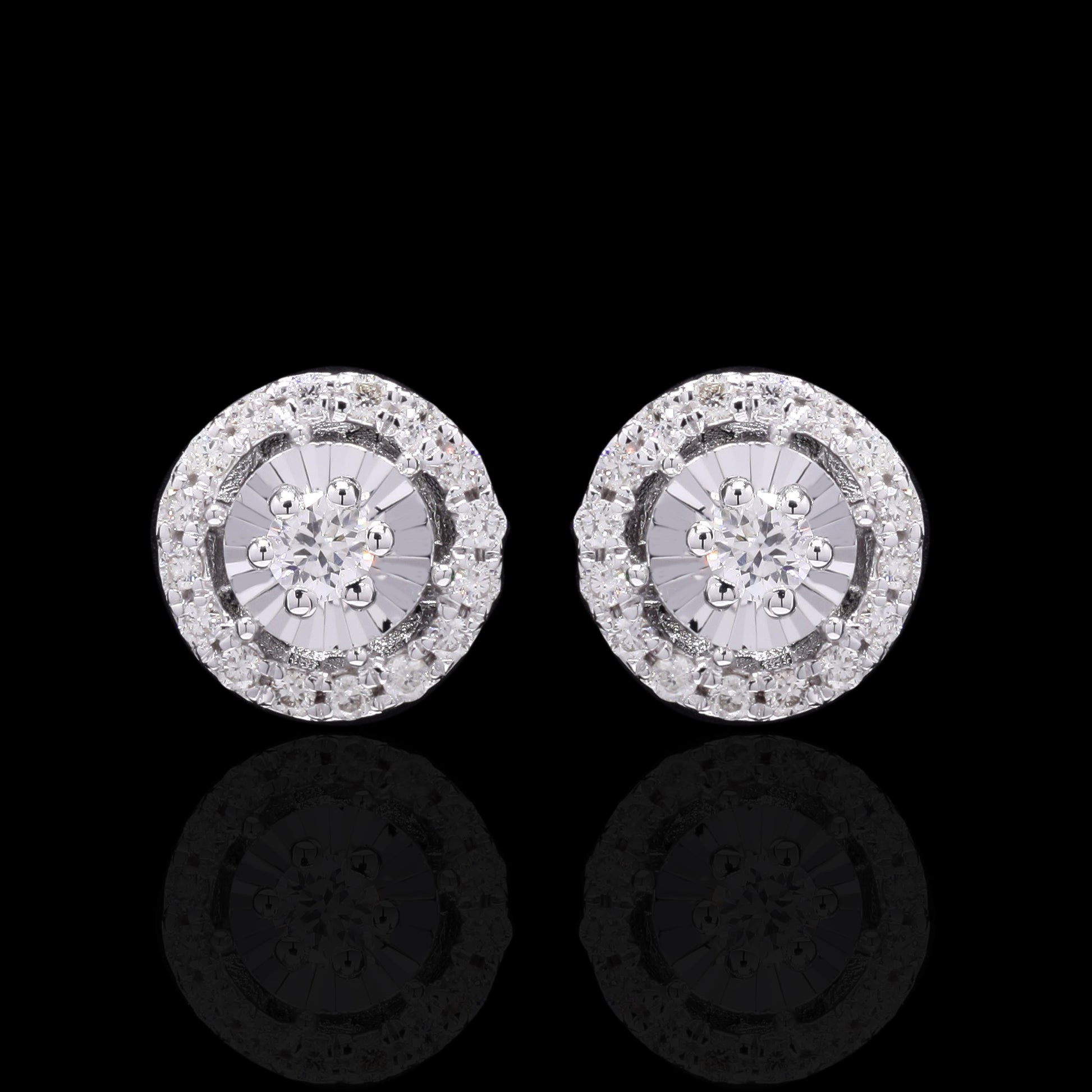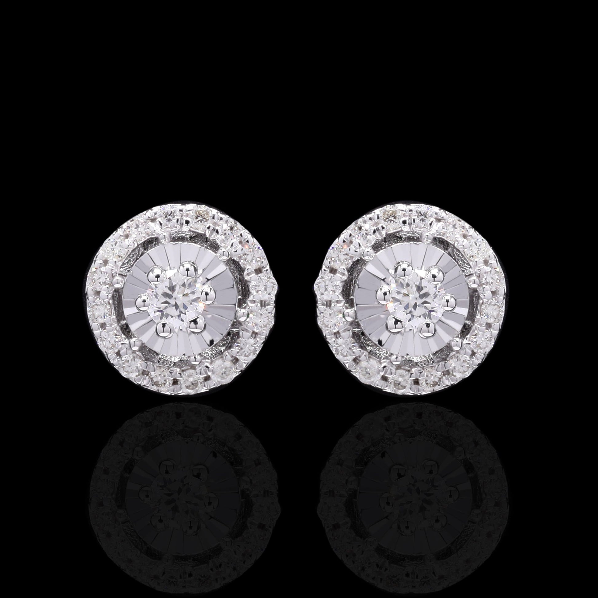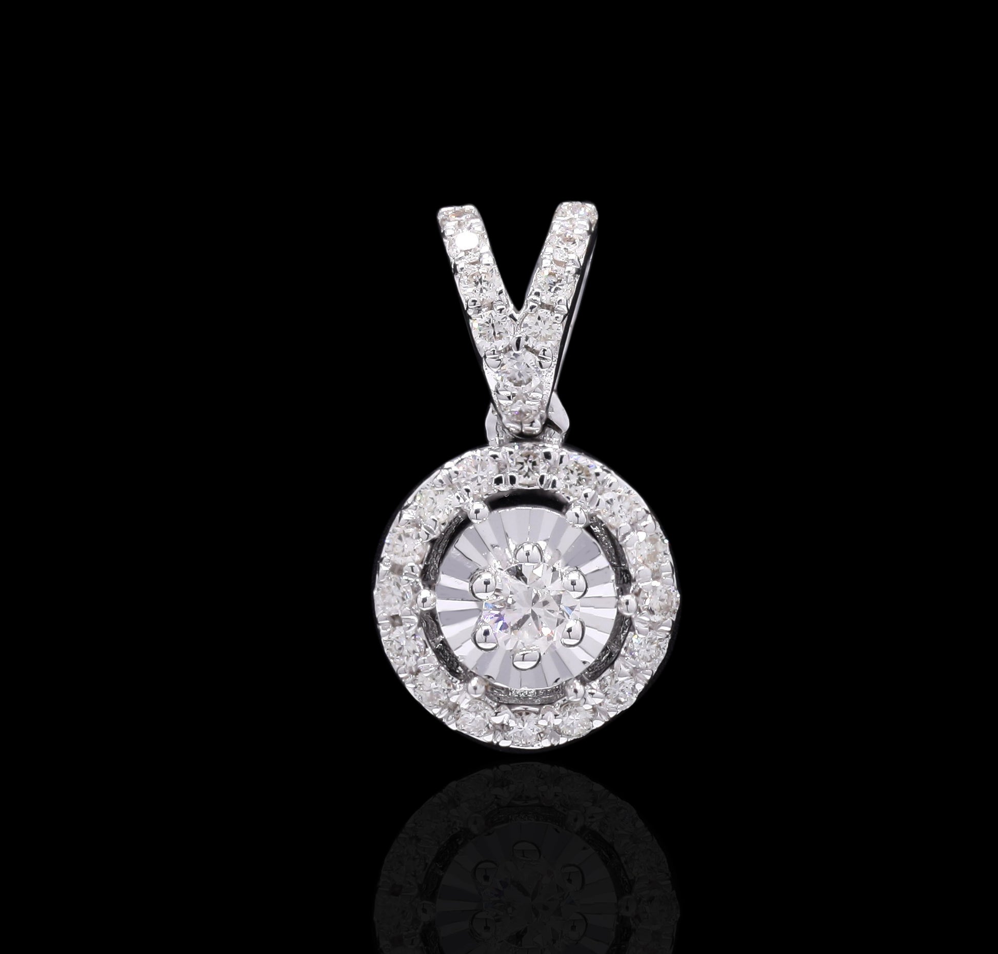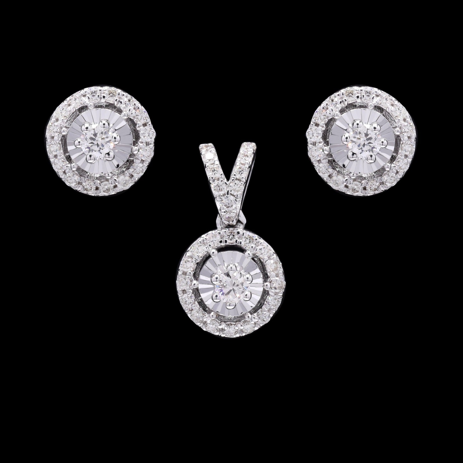 Dazzling white gold halo diamond pendant and stud earrings set, exuding brilliance.
