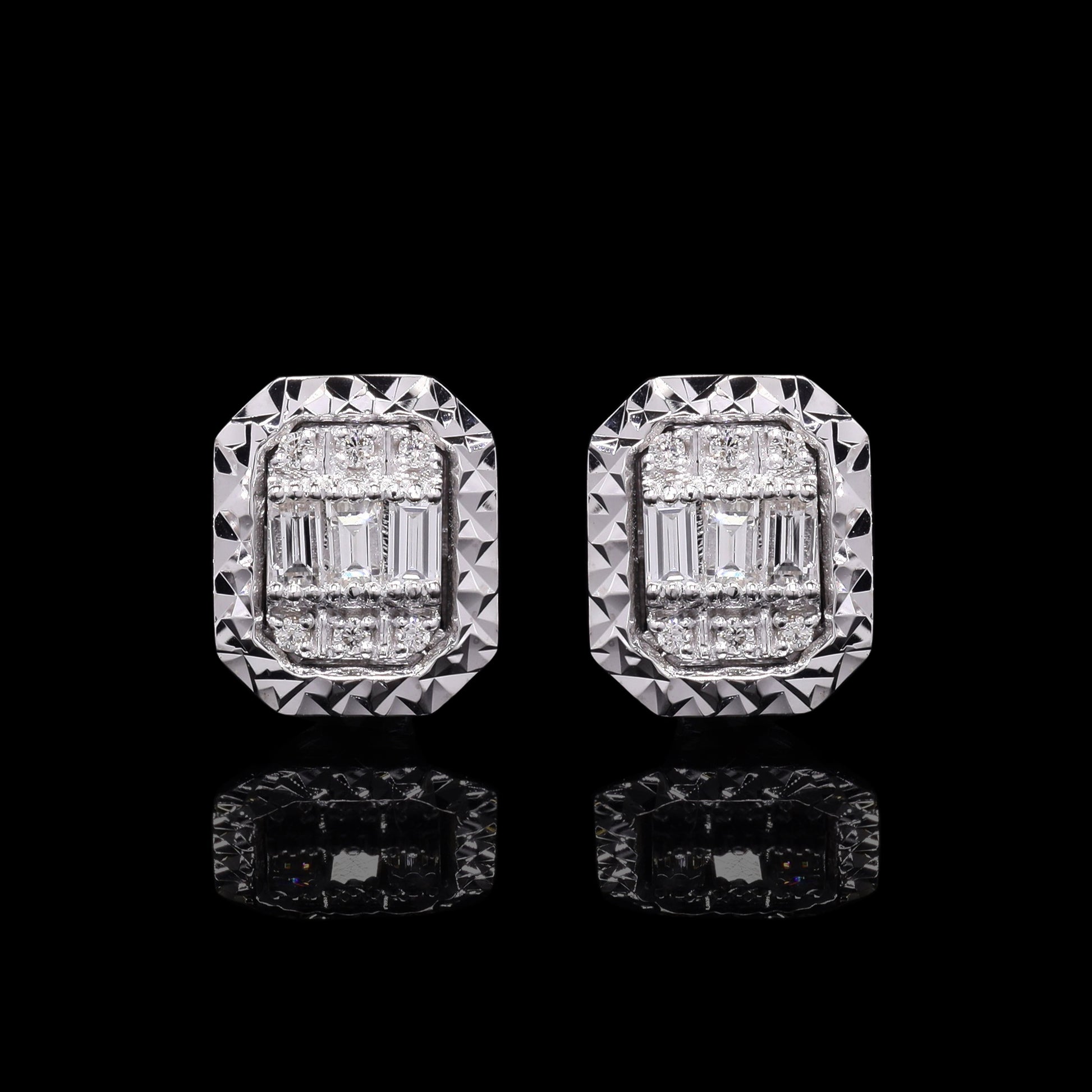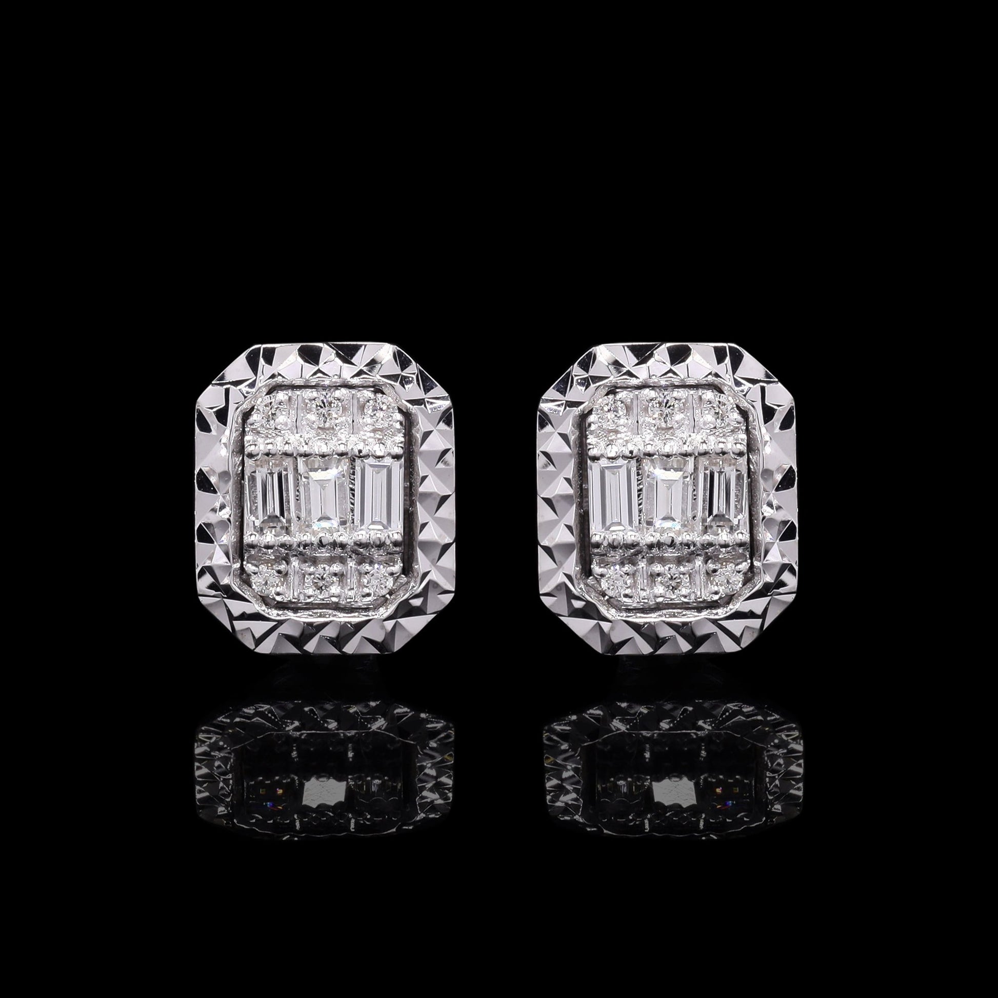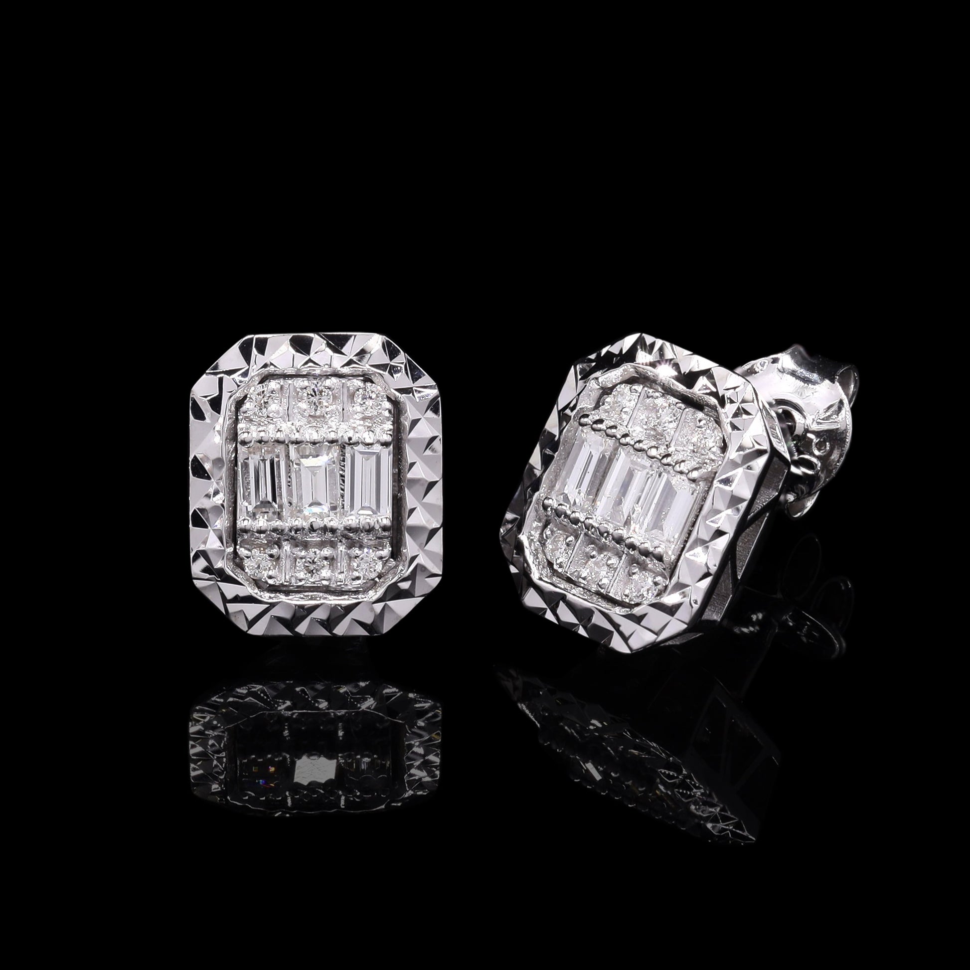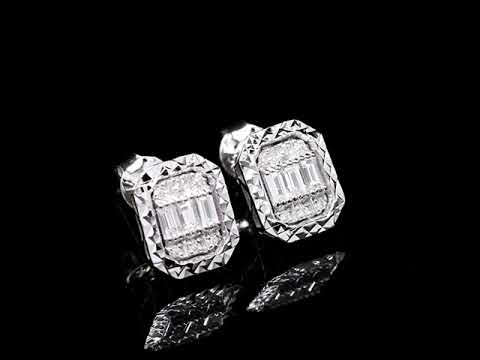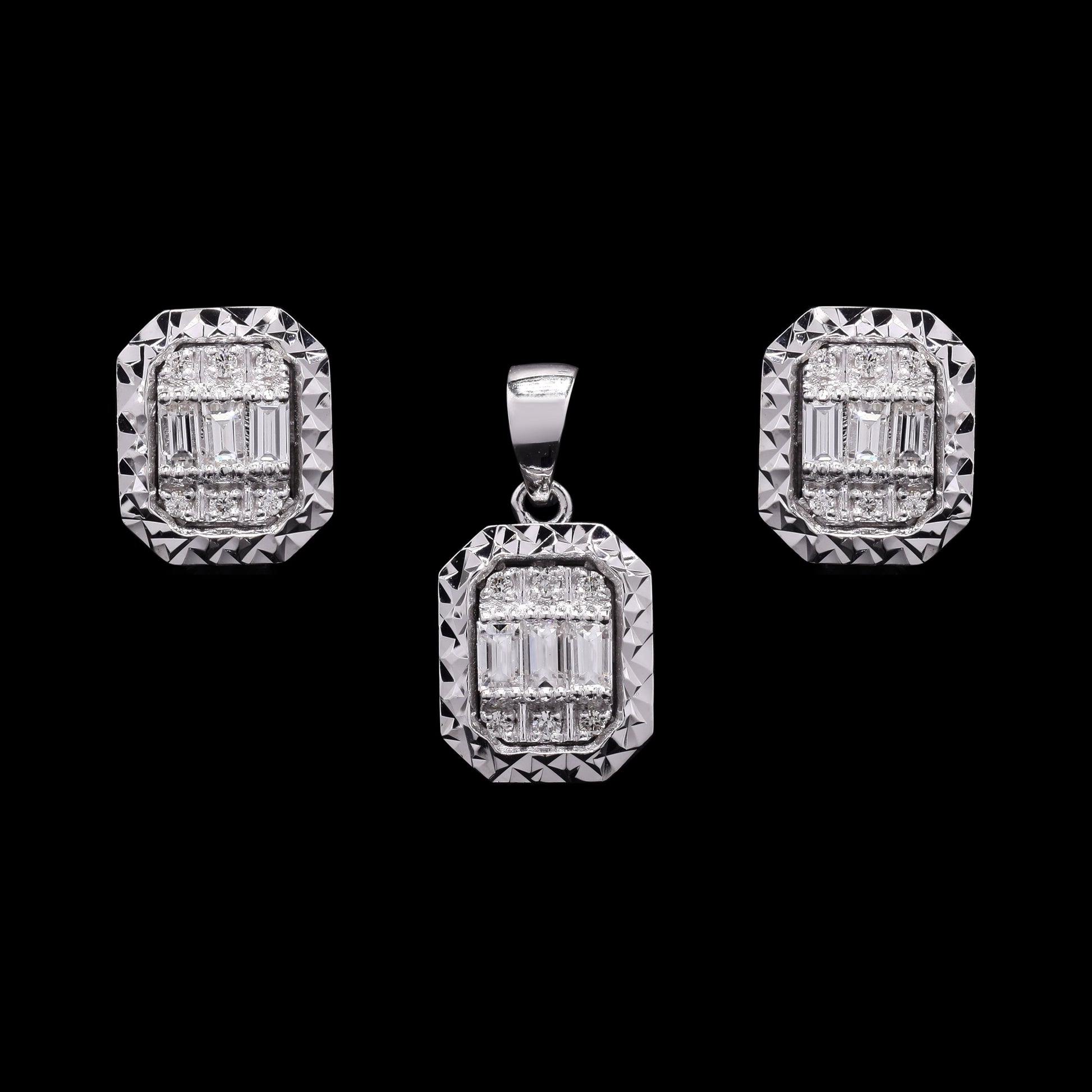 White gold pendant and earring set showcasing baguette diamonds within a textured frame.