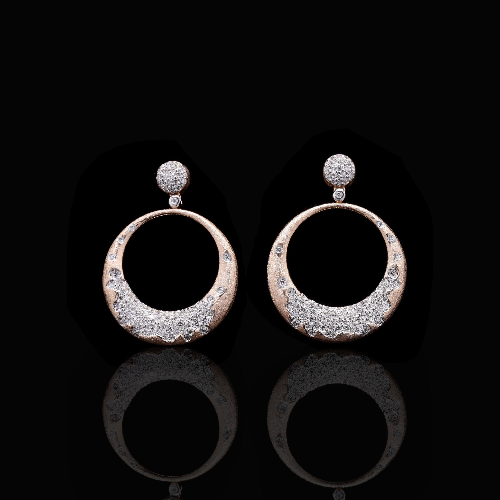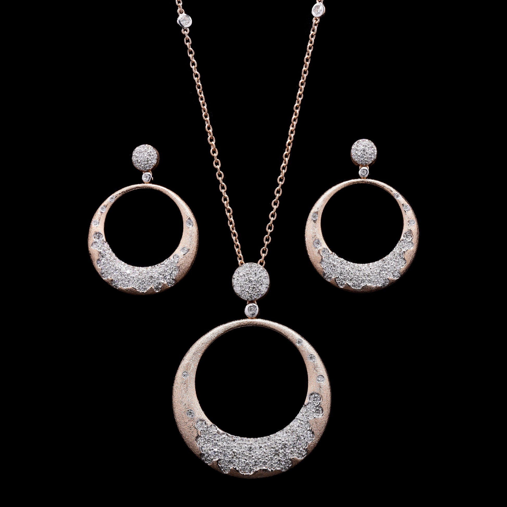 Striking rose gold pendant and earring set with textured surfaces and pavé diamond accents.