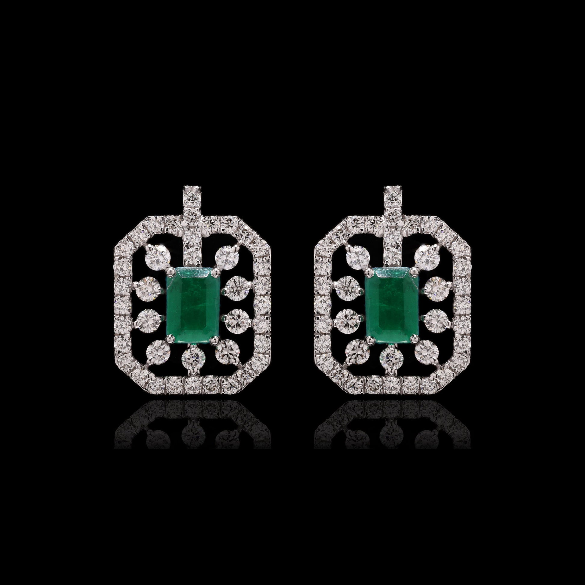 Opulent emerald-cut emerald studs framed by intricate diamond pavé and circular halos.