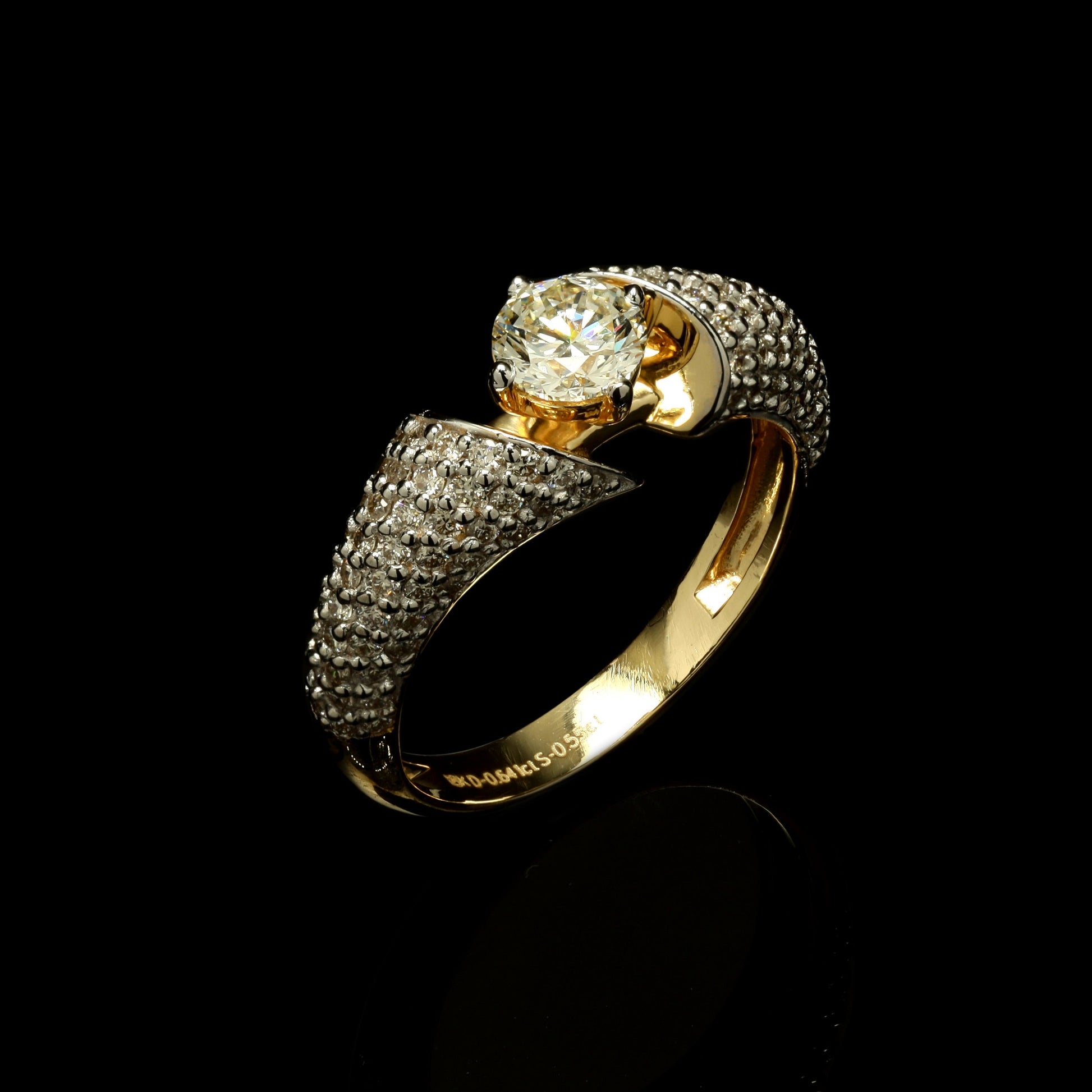 Textured, pavé-set, bypass yellow-gold diamond ring.