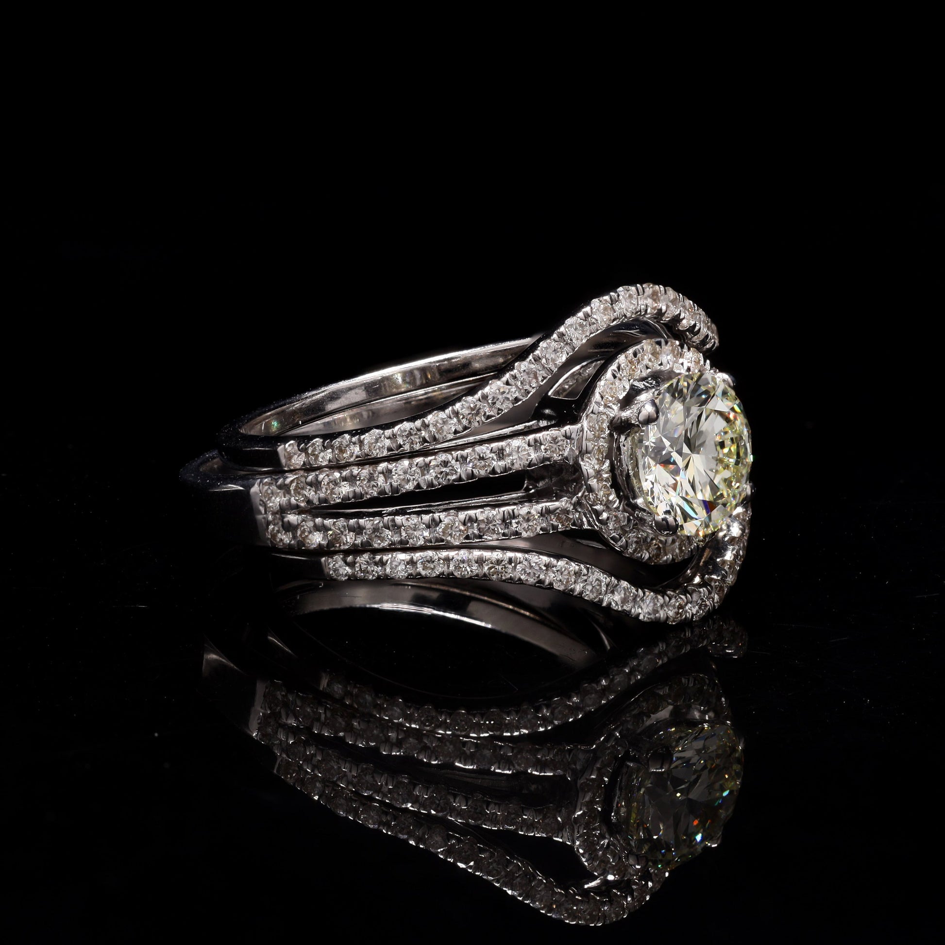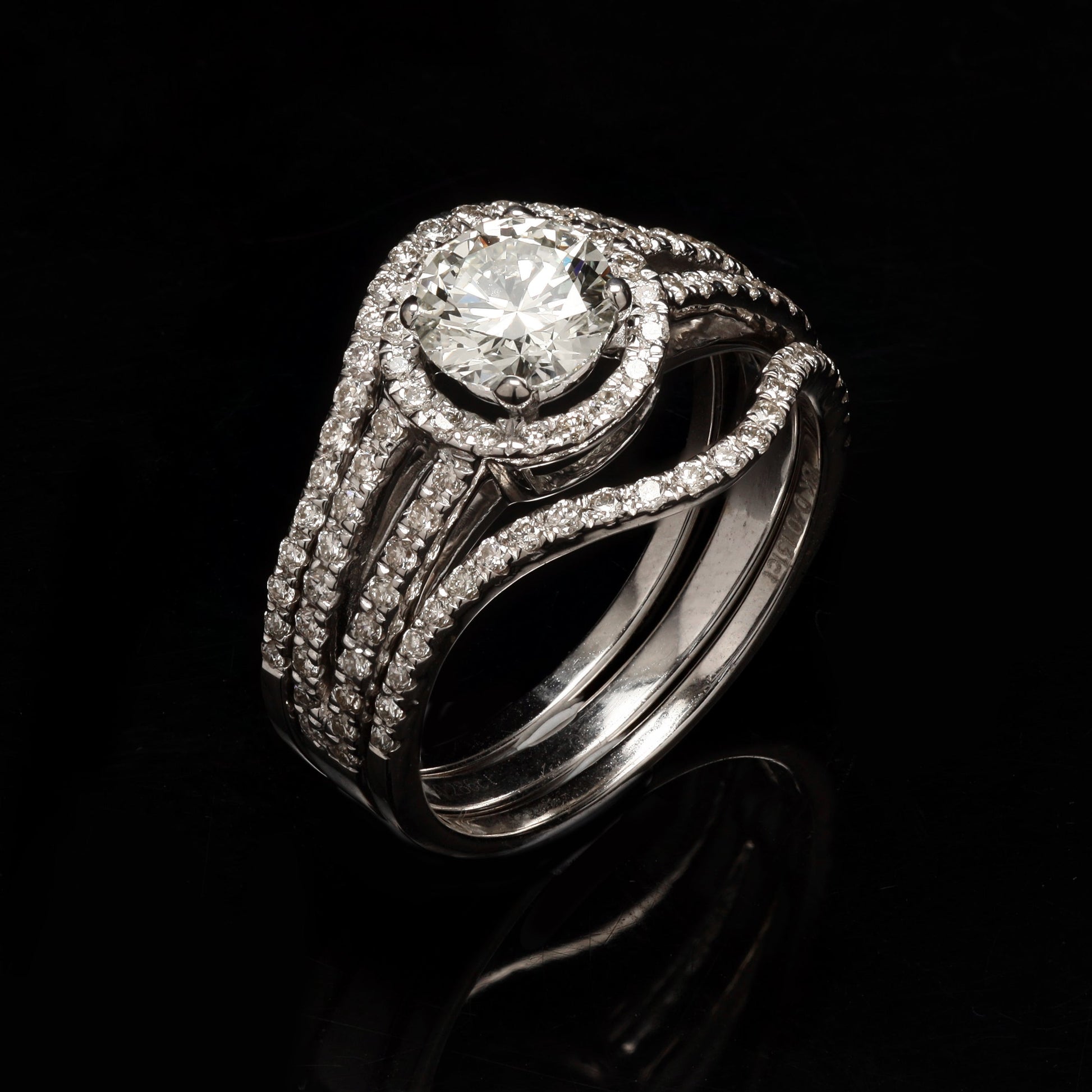 Brilliant, three-band diamond halo ring set; opulent.