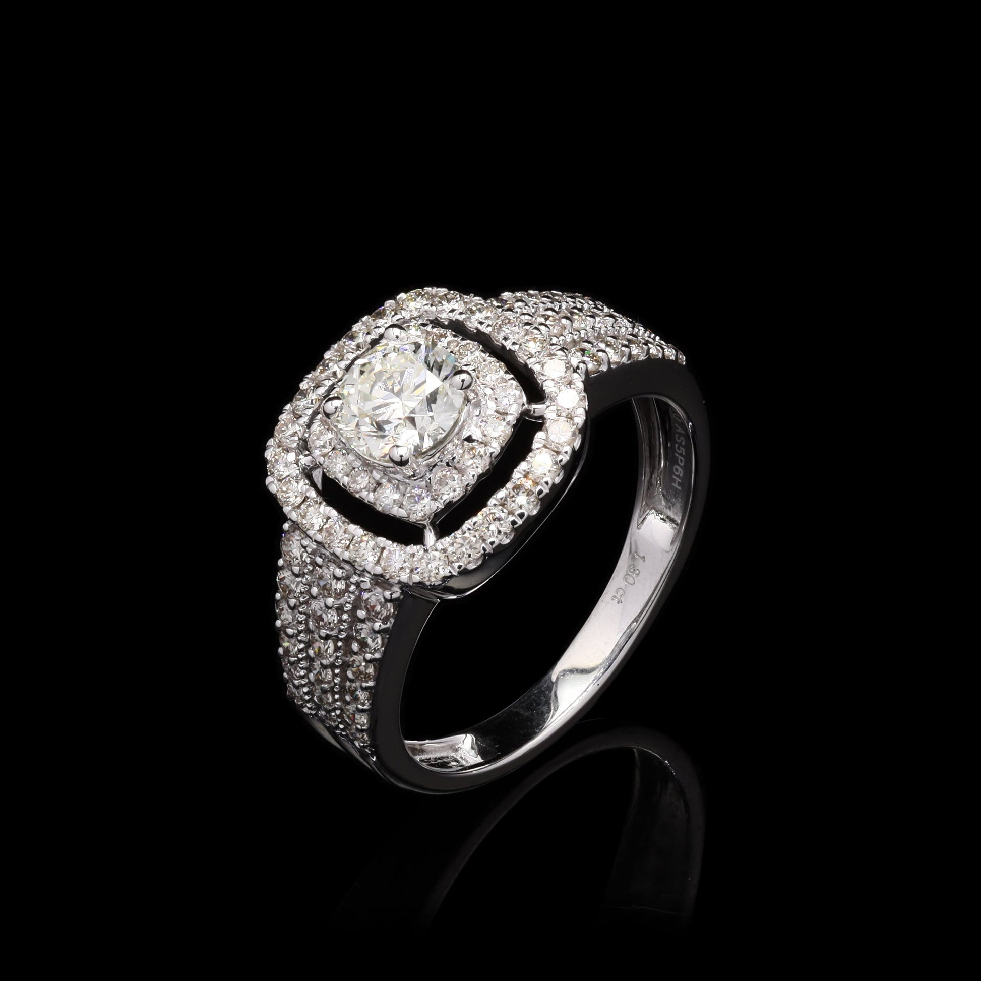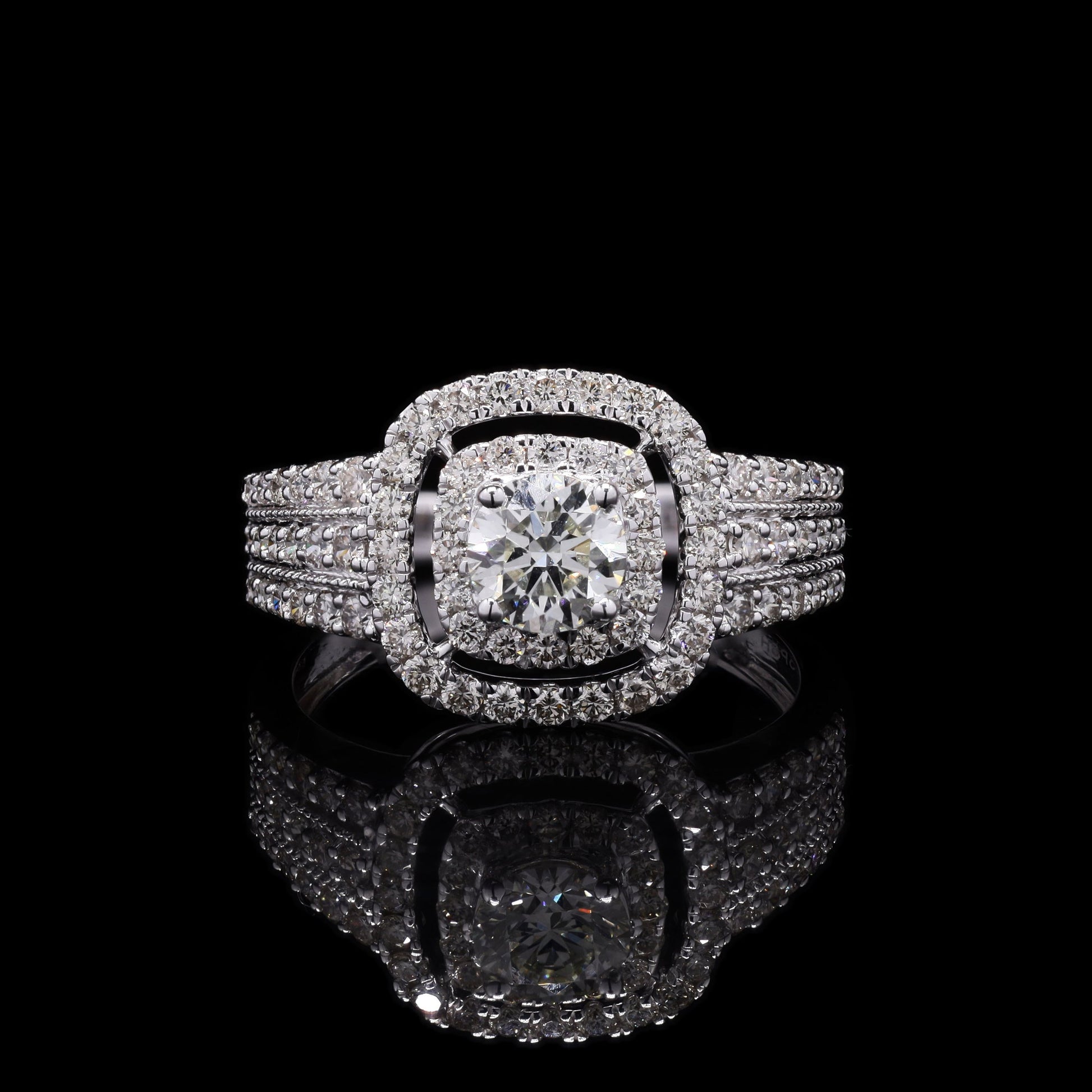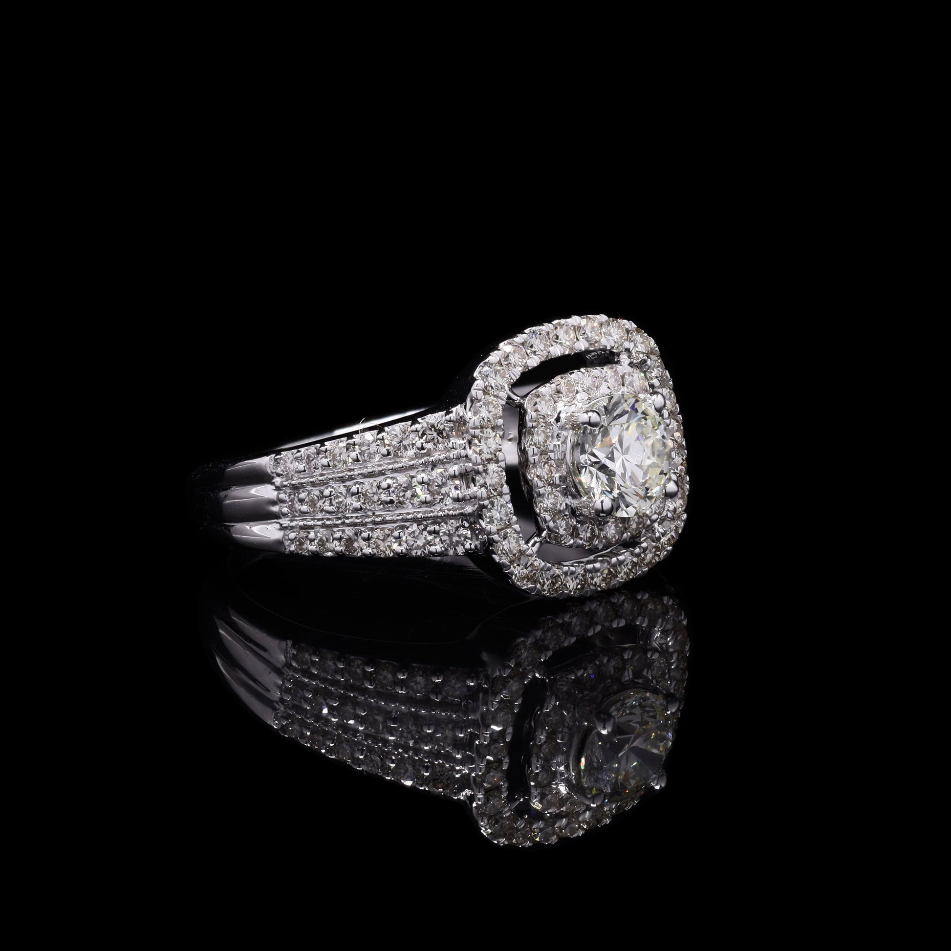 Cushion-cut diamond with a double halo and pavé shoulders.