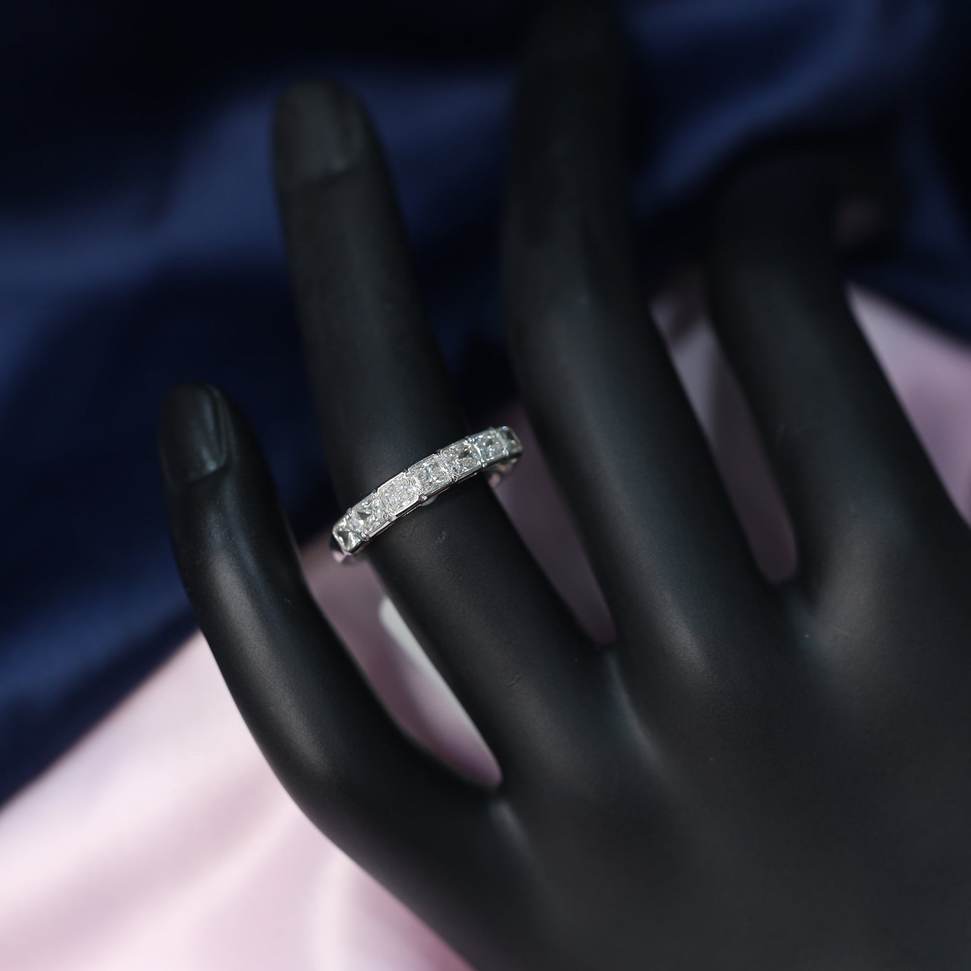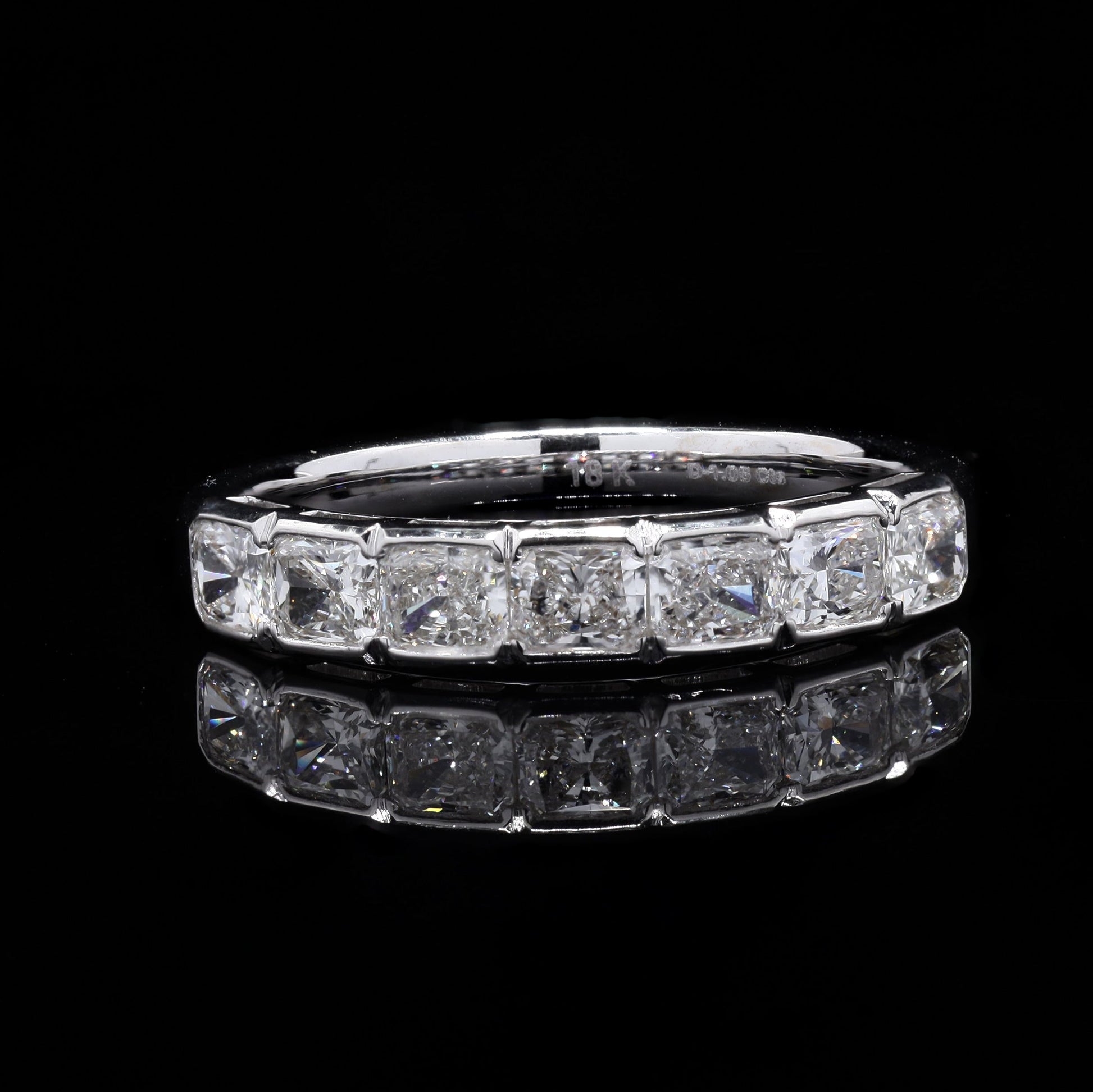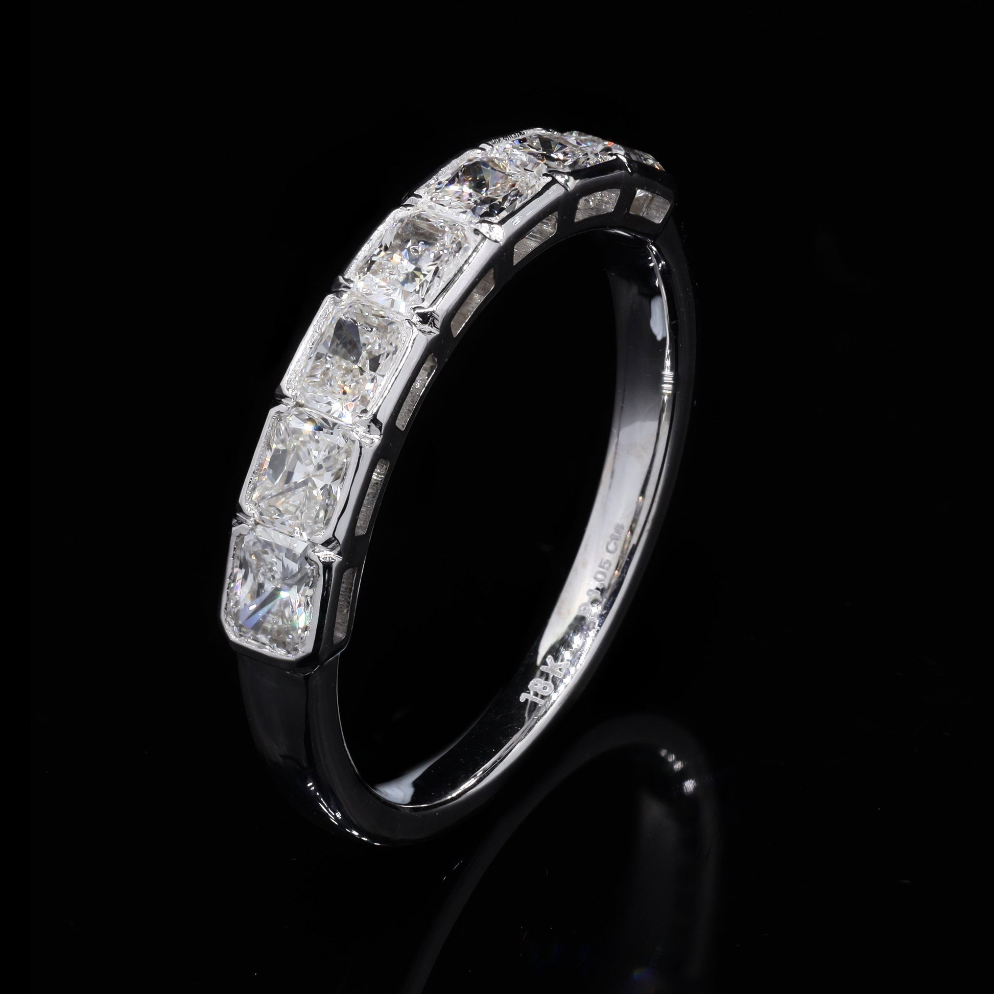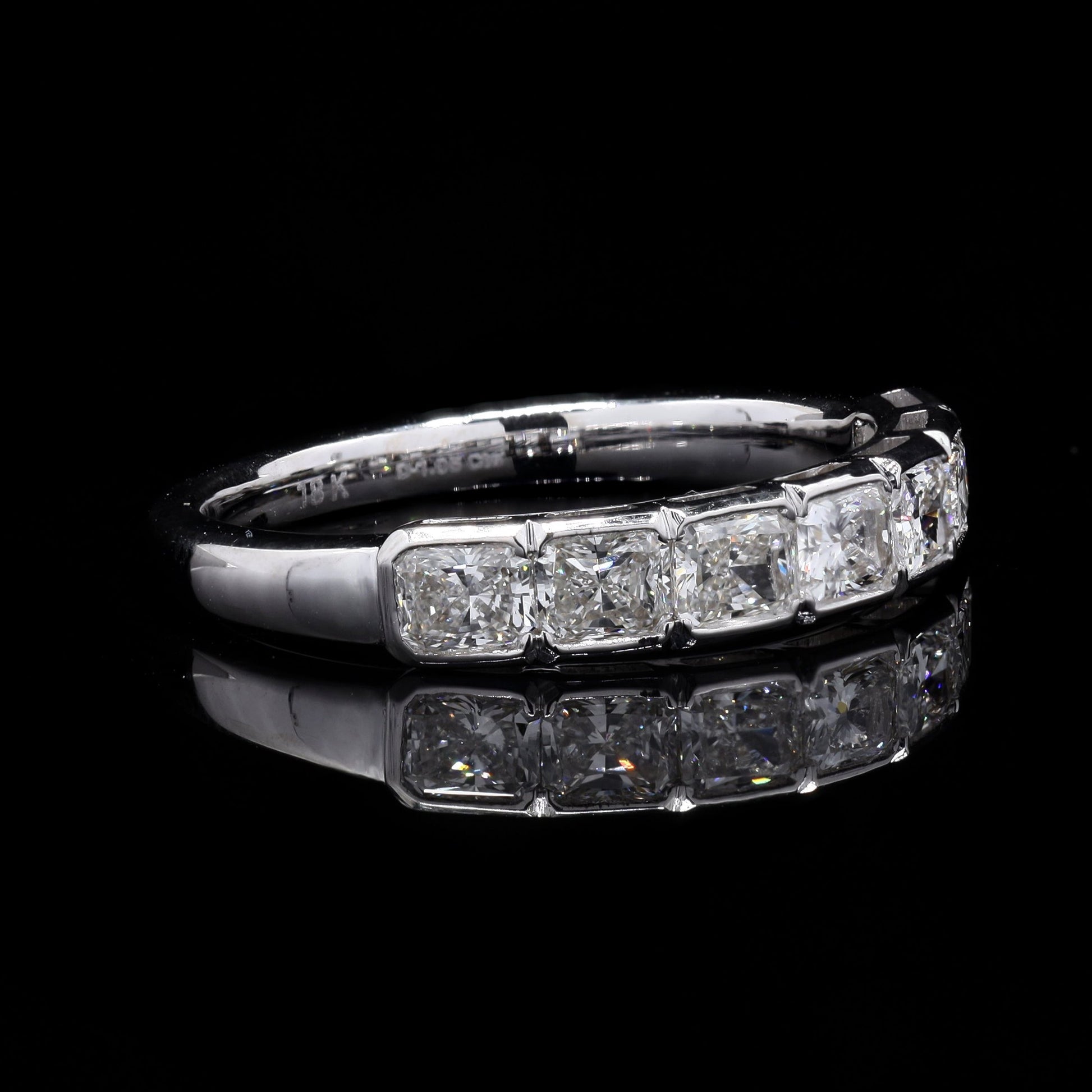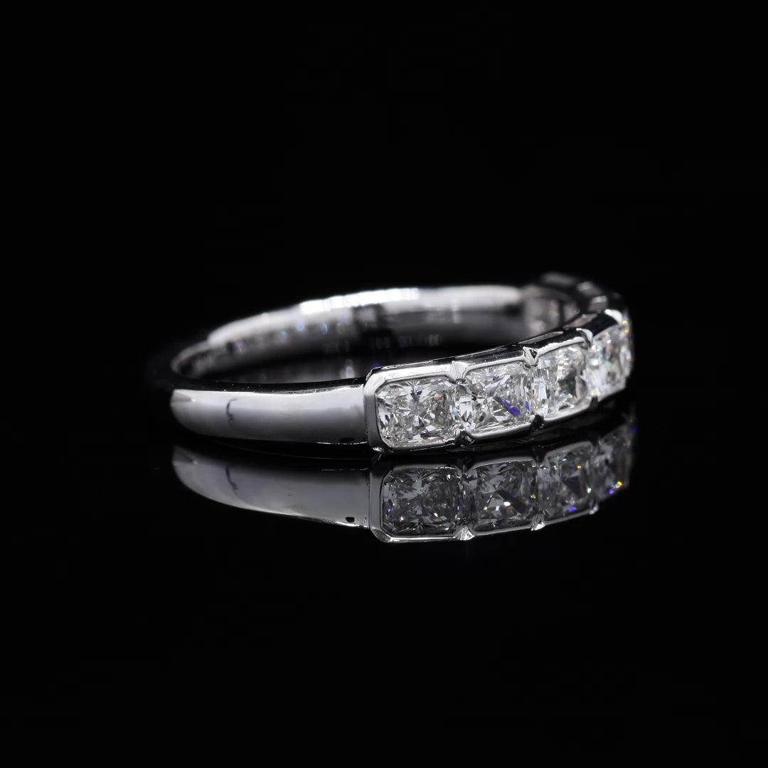 Cushion-cut diamonds in a half-eternity white gold bezel setting.