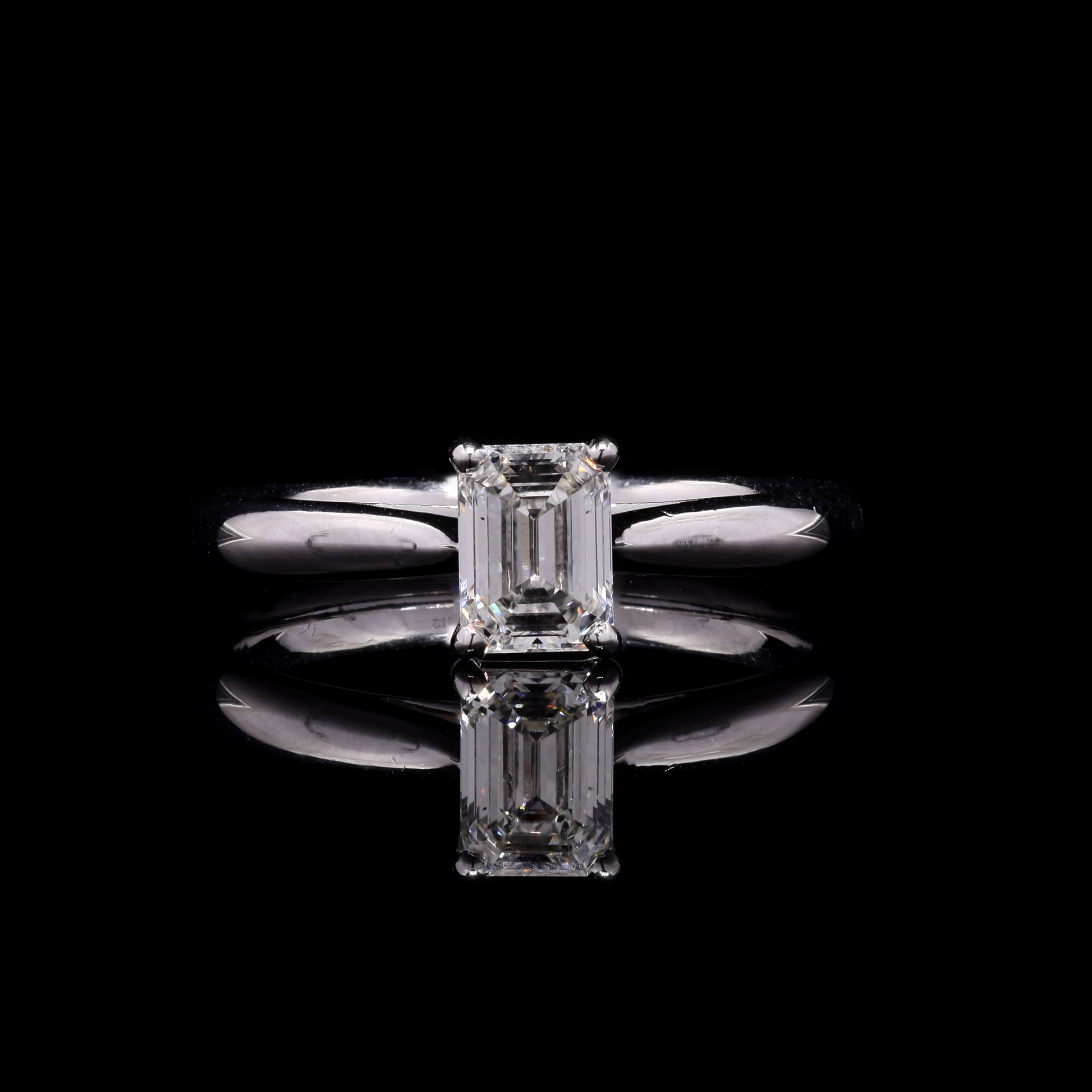 White gold solitaire ring with emerald-cut diamond.