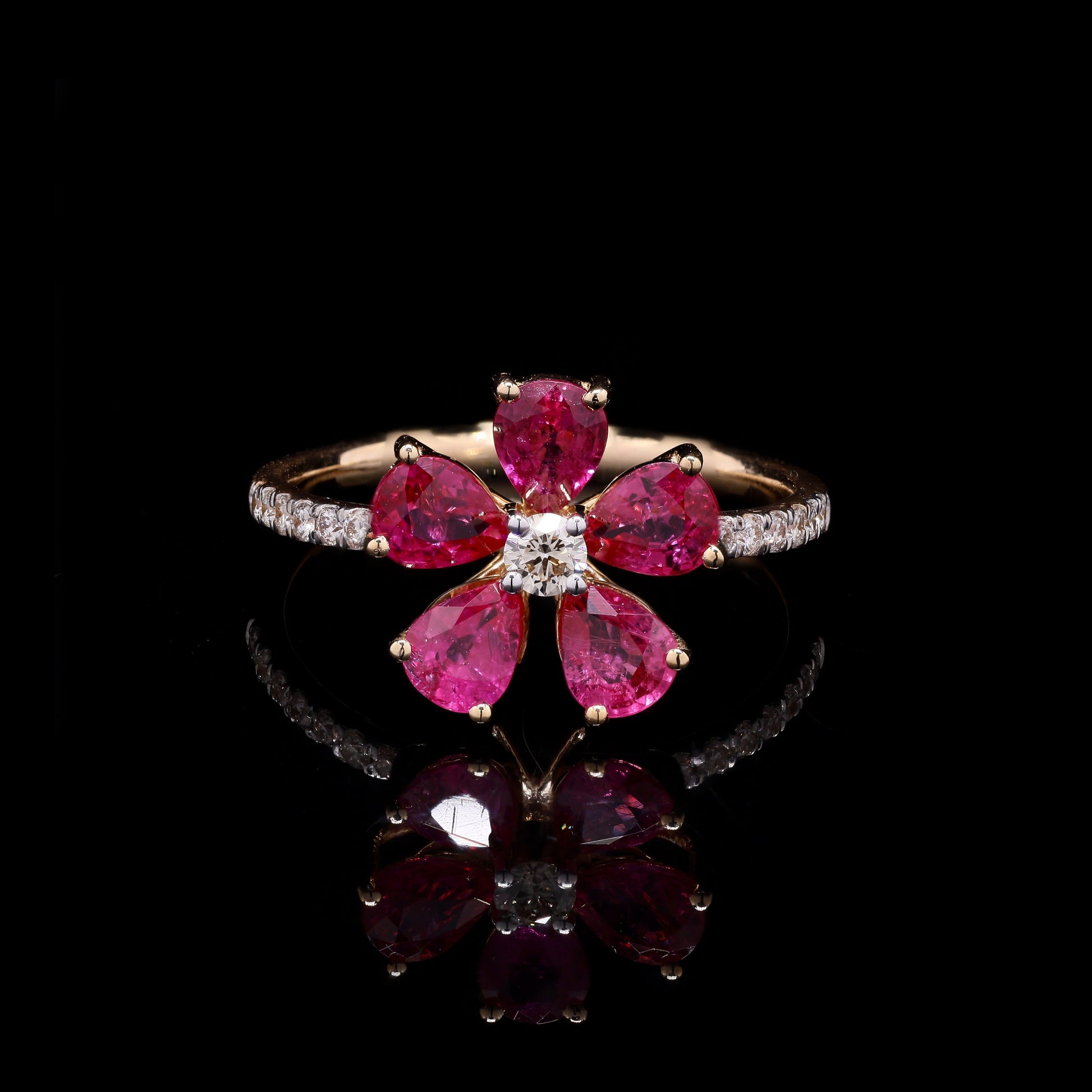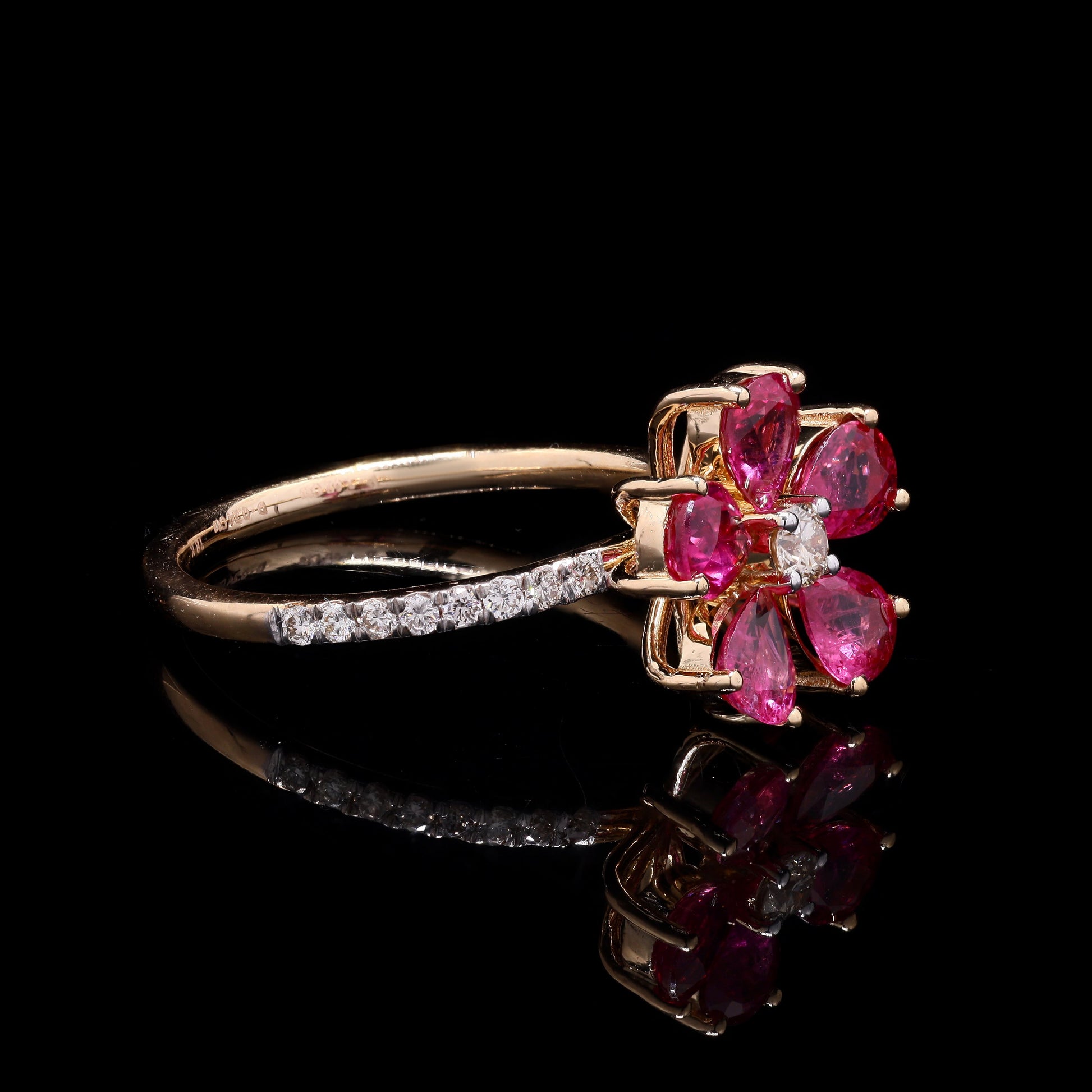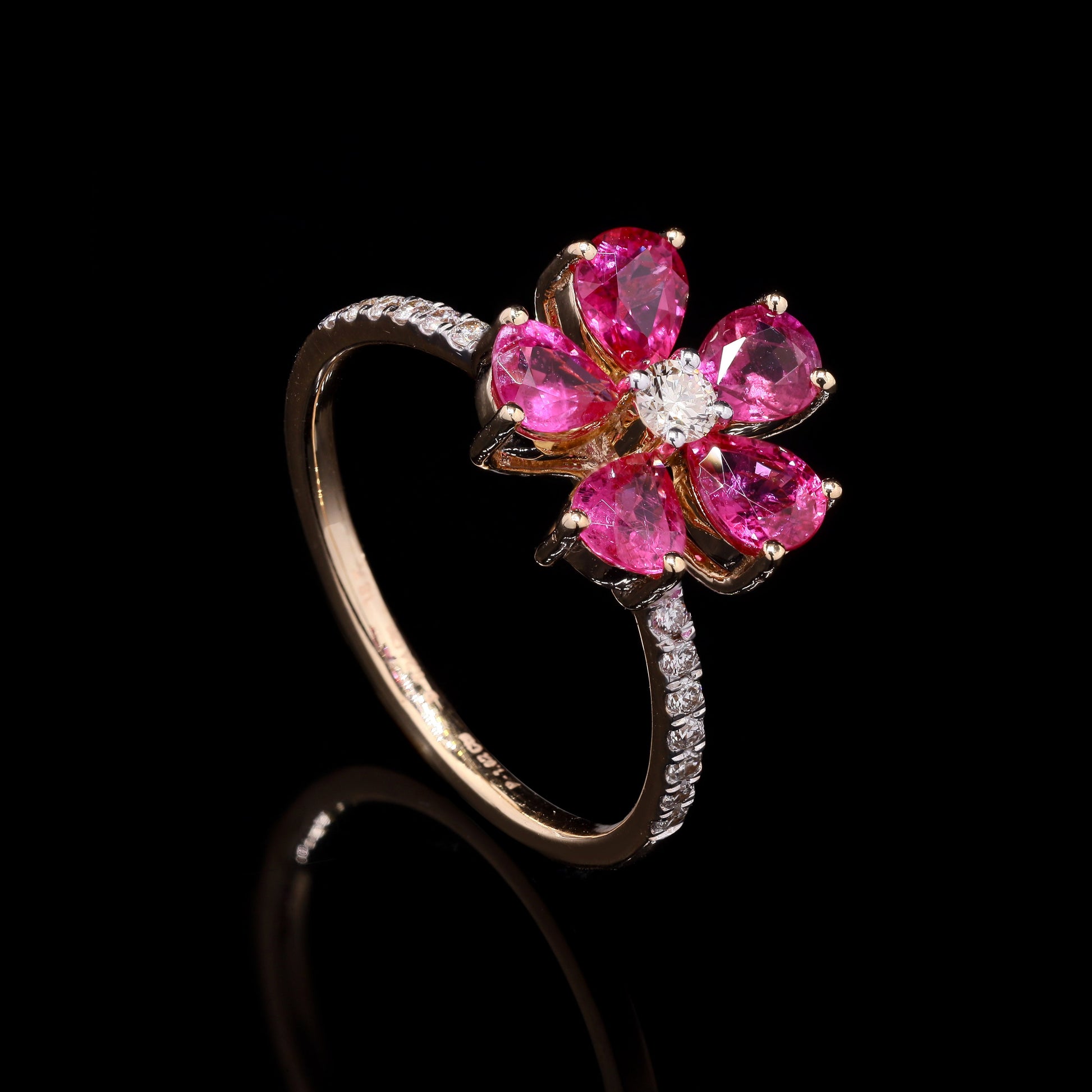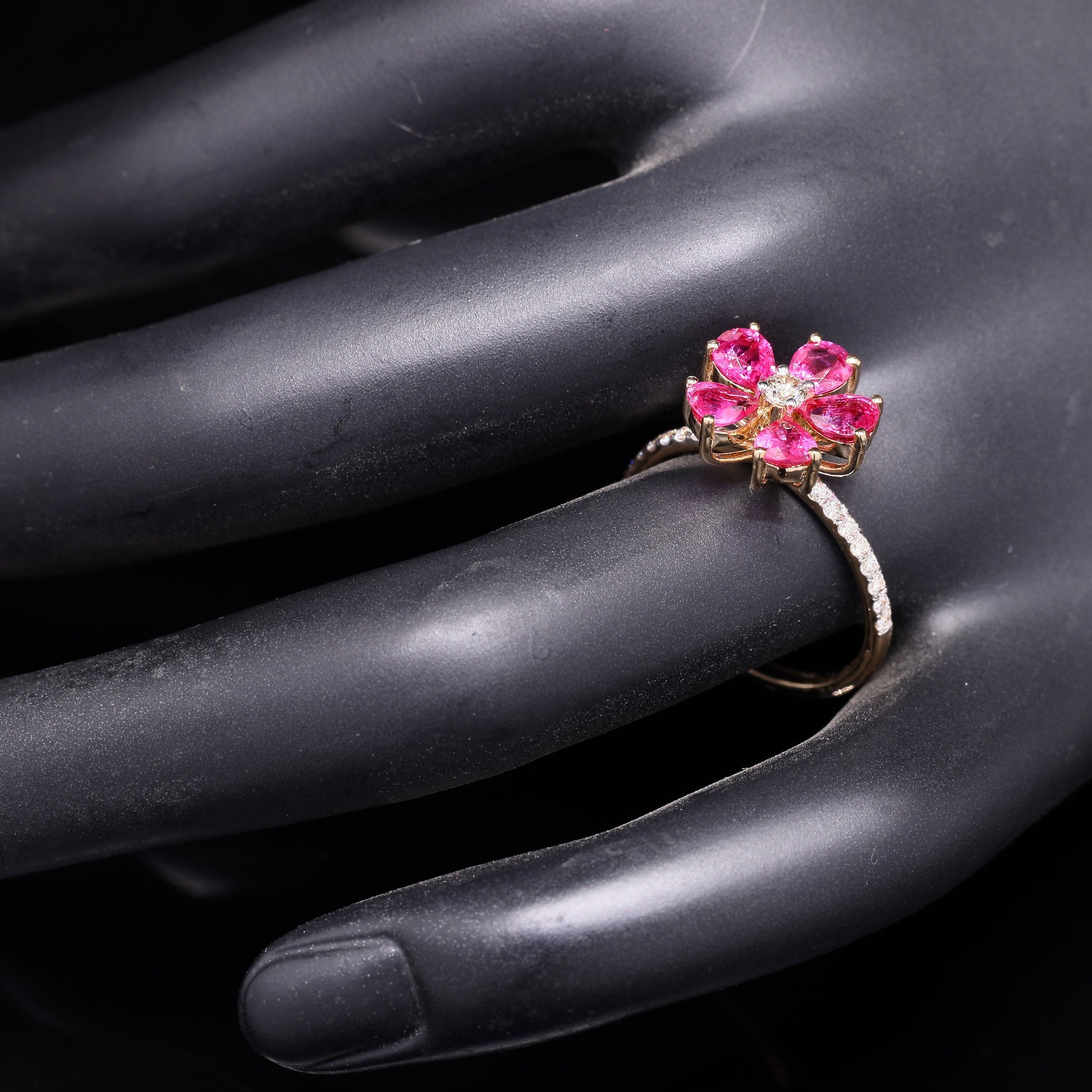 A gold ring with a flower cluster of pink gems and a pavé band.